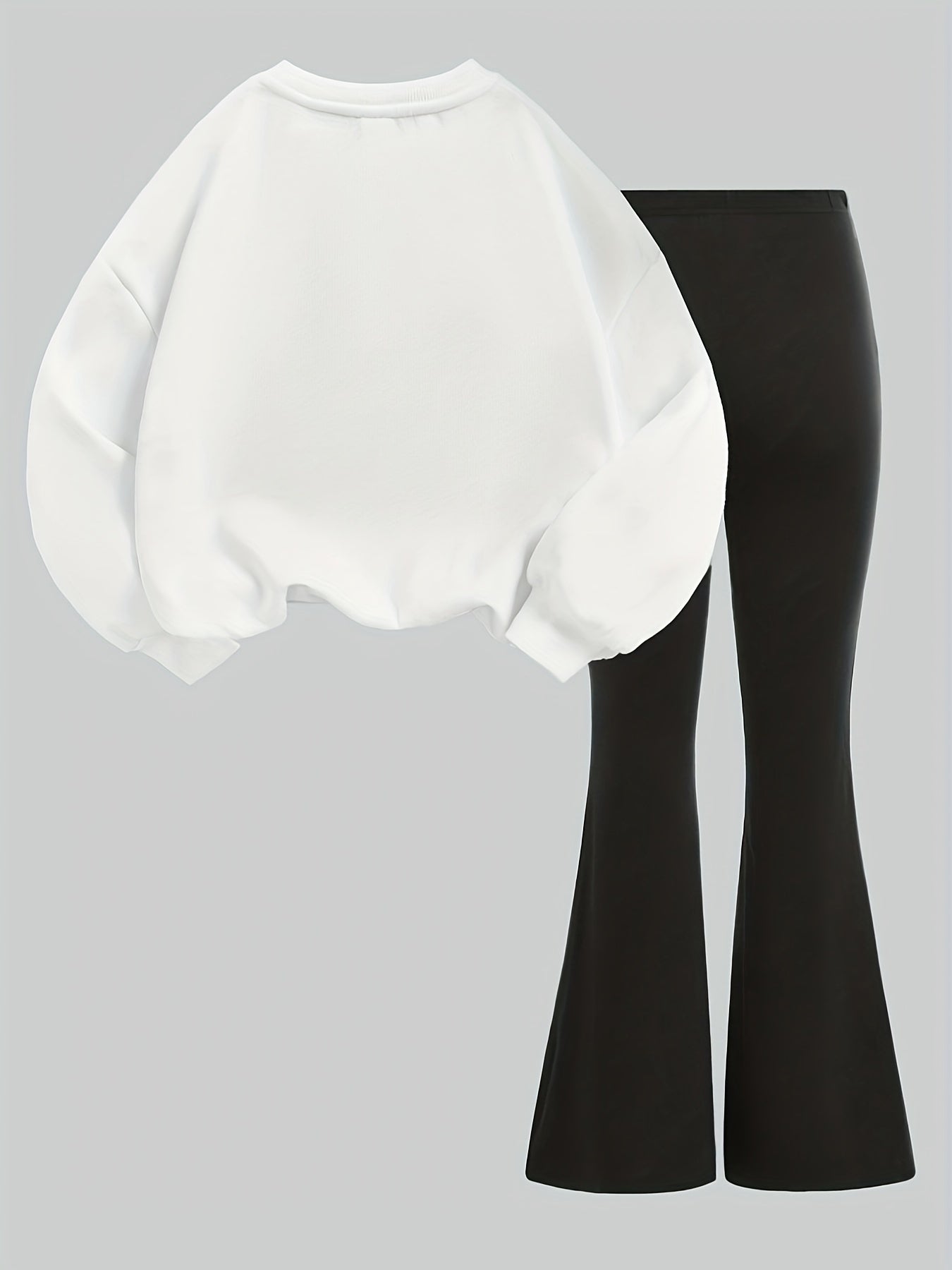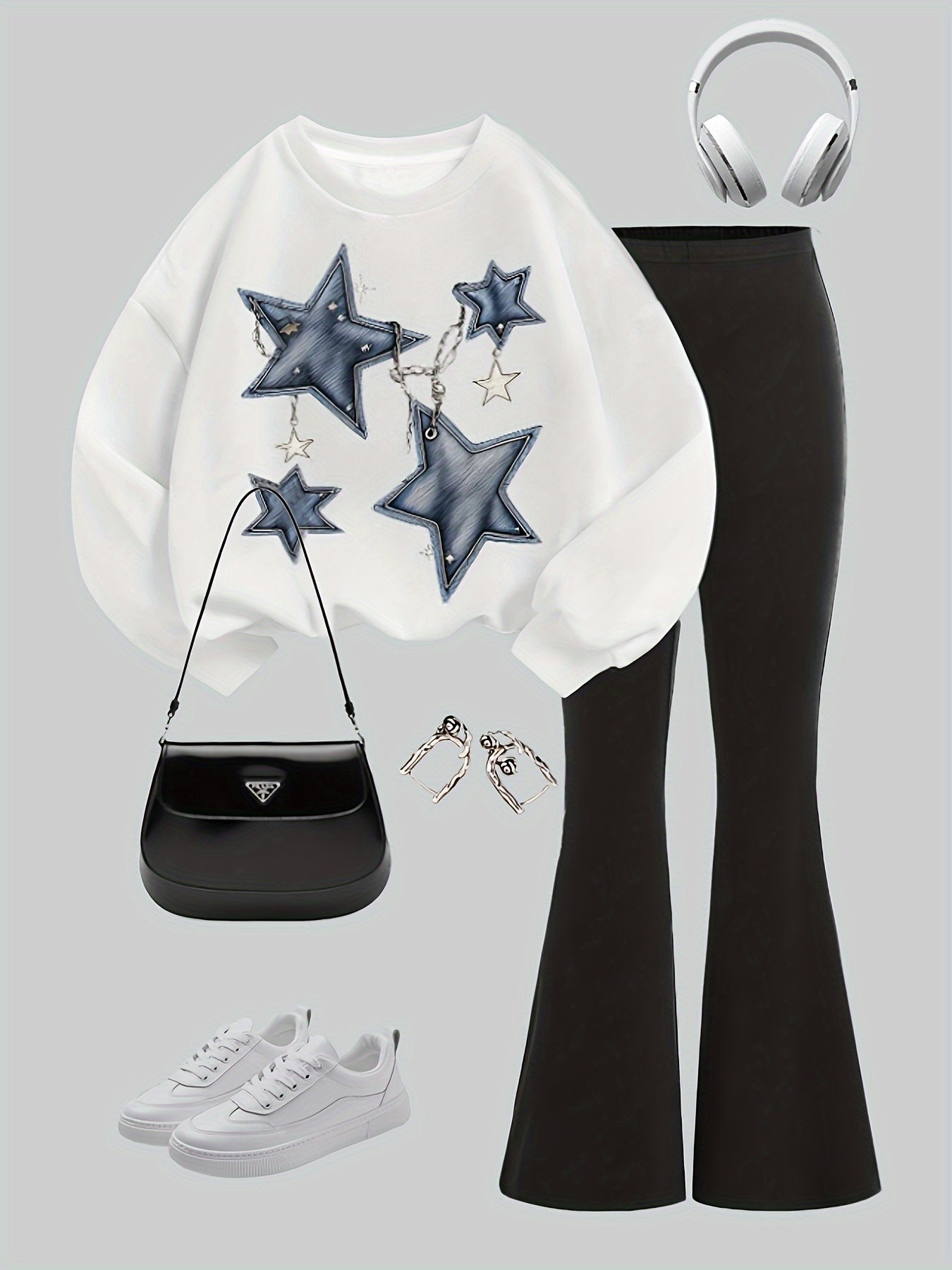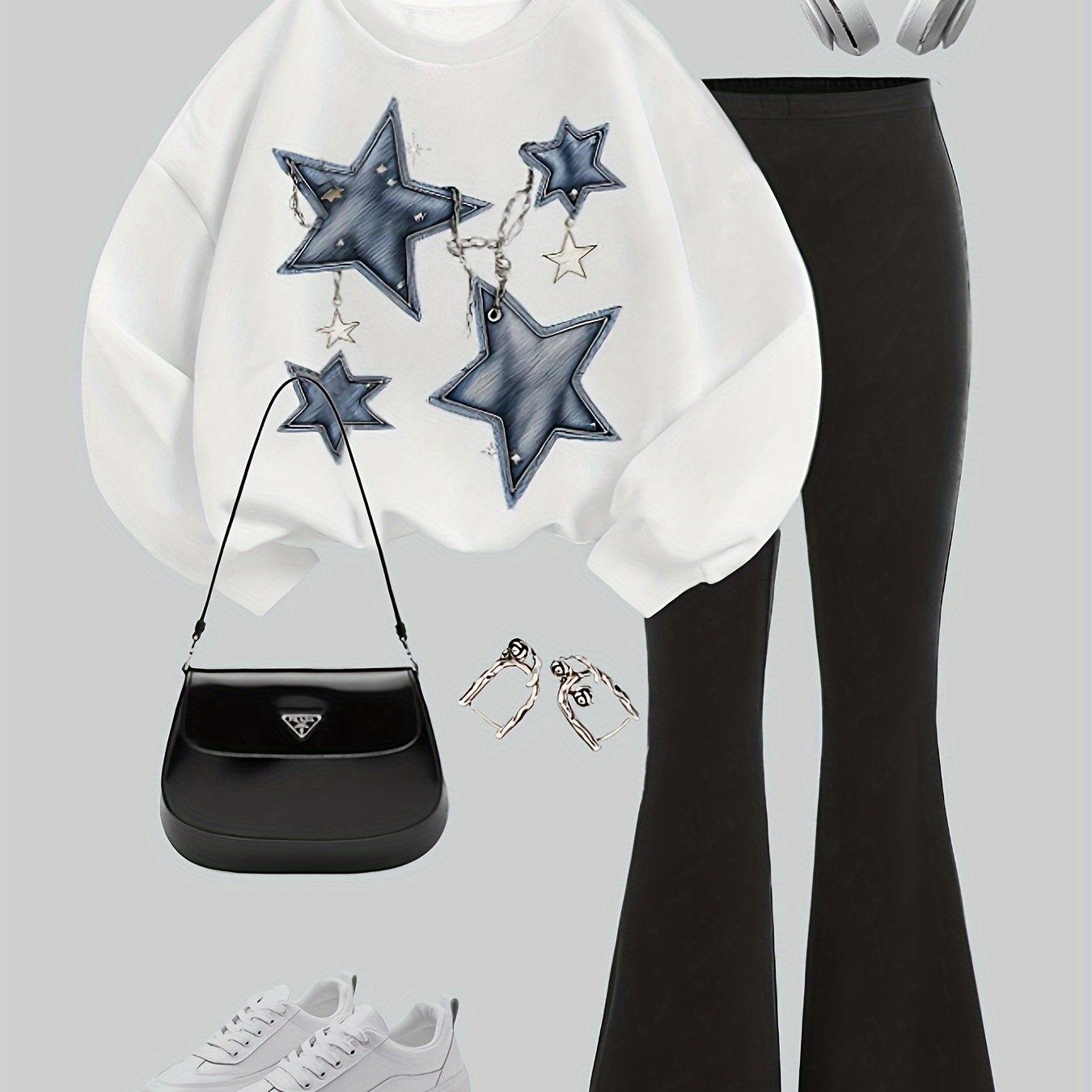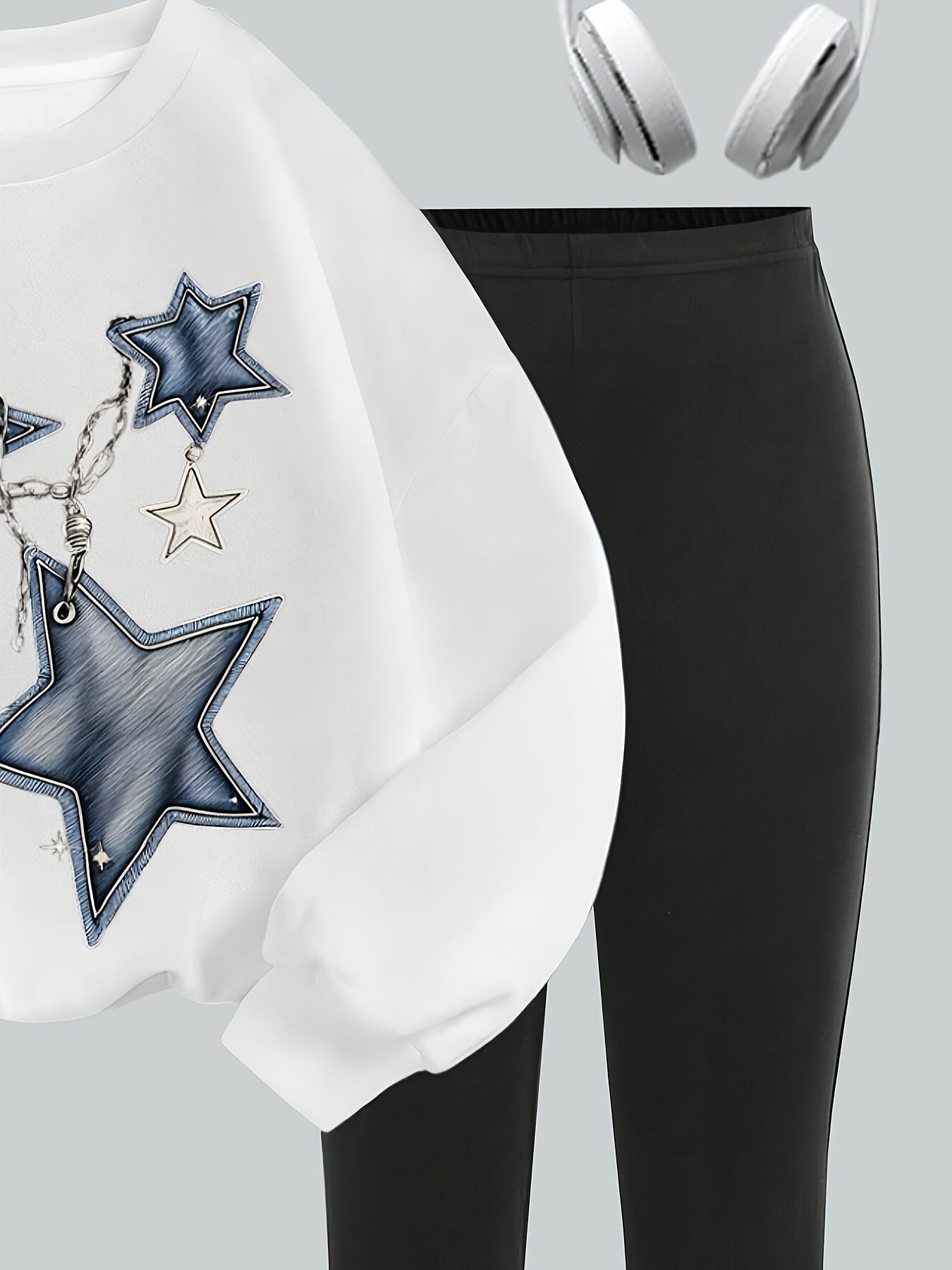 Qizlar uchun tasodifiy yulduz zanjirli printli sviter va kengaytirilgan shimlar to'plami, polyester to'qimadan tayyorlangan, multfilm naqshi bilan, kundalik kiyim, partiyalar va ta'til uchun mos. Ribbed bilan pulloverni o'z ichiga oladi.