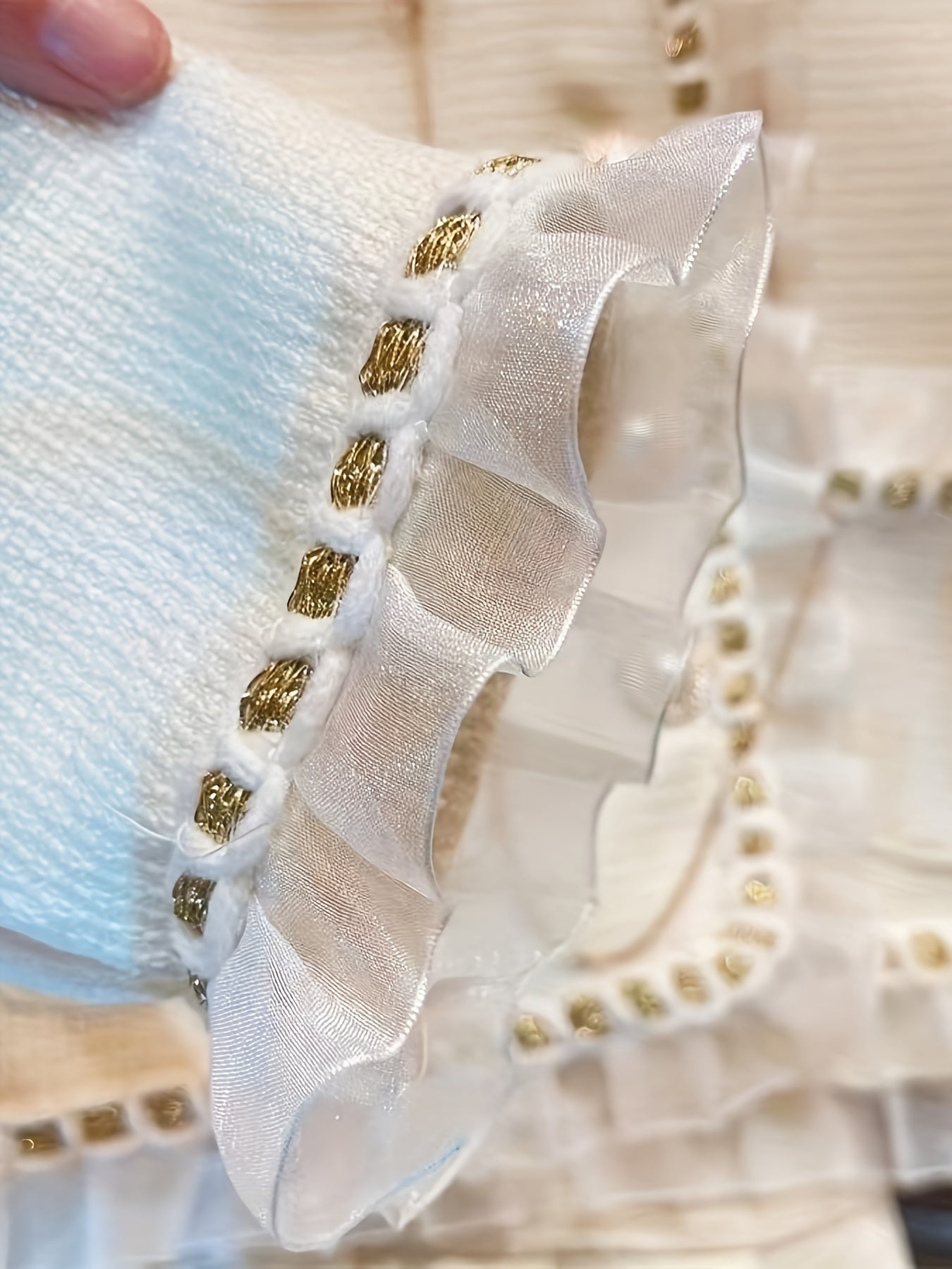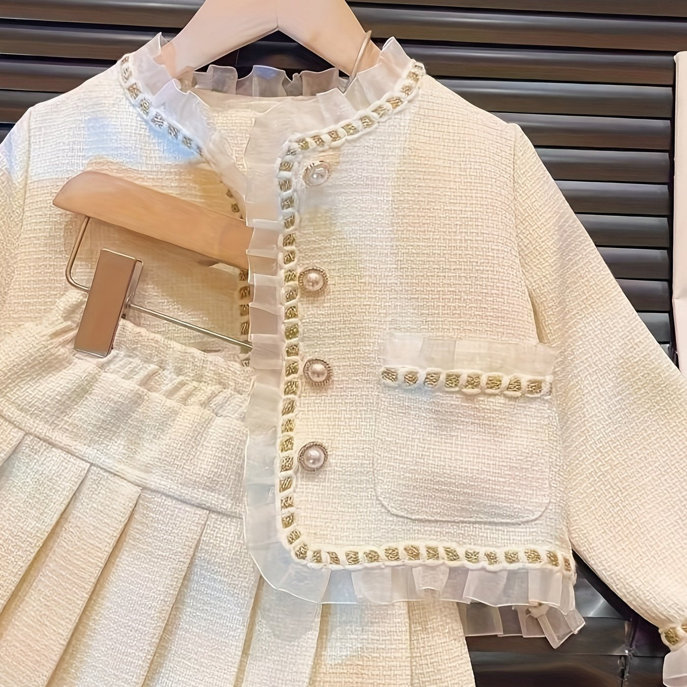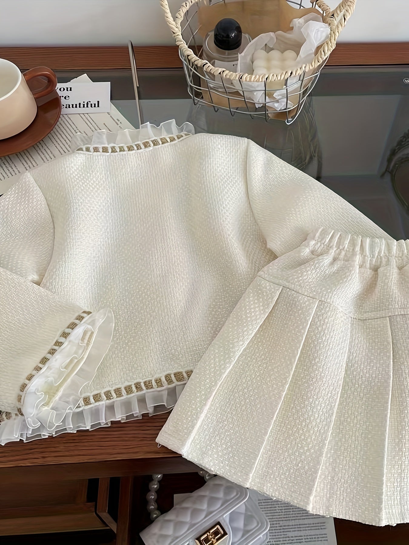 Qizlar uchun nafis sud uslubidagi kiyim to'plami, dantel tafsilotlari bilan uzun qo'lqopli krujka ko'ylak va pliseli yubkadan iborat, polyester va aralashmadan tayyorlangan, bahor va kuz uchun mukammal.
