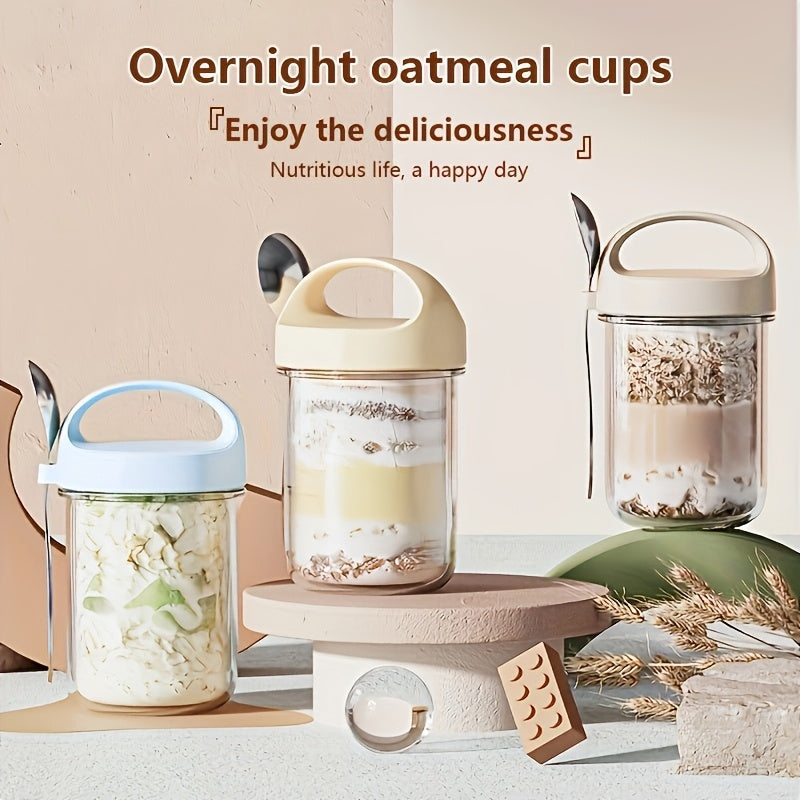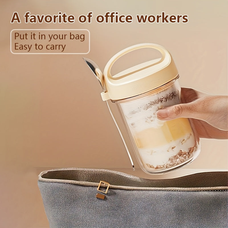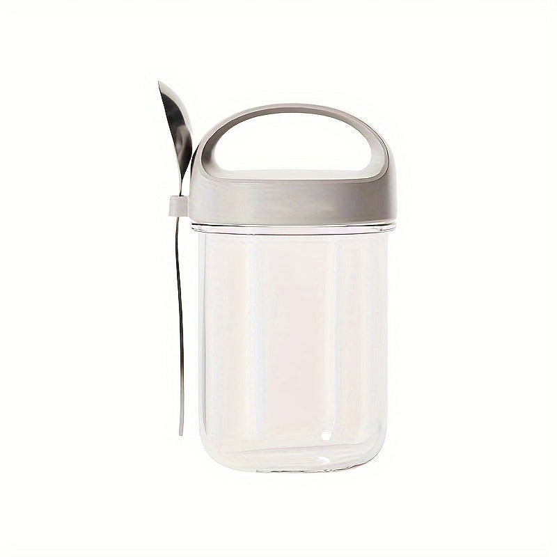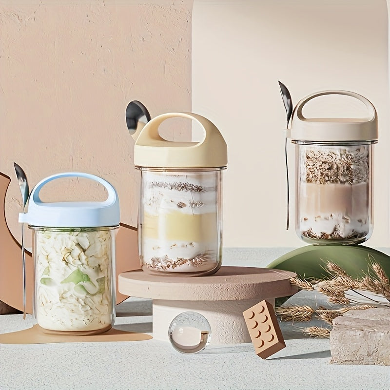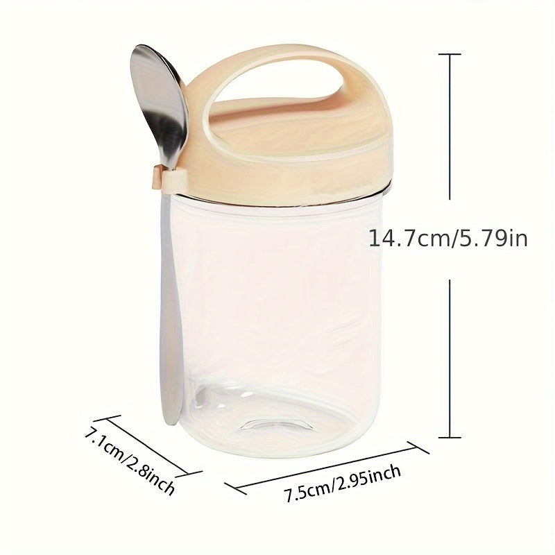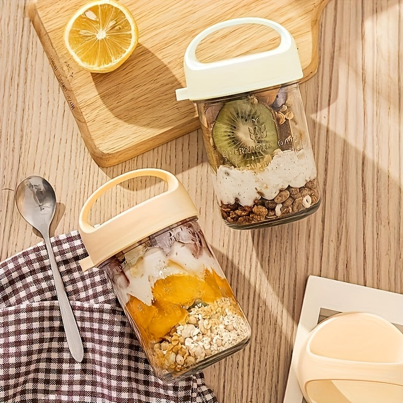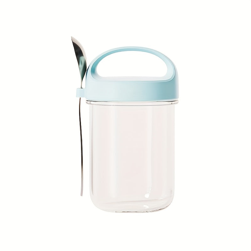 Shisha yogurt stakani tun bo'yi jo'xori, smuzi va donlar uchun muhrlangan idish sifatida ikki marta ishlatiladi, qoshiq bilan.