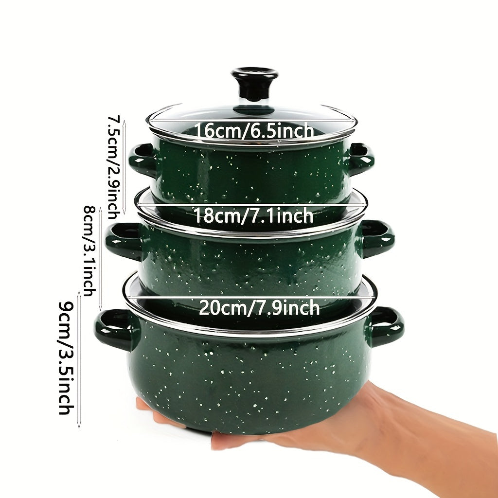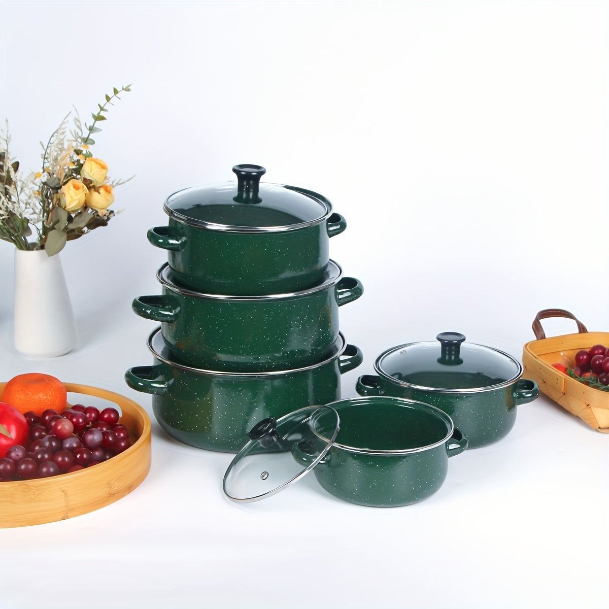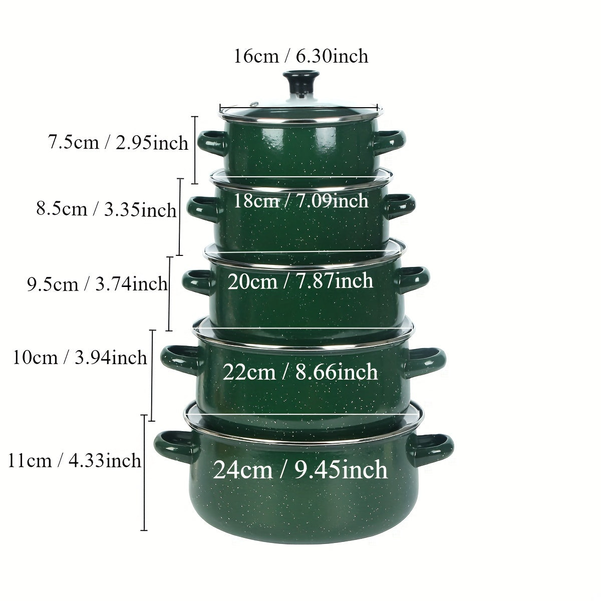 Yashil emal idishlar to'plami: 3 dona bilan, 5 dona olish imkoniyati mavjud. Har qanday pishirish ehtiyojlariga mos keladigan ko'p funksiyali oshxona qozonlari va qozonlar. Gaz, elektr va induksion pechlar bilan mos keladi.