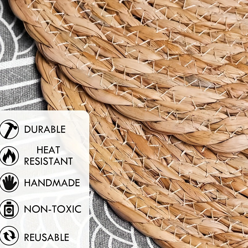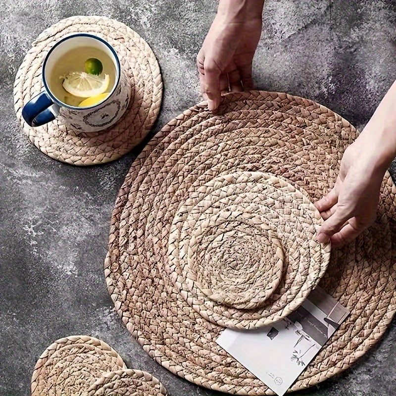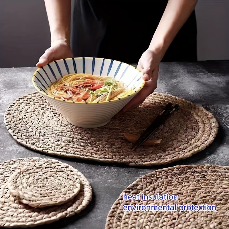 Yapon bog'i choy piyolasi dizaynida to'qilgan 4/6 ta joy matosi to'plami. Stol va choy stollari uchun issiqlik izolyatsiyasini ta'minlaydi, dumaloq idishlar va plastinkalar uchun mos. Oshxonada foydalanish uchun yapon papirusidan tayyorlangan.