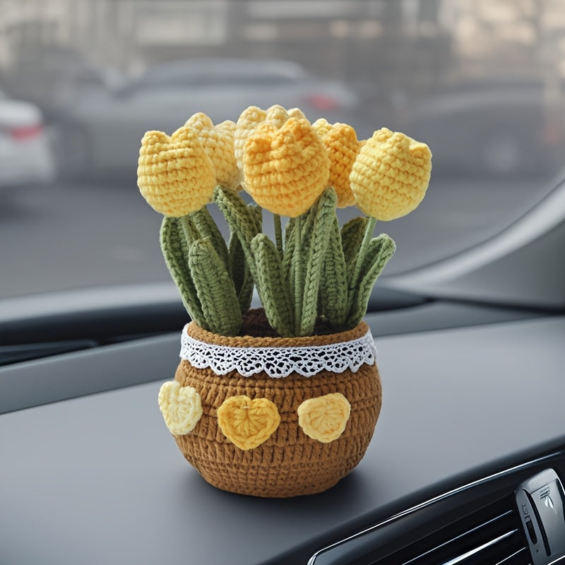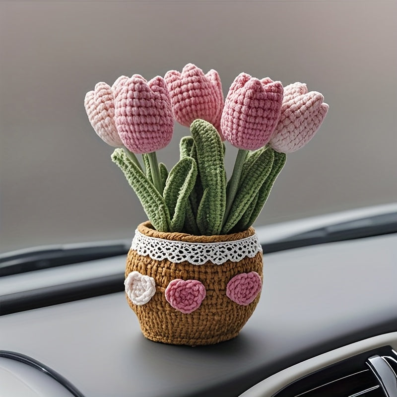 Qoʻlda tayyorlangan toʻqilgan tuliplar idishda, avtomobil paneli uchun bezak, mato gullar, bonsai