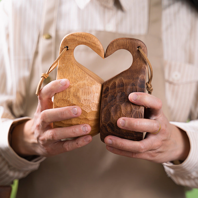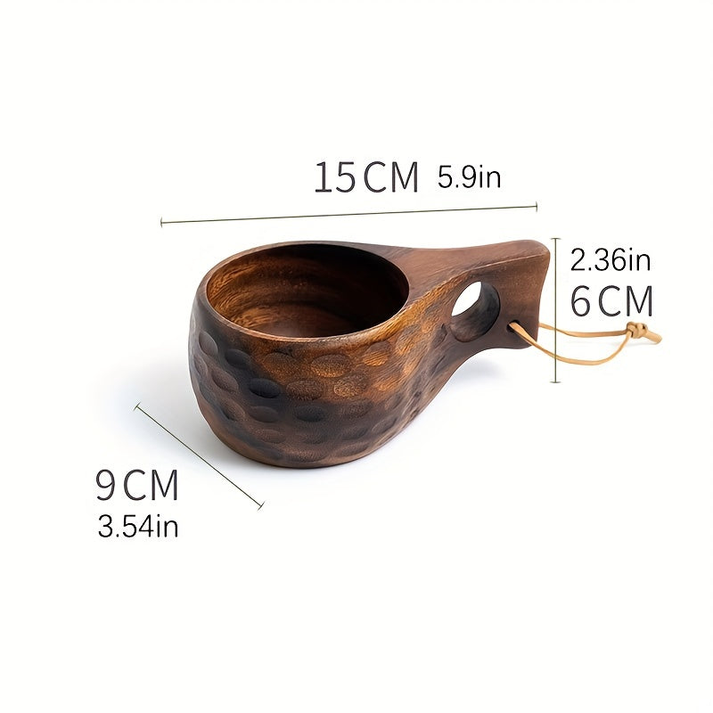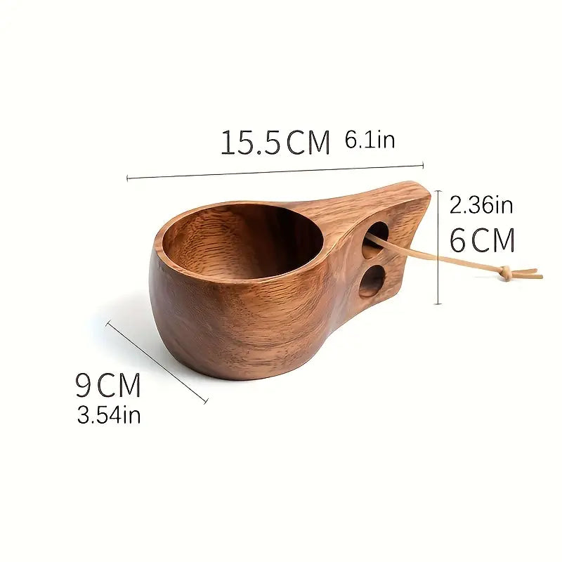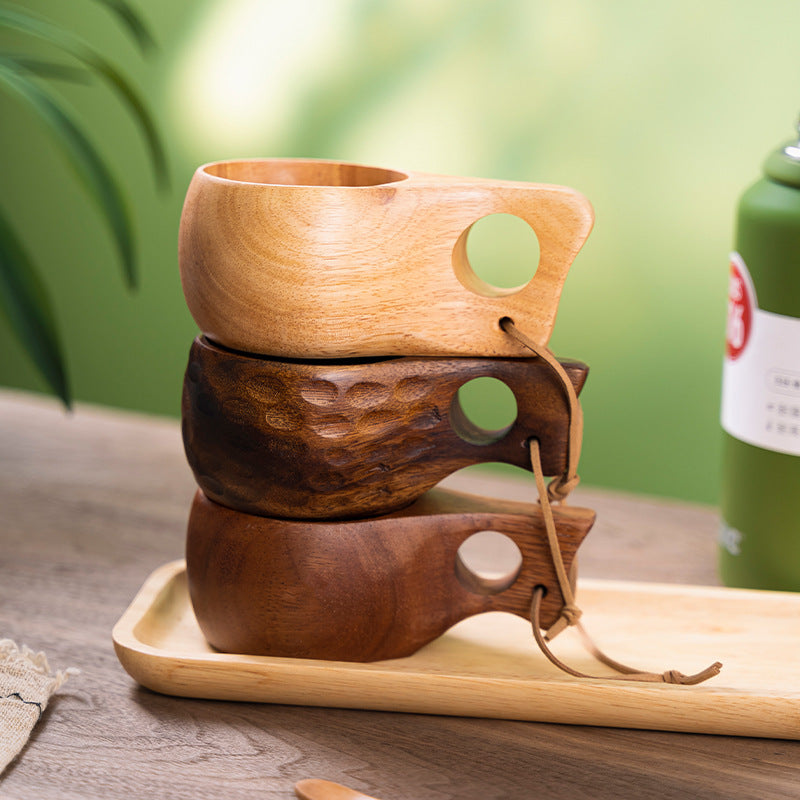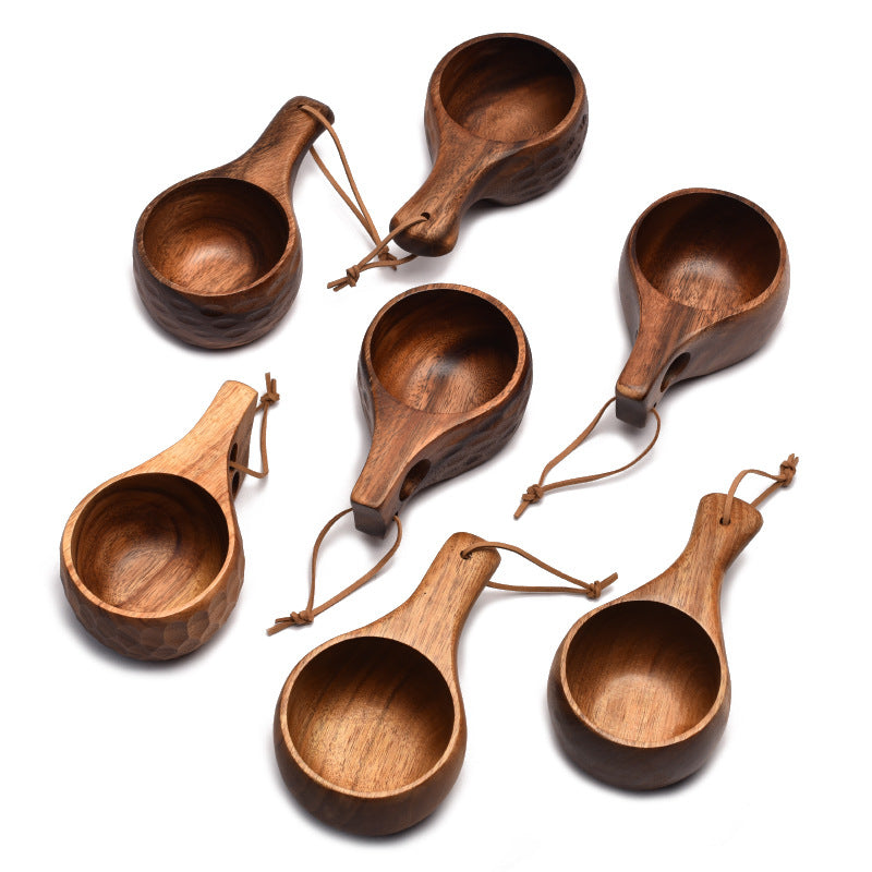 Qo'l bilan tayyorlangan akatsiya yog'ochidan yasalgan qahva piyolalari, arqon tutqichi bilan, lagerda va oshxonada foydalanish uchun mukammal.
