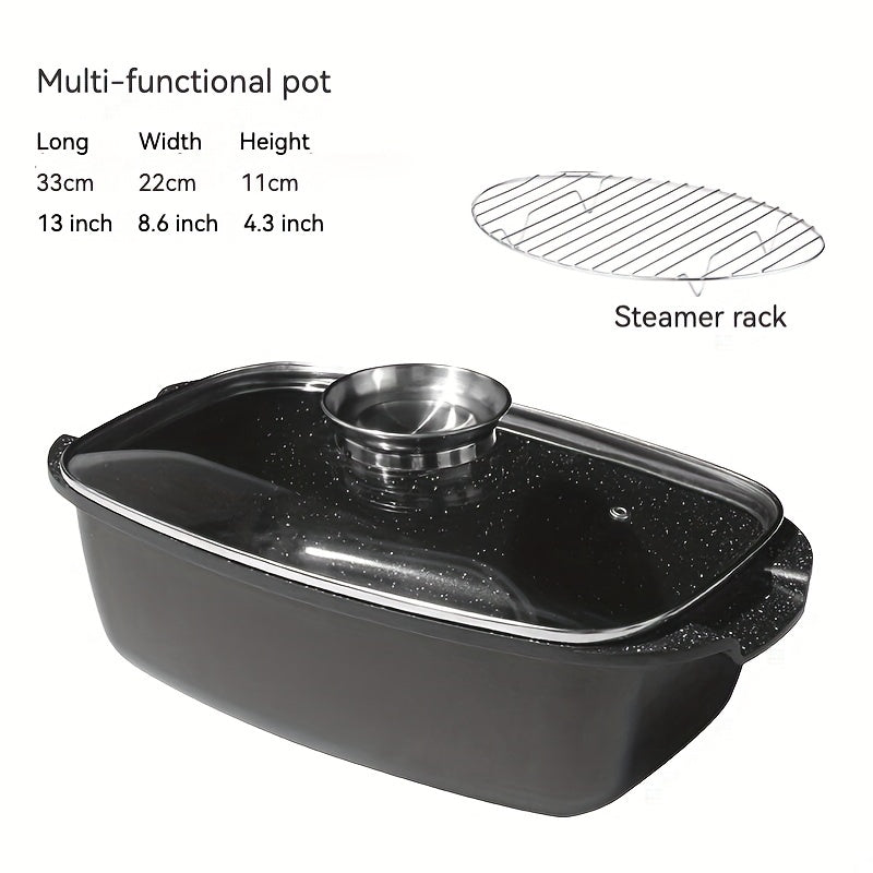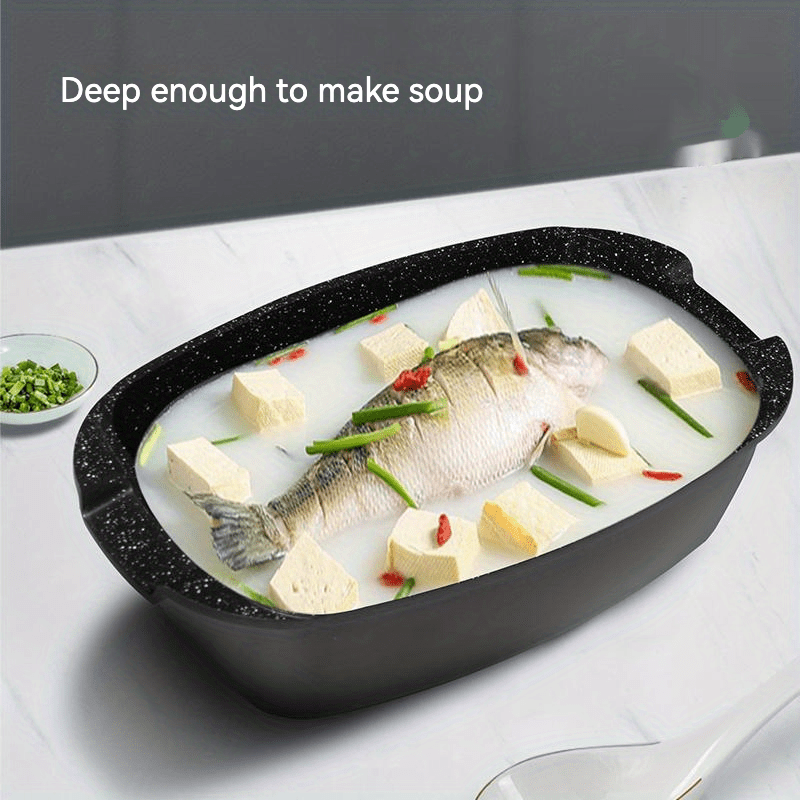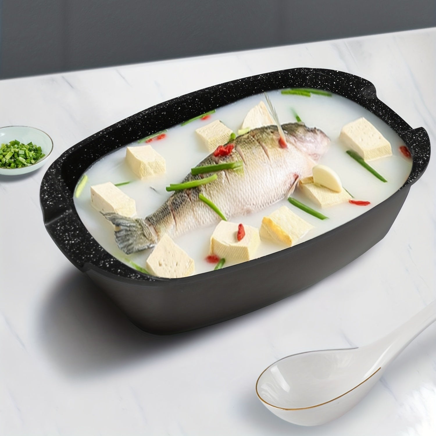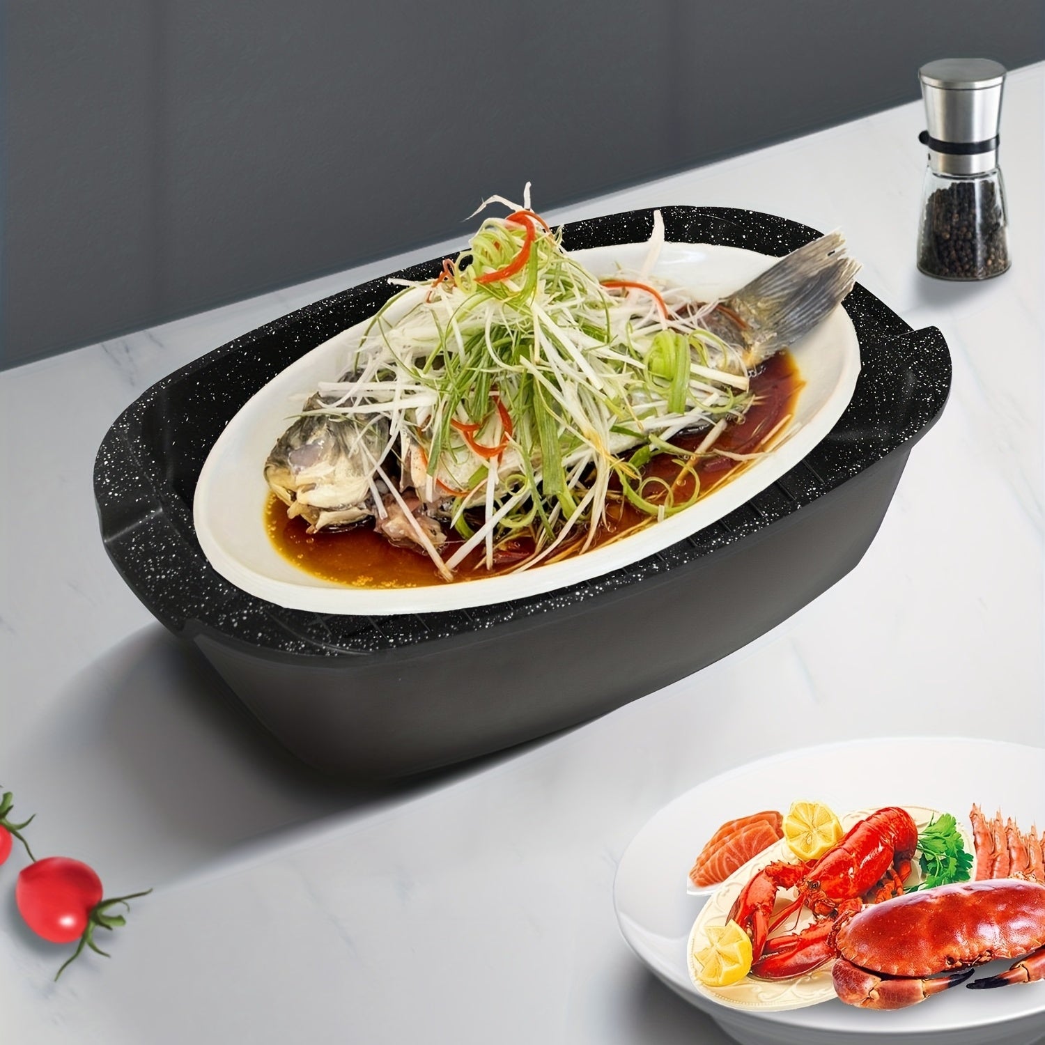 Qattiq anodlangan yopishqoq baliq pishiruvchi, bug' pishirgich bilan - baliq va dengiz mahsulotlari uchun oval qozon - induksiya, gaz va keramika plitalari bilan mos - qopqoq va pechda xavfsiz pishirish panasi bilan birga - 13 dyuymli alyuminiy oval