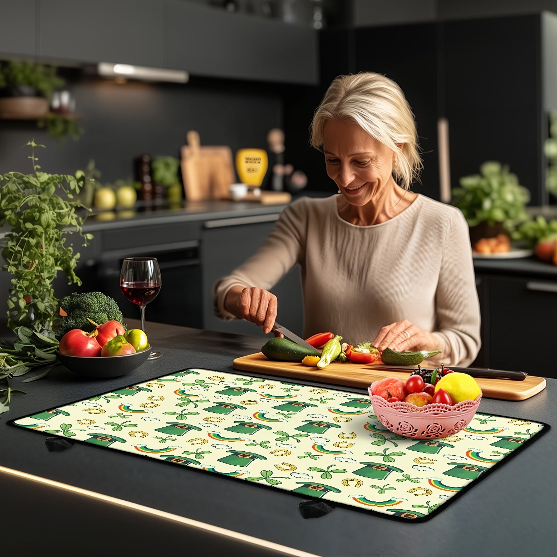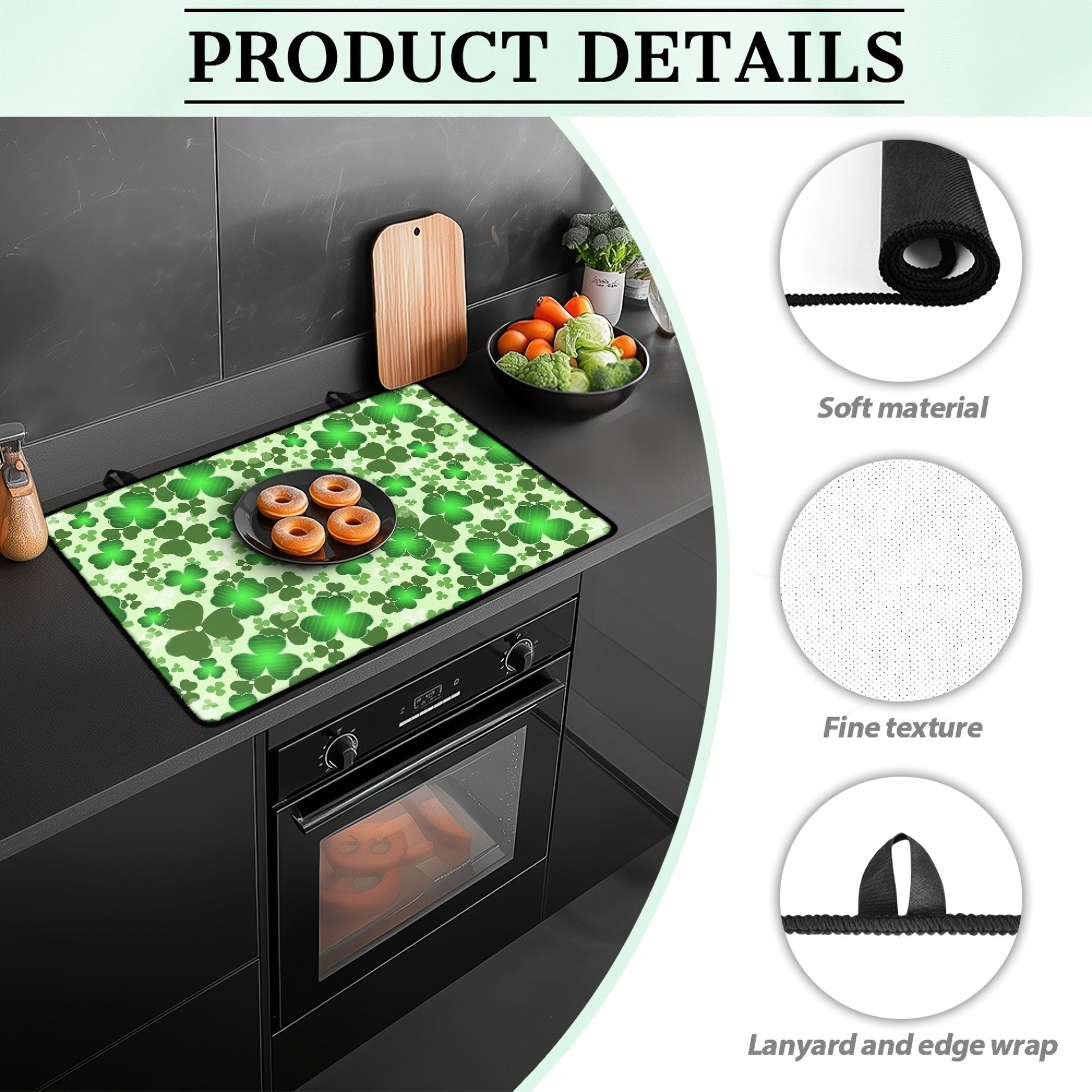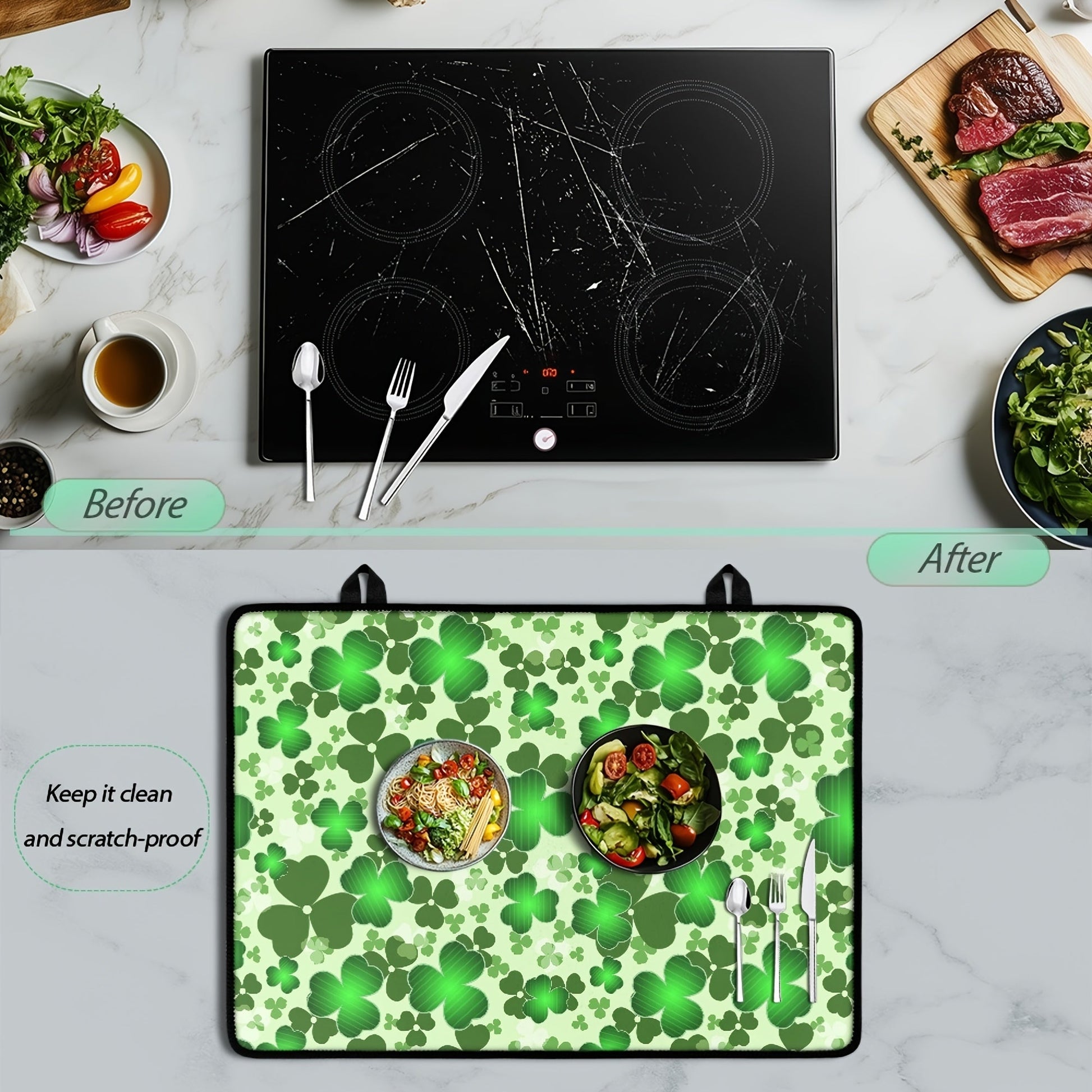 Oshxona himoyasi uchun toshga chidamli, yopishqoq bo'lmagan pechka qoplami, Klover va Yashil shlyapa dizayni bilan