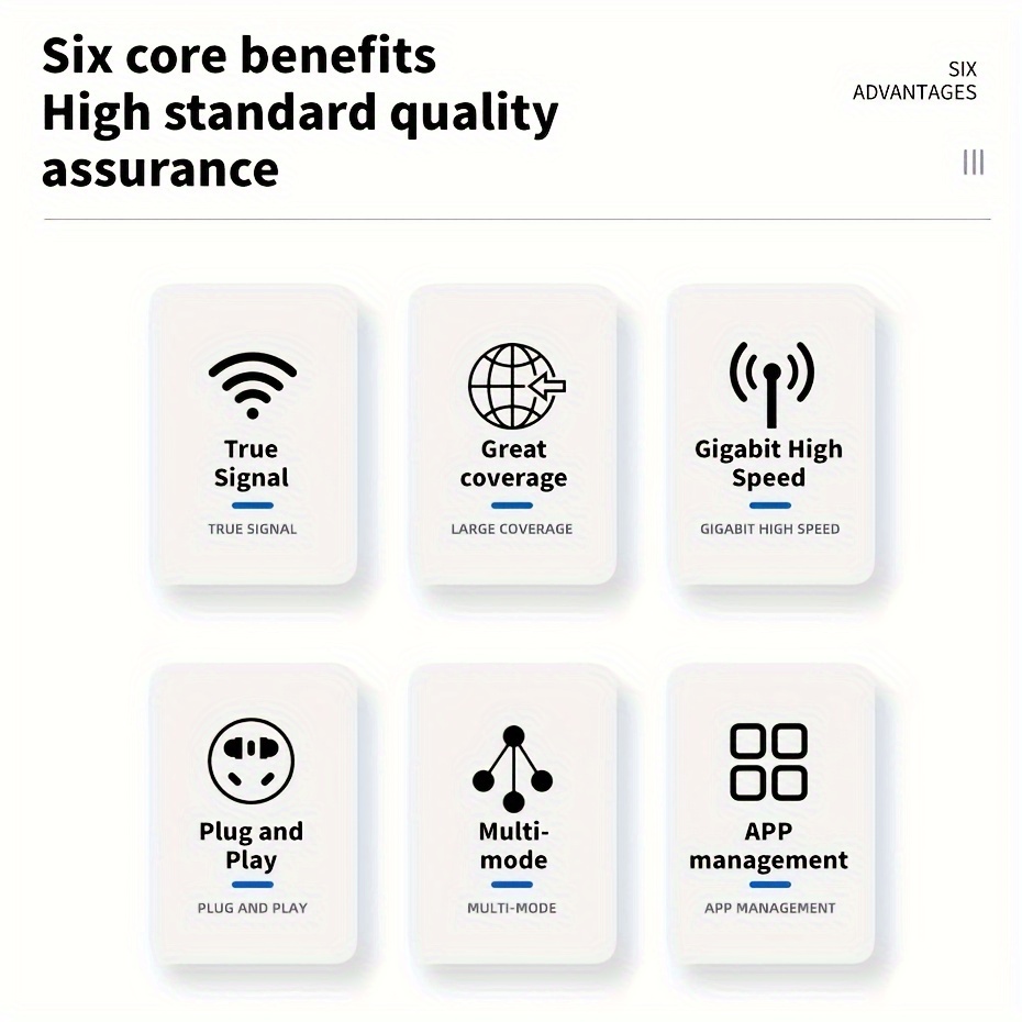 Yuqori samarali ikki diapazonli WiFi kengaytirgichi 1200Mbps gacha signalni kuchaytiradi, 8500 kvadrat fut uchun kuchli qamrov va 35 ta qurilmaga qadar qo'llab-quvvatlash bilan. Bir marta bosish bilan oson sozlash, 360° qamrov.