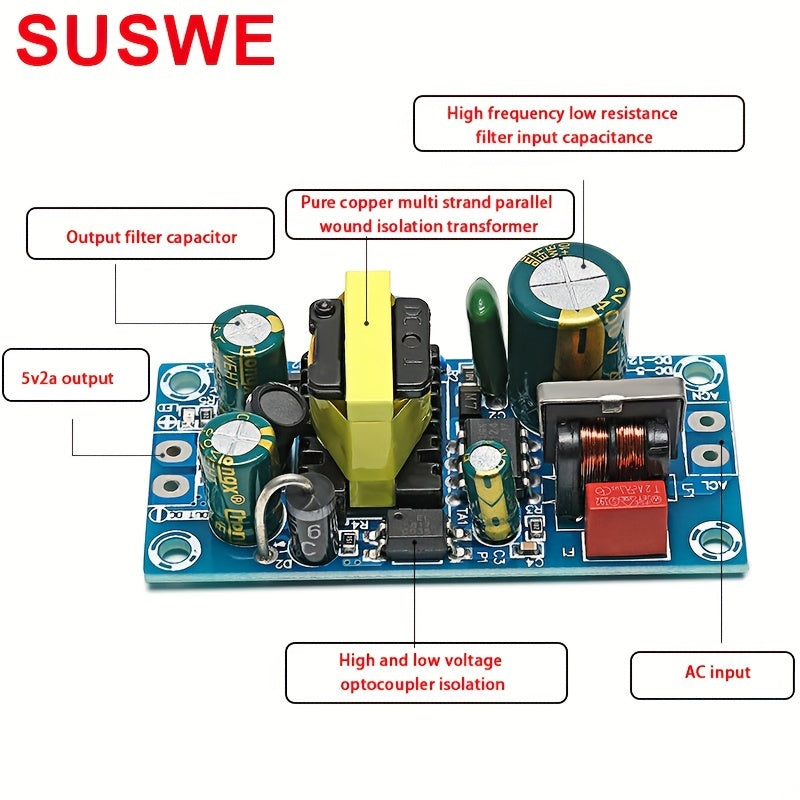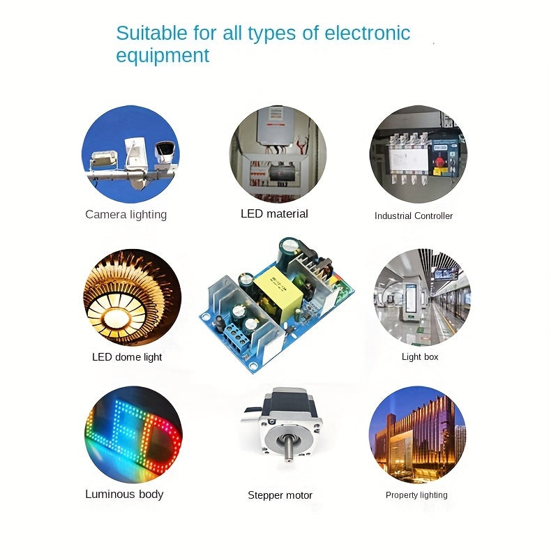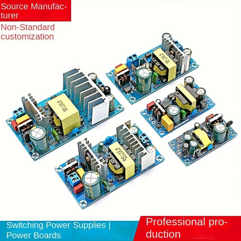 AC220V kirish va DC5V12V chiqish variantlari bilan yuqori quvvatli o'zgaruvchan kuchlanish ta'minoti moduli, turli joriy quvvatlarda mavjud bo'lgan ichki platalar bilan.