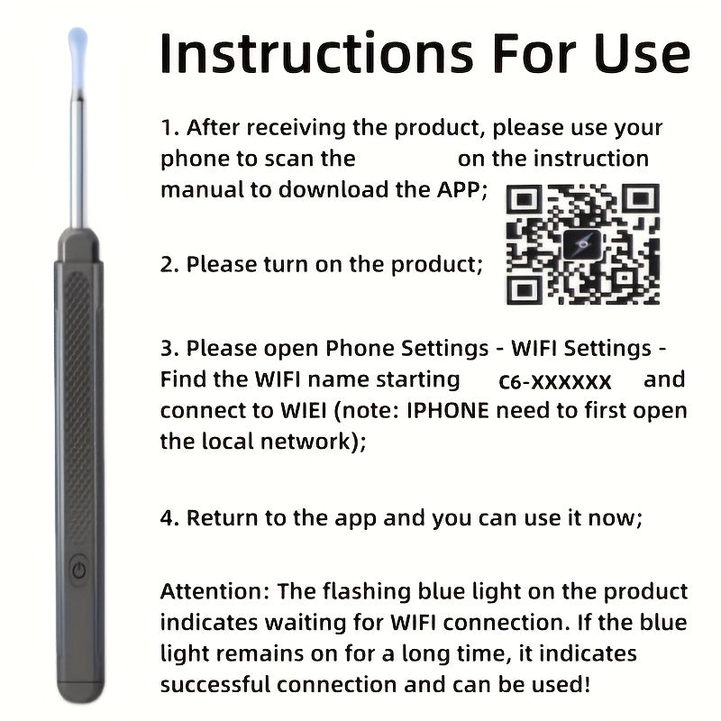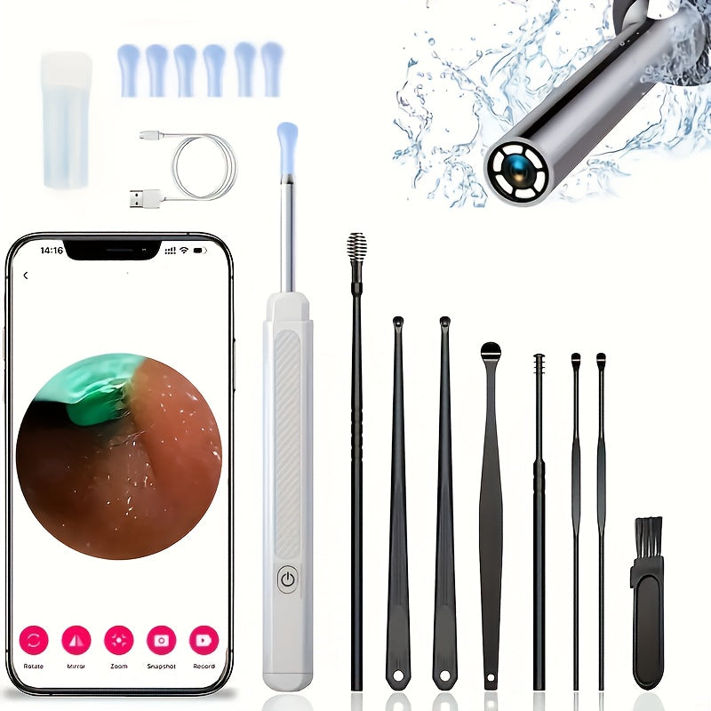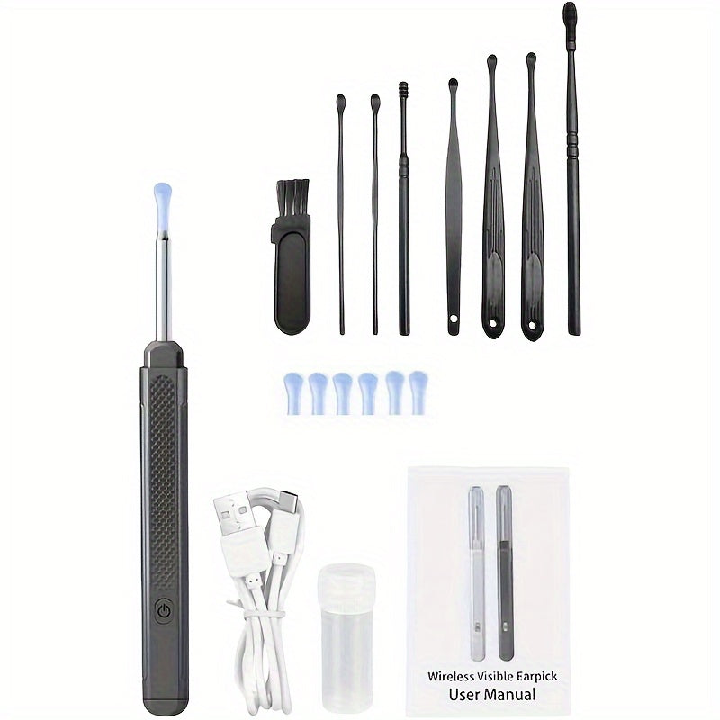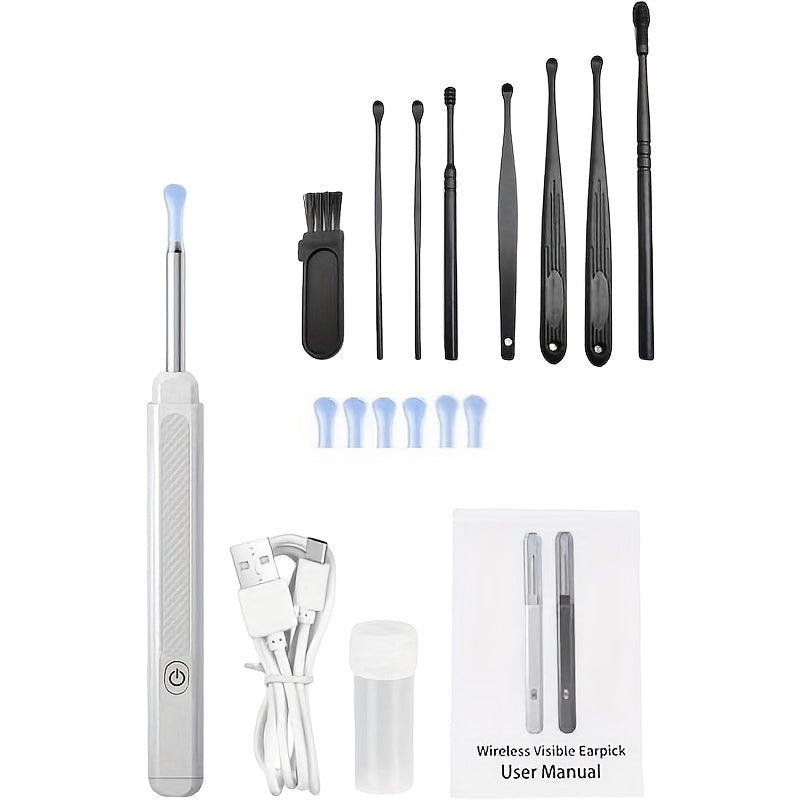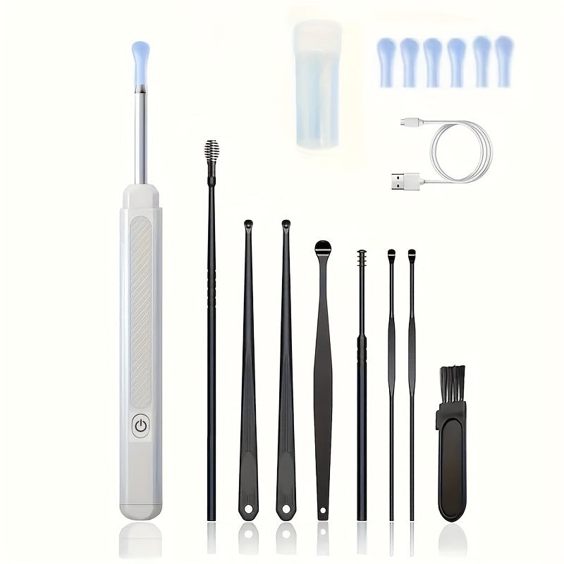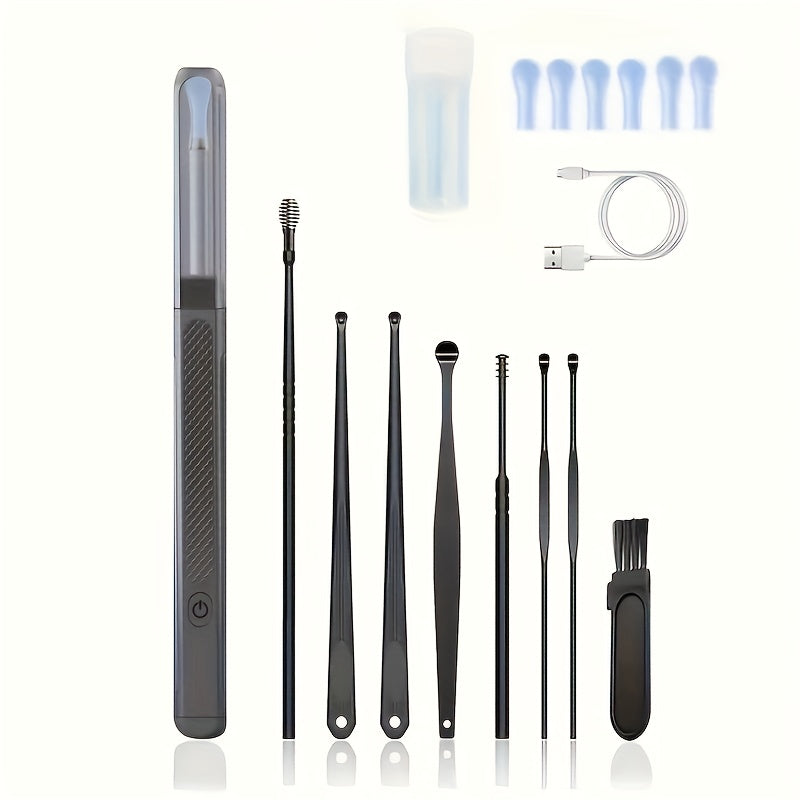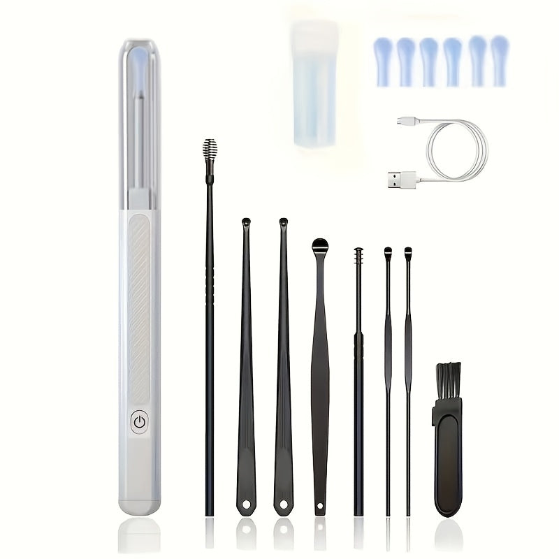 Kamerali yoritilgan quloq qopqog'ini tozalash vositasi, 6 ta silikon quloq qoshiqni o'z ichiga olgan 8 dona to'plam, qayta zaryadlanadigan litiy batareya, USB zaryadlash, 130mAh, zamonaviy quloq qopqog'ini olib tashlash aksessuar.