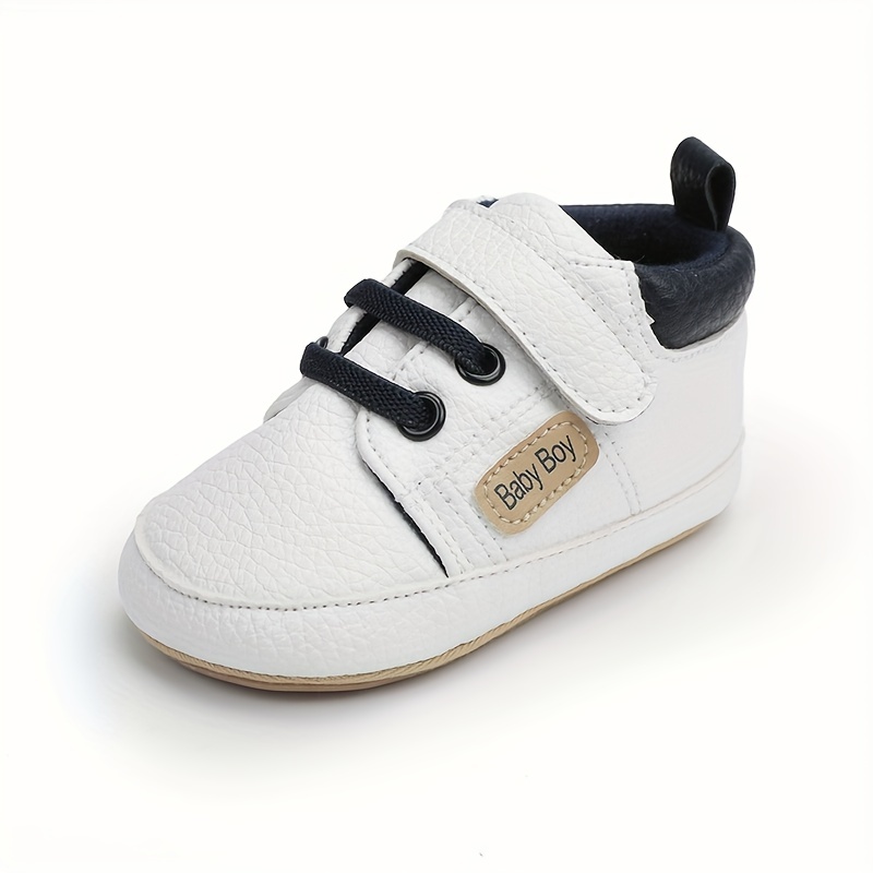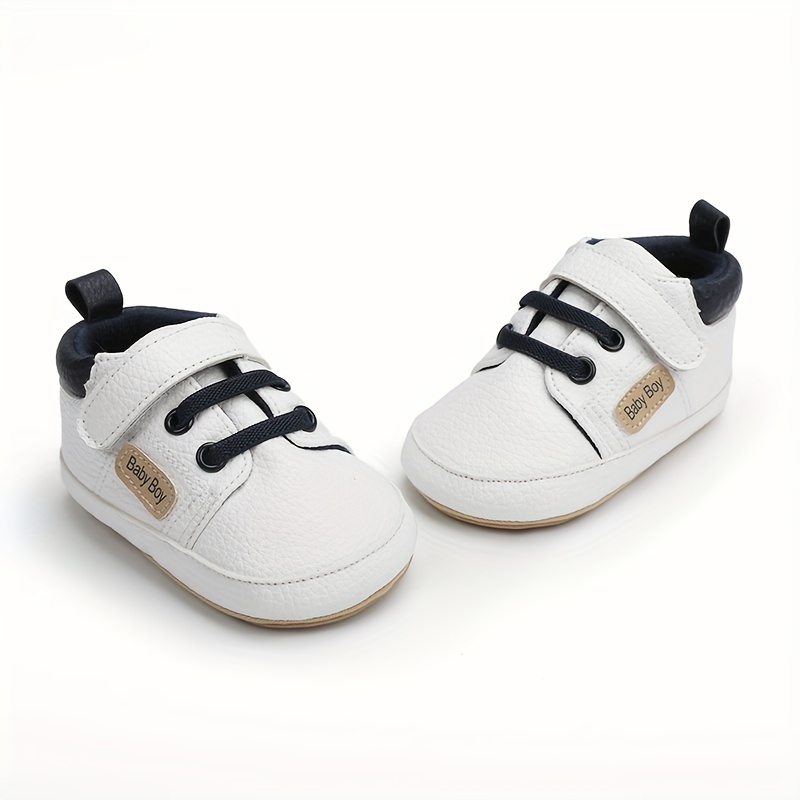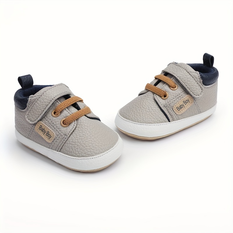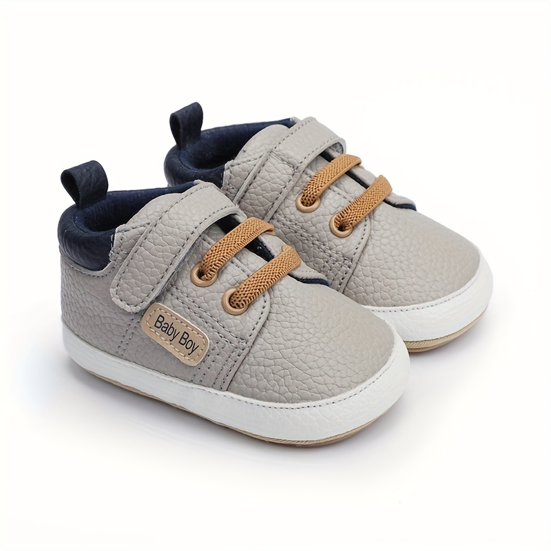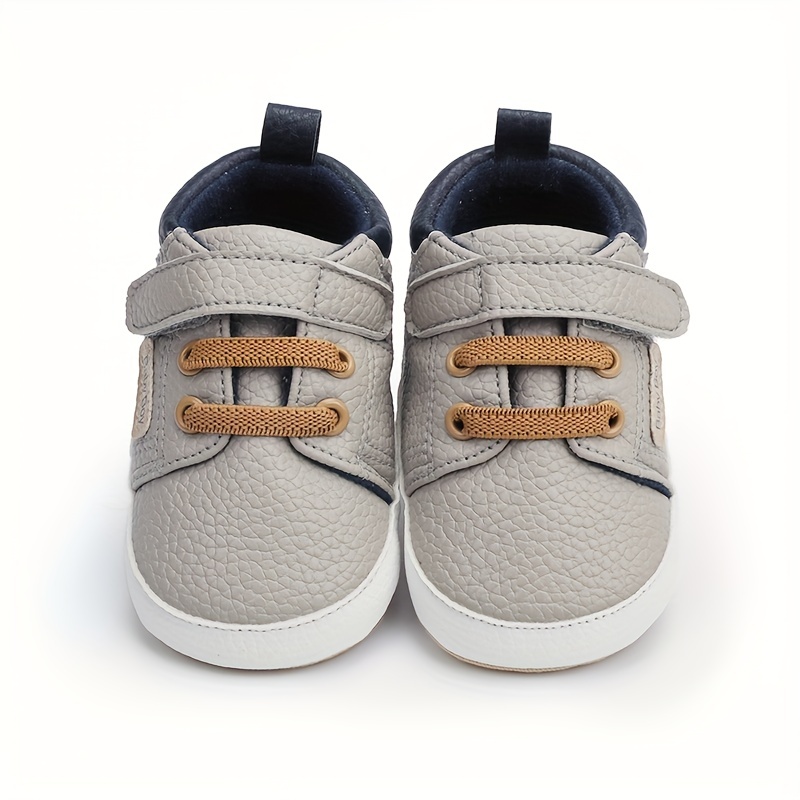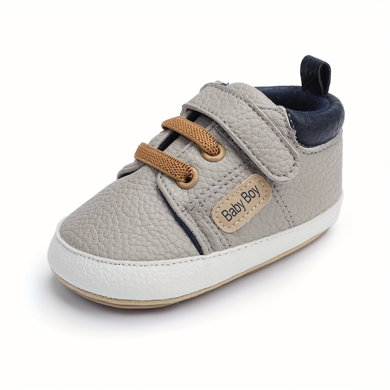 Yumshoq kauchuk taglikka ega, engil kulrang PU ustki qismi ko'k aksentlar bilan, qulay birinchi qadam poyabzallari 4 rangda mavjud bo'lgan chaqaloq uchun anti-slip krossovkalar.