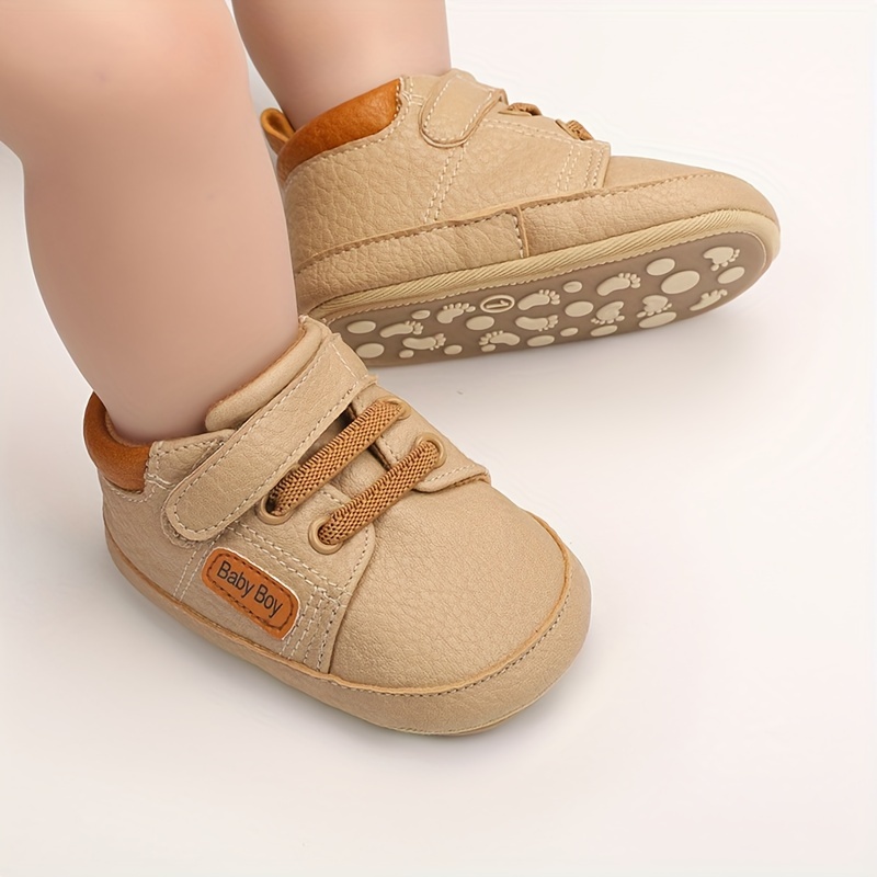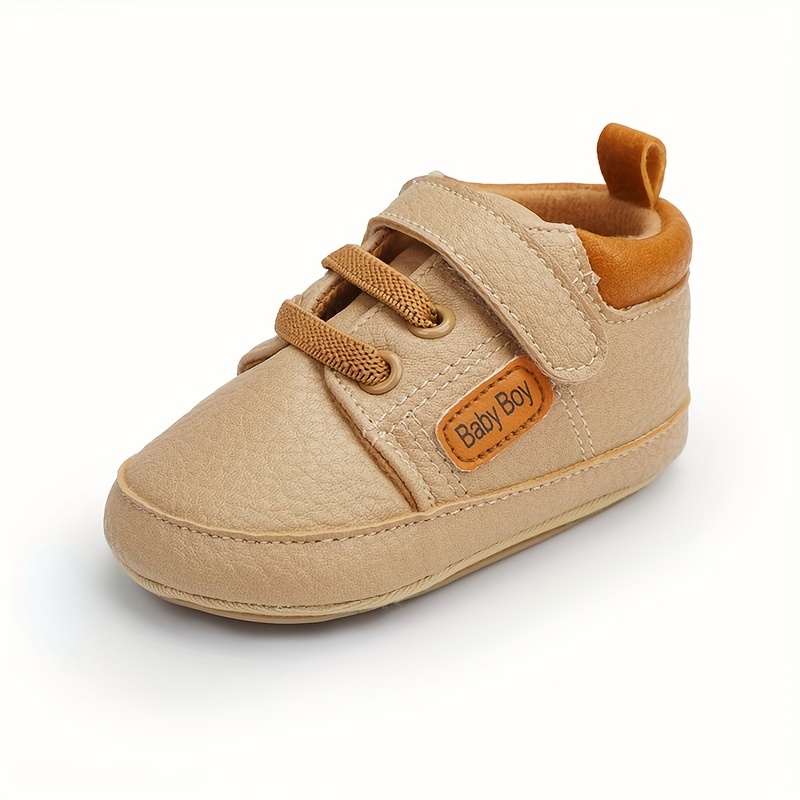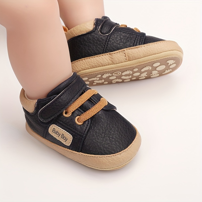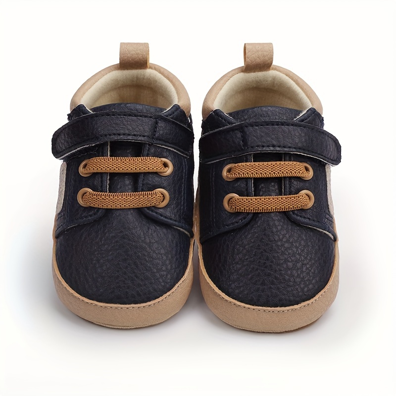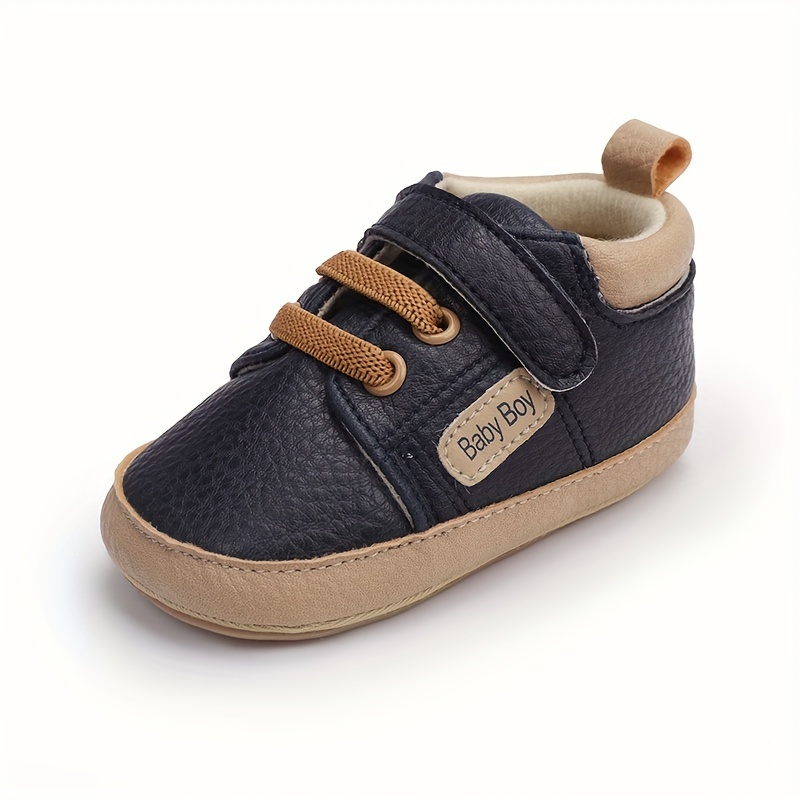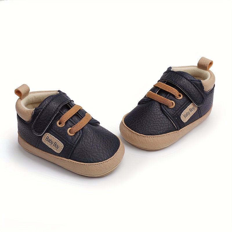 Yumshoq kauchuk taglikka ega, engil kulrang PU ustki qismi ko'k aksentlar bilan, qulay birinchi qadam poyabzallari 4 rangda mavjud bo'lgan chaqaloq uchun anti-slip krossovkalar.