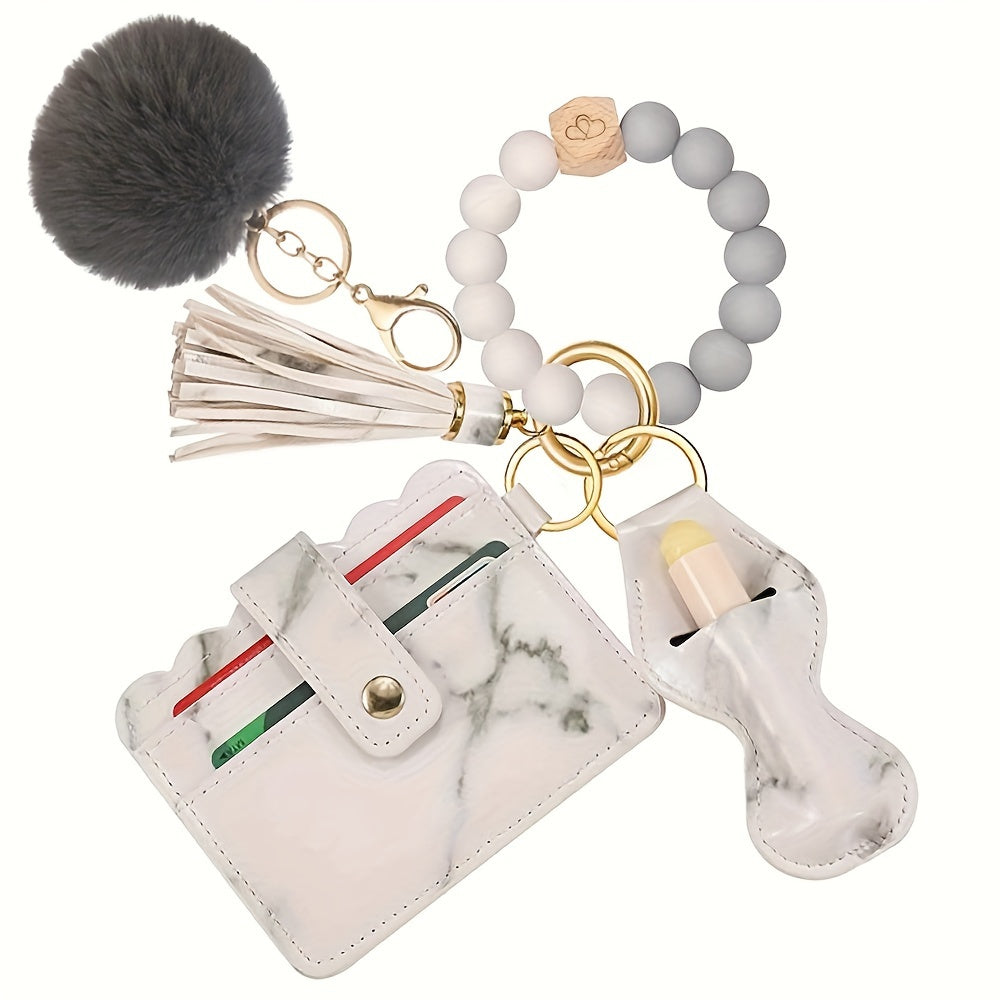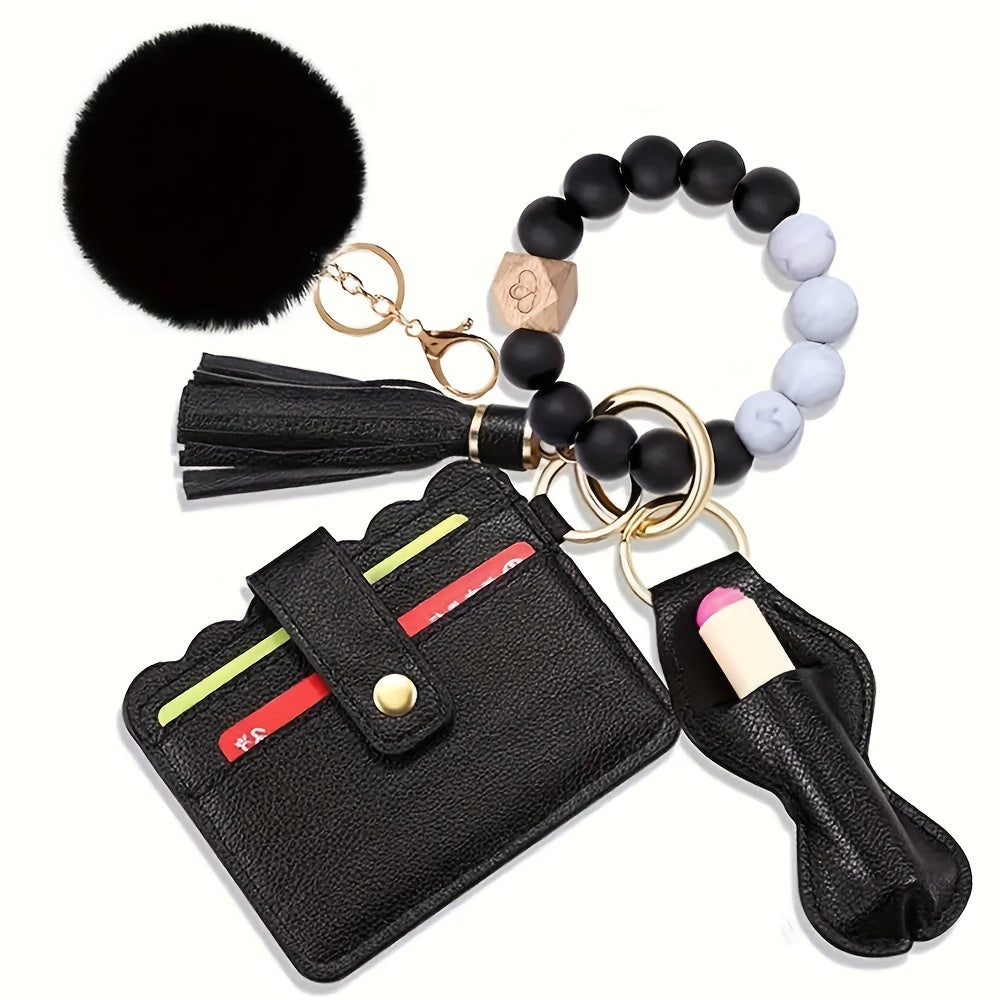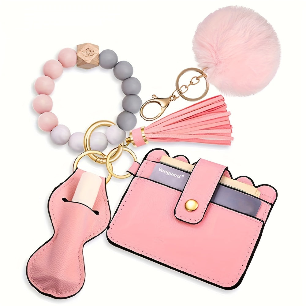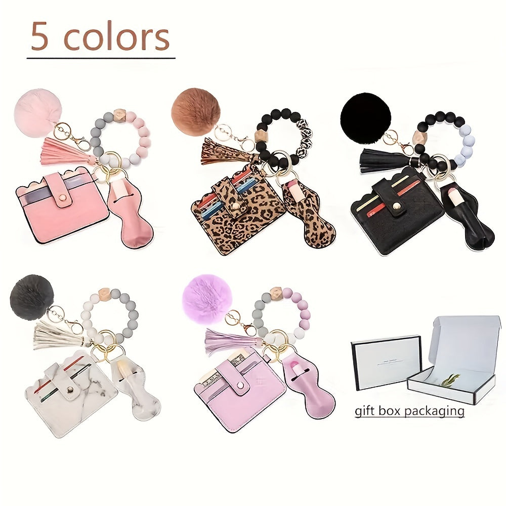 Ayollar uchun kalit zanjiri aksessuarlar, jumladan premium charm kalit uzuk, karta ushlagich hamyon, elastik silikon marjonli tassel kalit zanjiri va lab bo'yog'i ushlagich (6 dona) - ayollar uchun sovg'a sifatida mukammal.