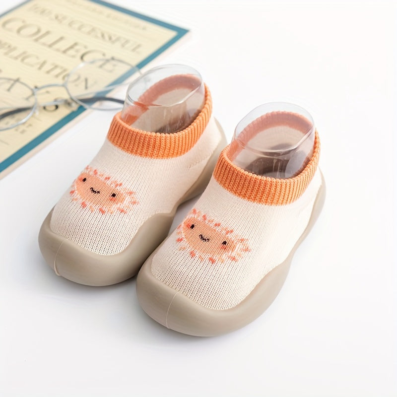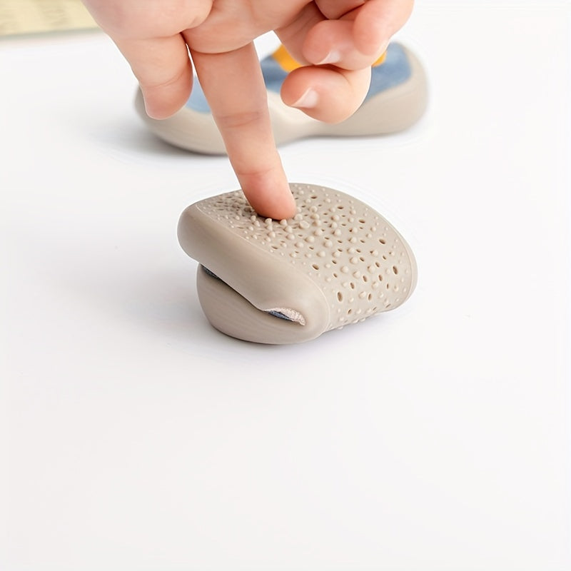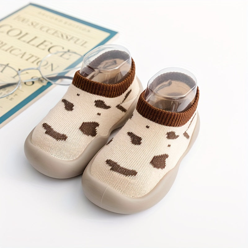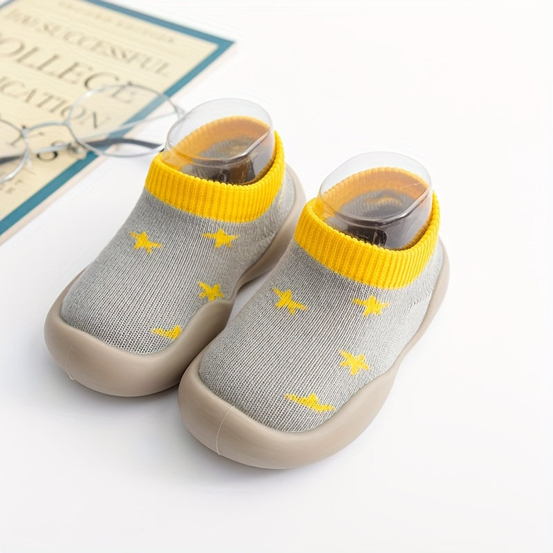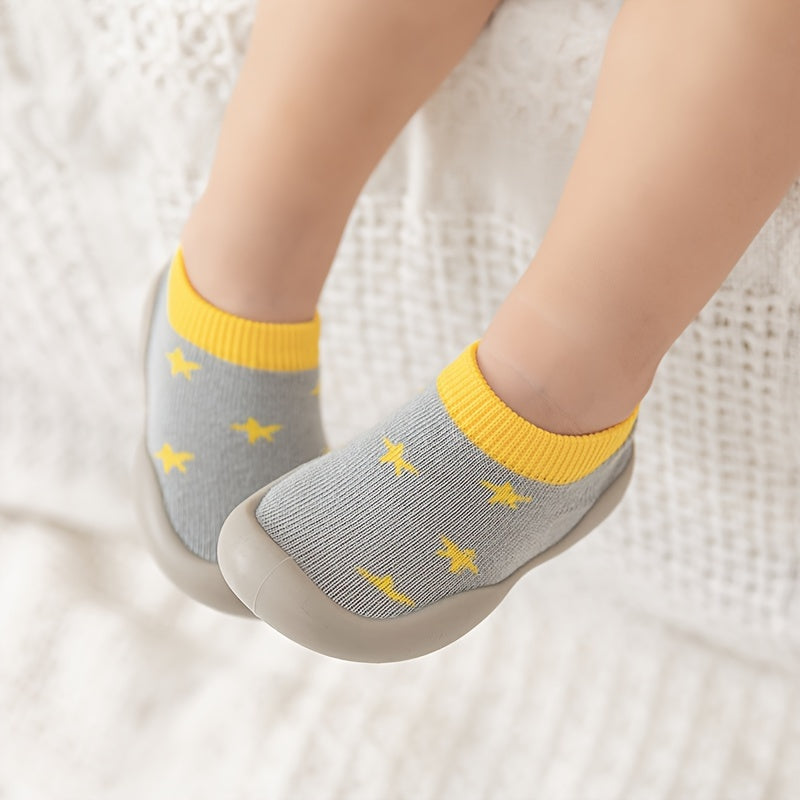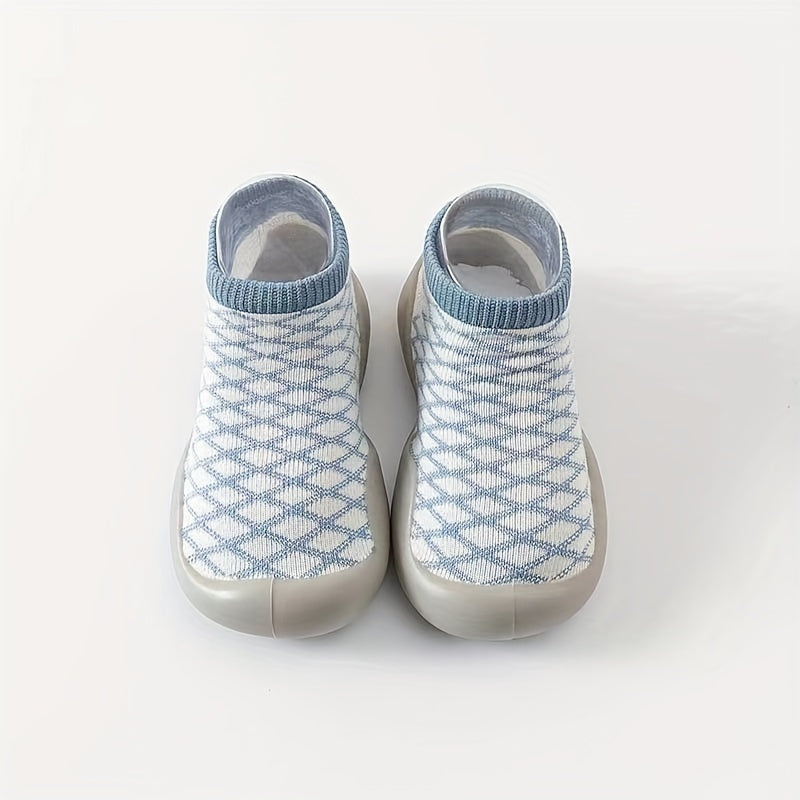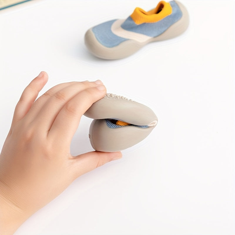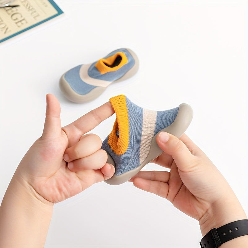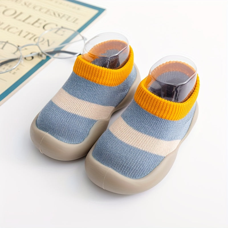 Bolalar uchun karton yuruvchi paypoqlar, rezina taglik bilan, ko'k va sariq chiziqli naqshda, kichik bolalar va maktabgacha yoshdagi bolalar uchun qulay.