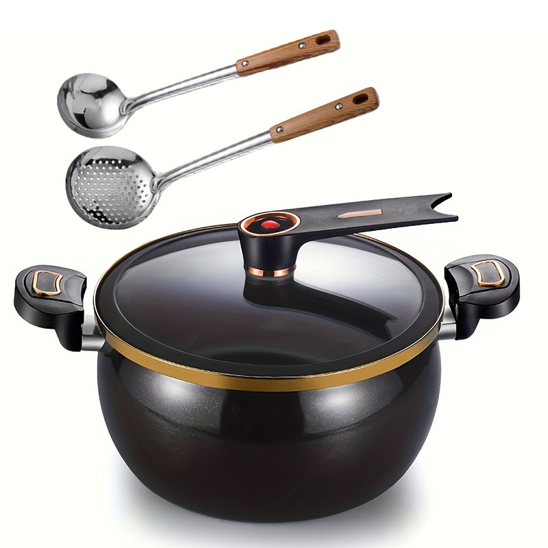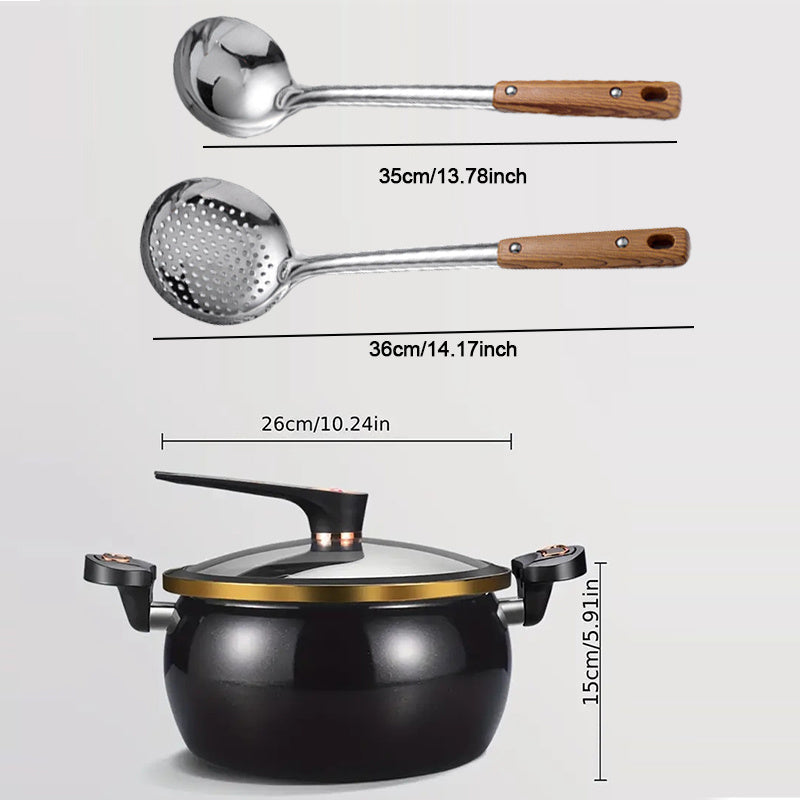 Katta 7.99L sig'imli yopishqoq temir qozon to'plami, 2 qoshiq bilan - turli xil taomlar, masalan, qovurma va sho'rva uchun ideal - induksiya va gaz pechlarida ishlatilishi mumkin.