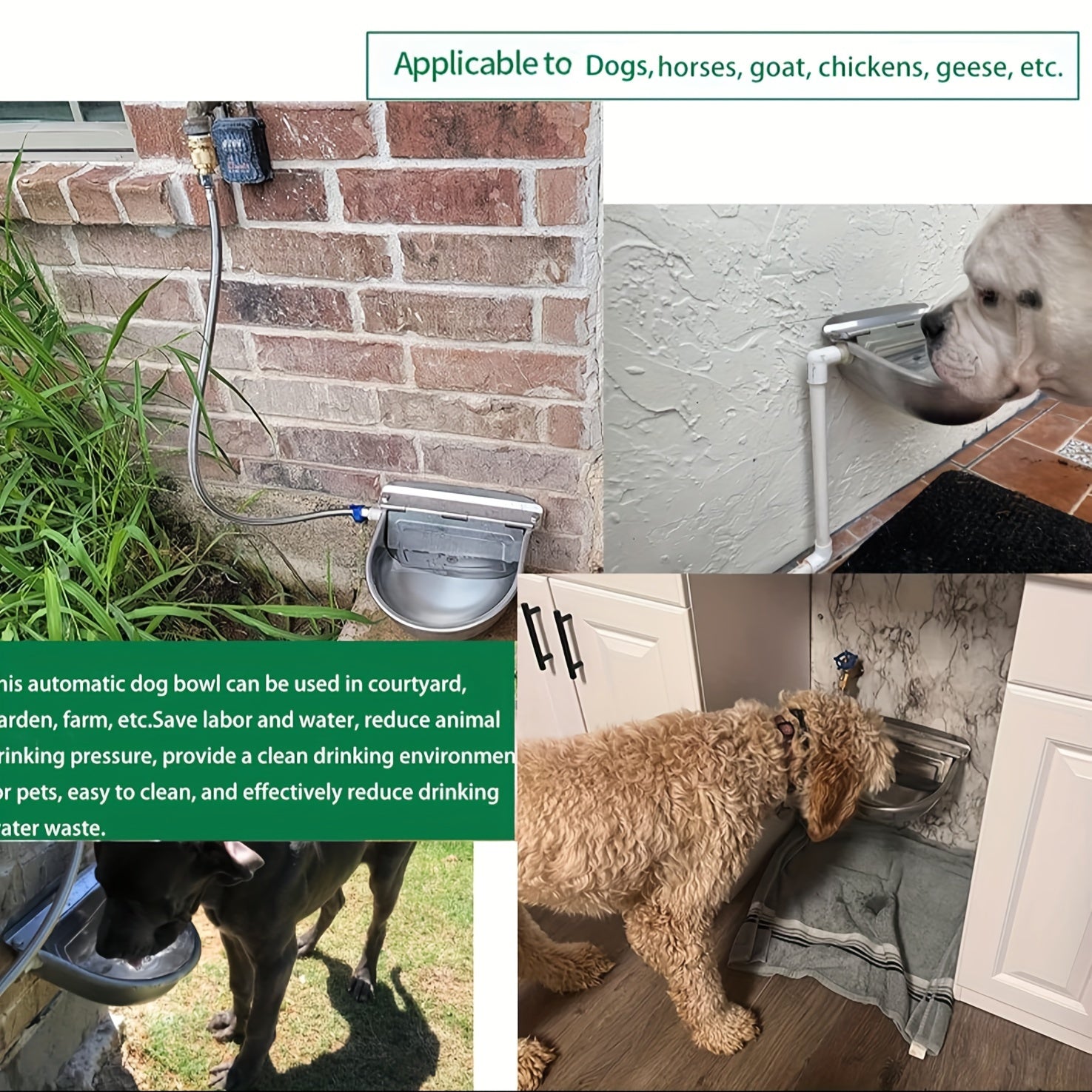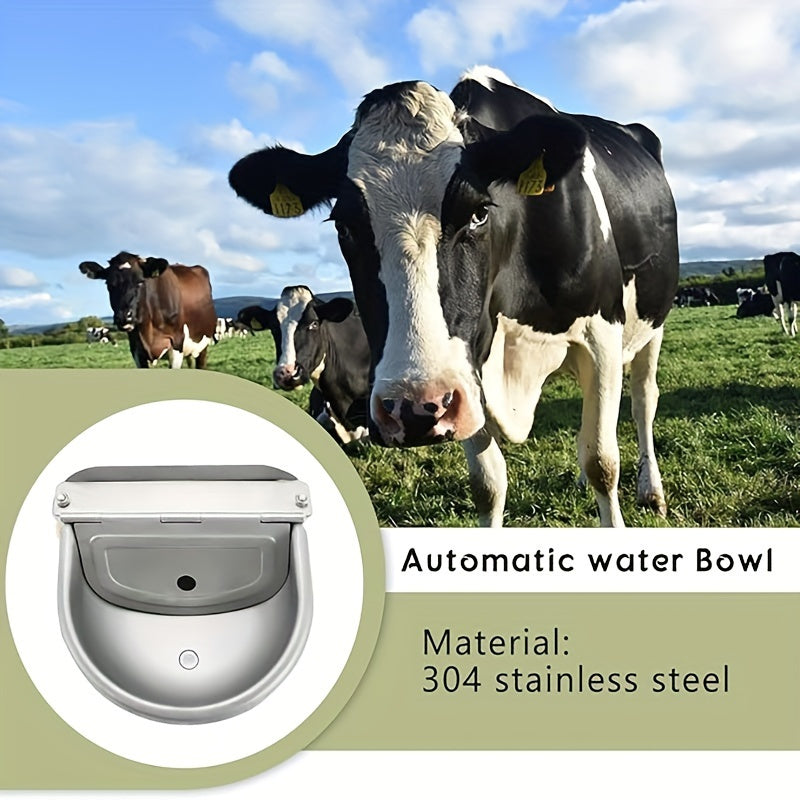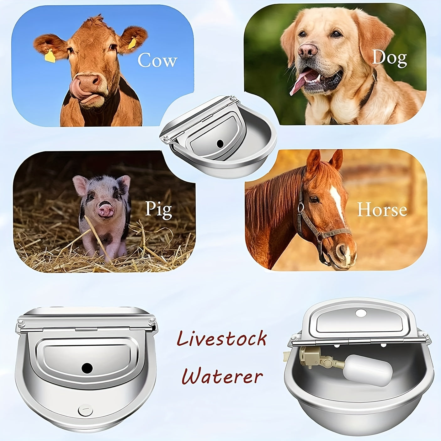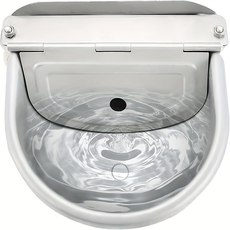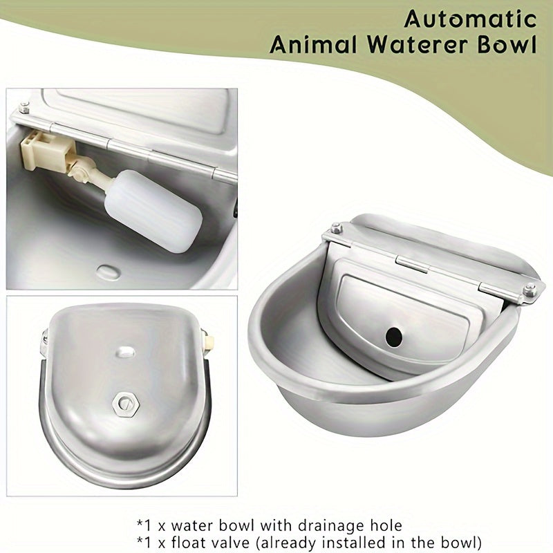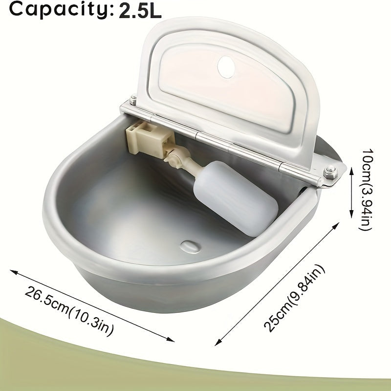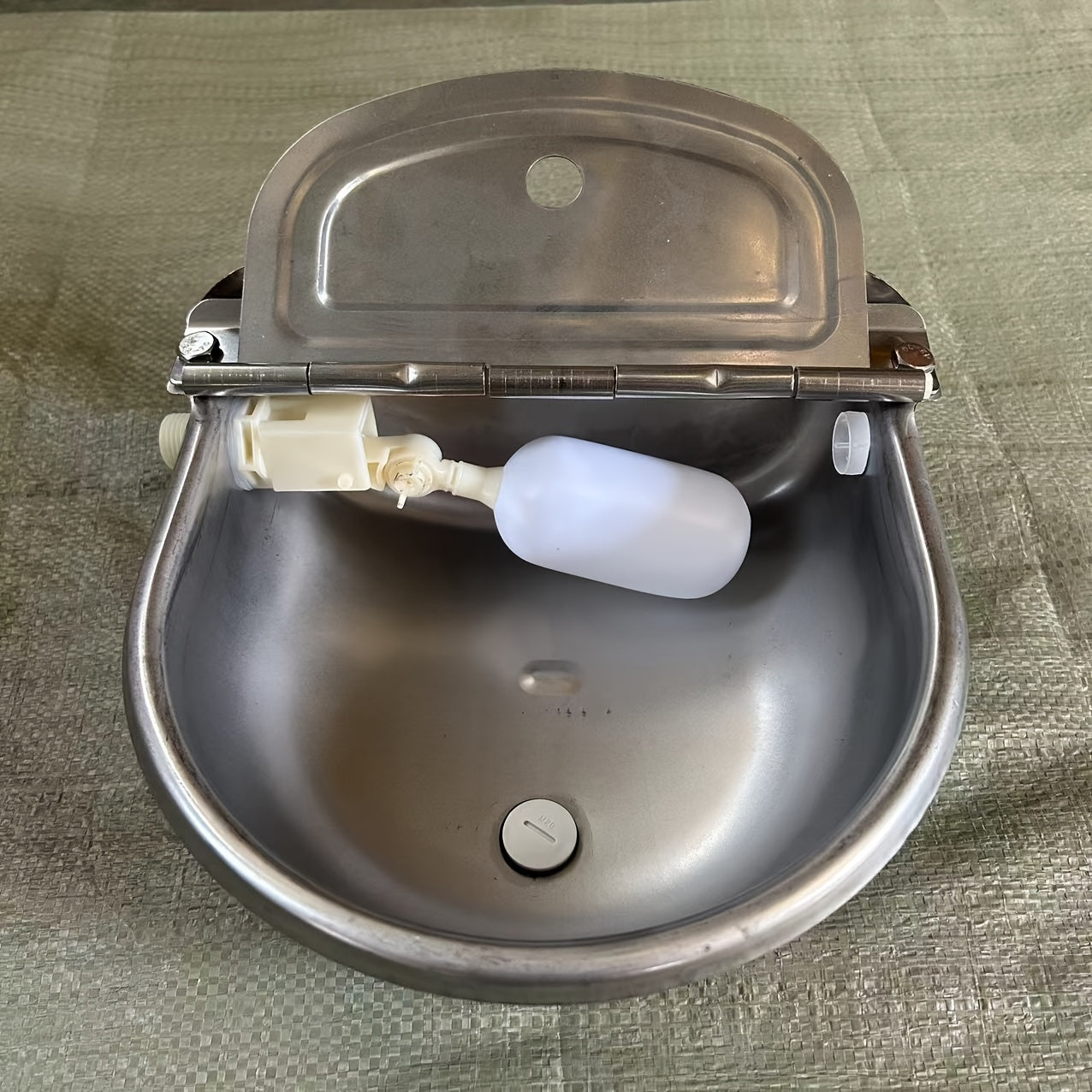 Katta sig'imli zanglamas po'latdan yasalgan avtomatik uy hayvonlari uchun suv idishi, suzuvchi valf va drenaj bilan, otlar, sigirlar, qo'ylar va itlar uchun mos. Mustahkam va batareyalarni talab qilmaydi.