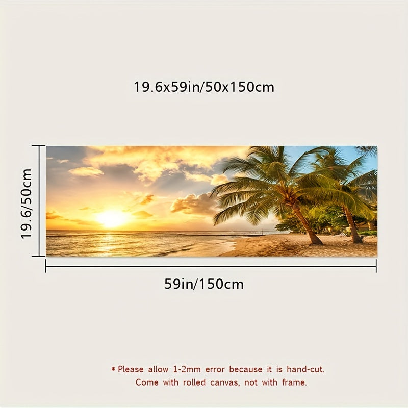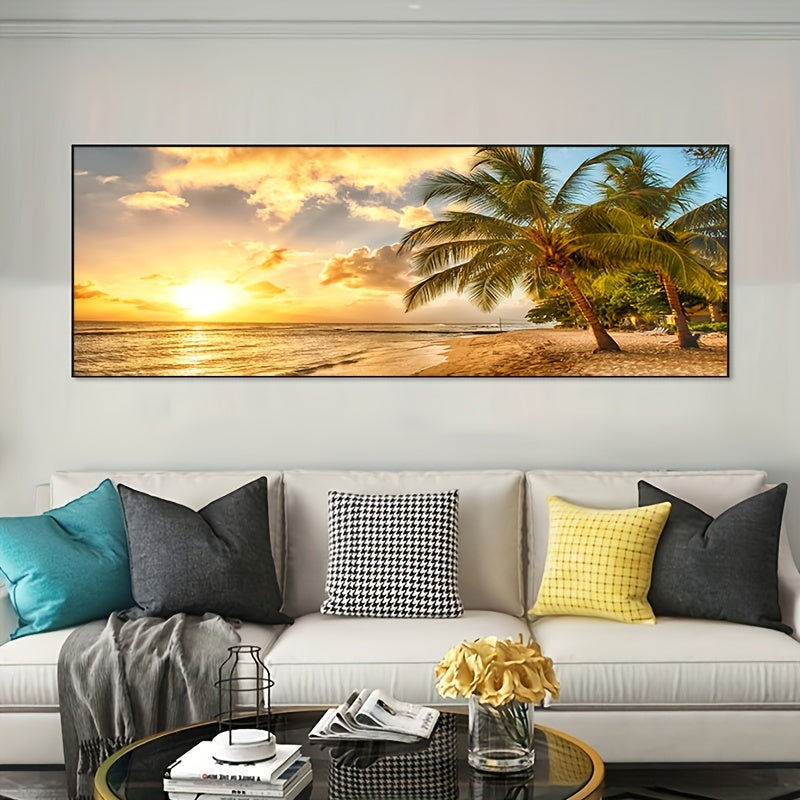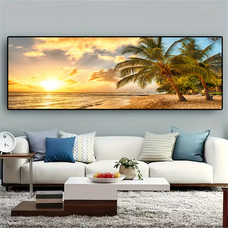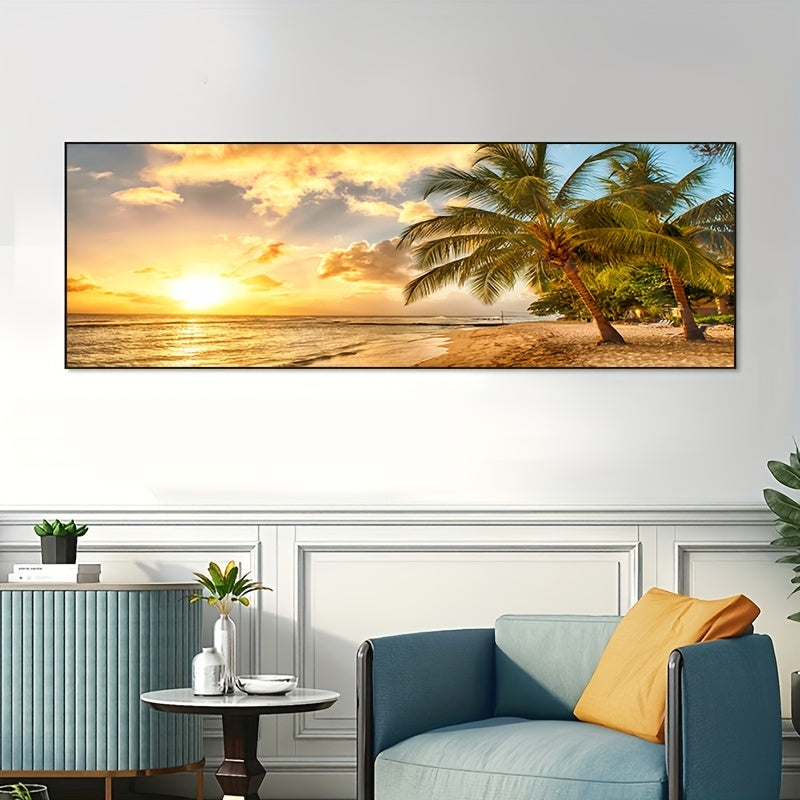 Katta zamonaviy dengiz manzarali qirg'oq kanvas rasmida palma daraxti, okean va quyosh botishi tasvirlangan. Mehmonxona bezatish uchun mukammal. Ramka kiritilmagan.