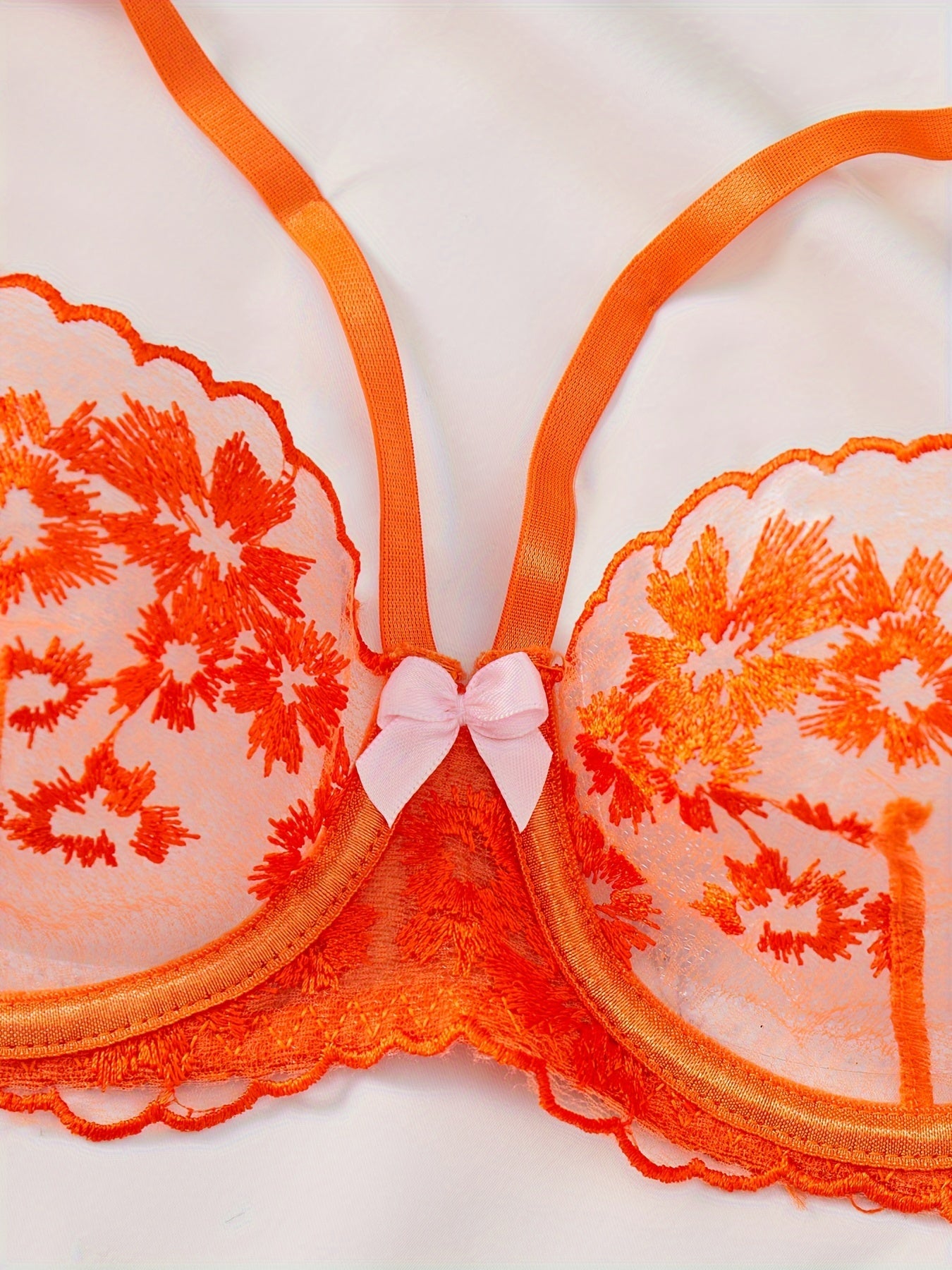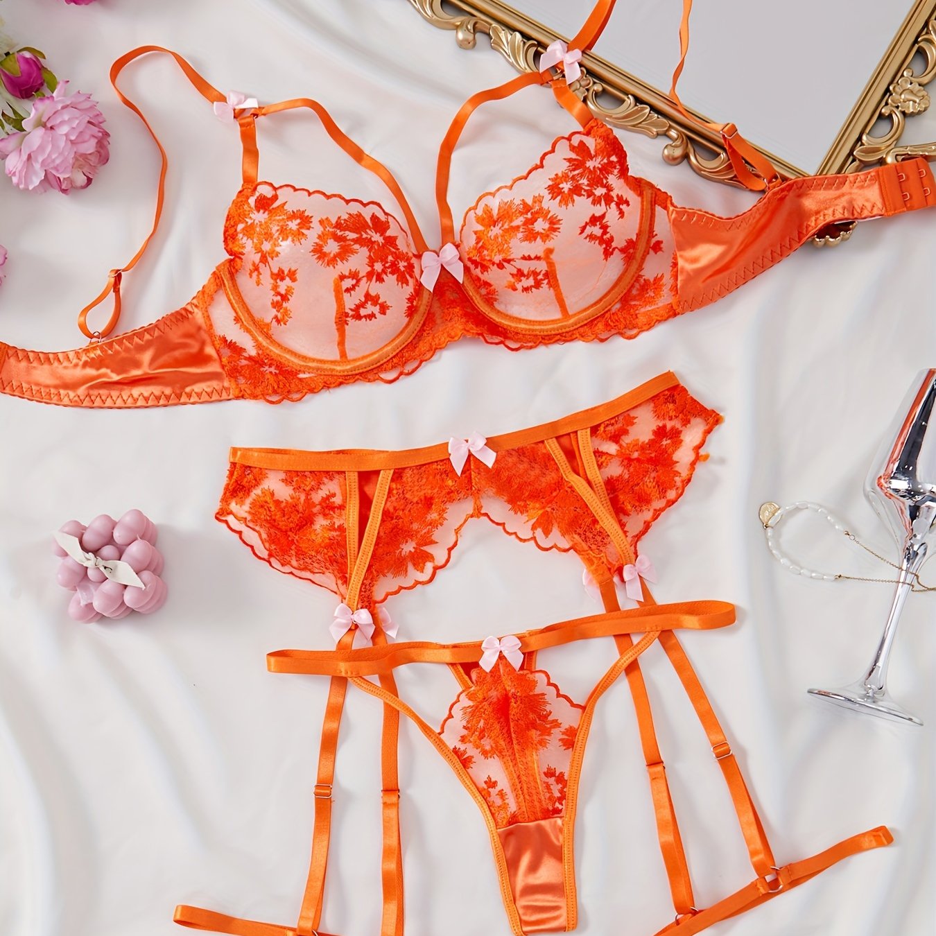 Yashil ip bilan tikilgan to'rli ichki kiyim to'plami, ayollar uchun belbog'li yarim chashka brass, thong va garter belbog'i.