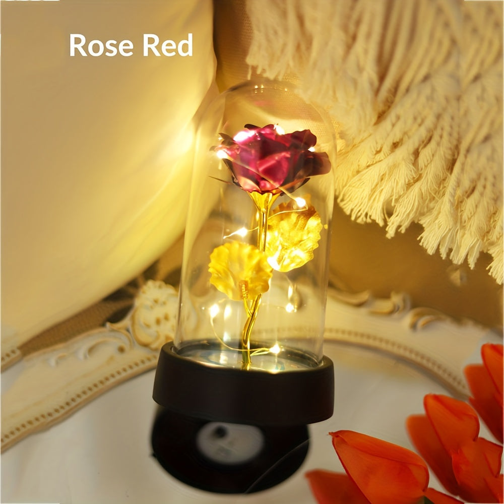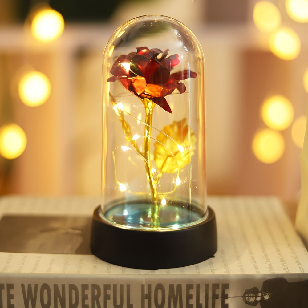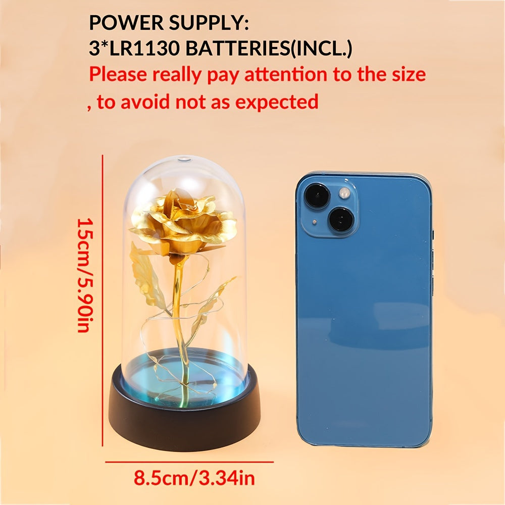 Oltin folga ro'za dizayni bilan LED gullar kechasi chirog'i, stolda joylashadigan lampochka, o'zgaruvchan nazorat bilan, yotoqxona bezatish uchun batareya bilan ishlaydi. 1 ta qayta zaryadlanmaydigan tugma batareyasi kiradi.