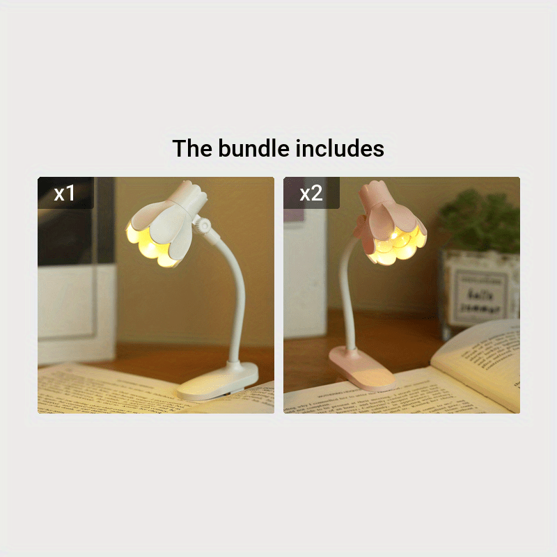 LED gullarga o'xshash kitob lampasi, yotgan holda o'qish yoki dekorativ ish stoli chirog'i sifatida mos keladi. Portativ va sozlanadigan quloq, batareyalar kiritilgan.