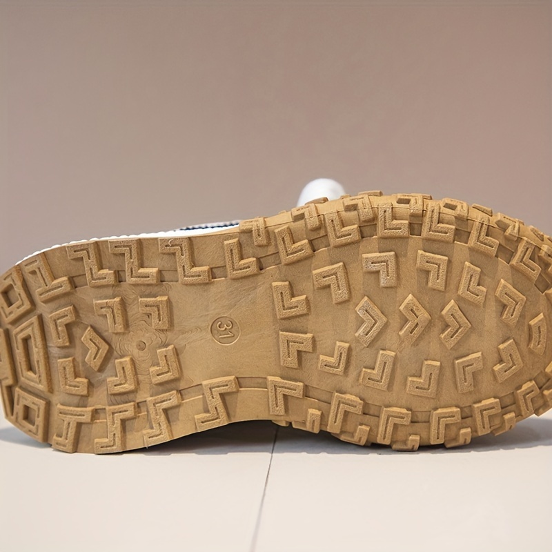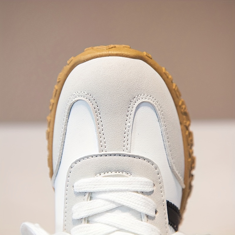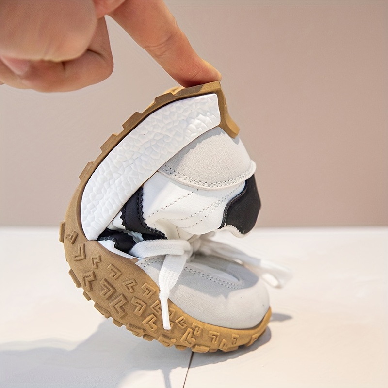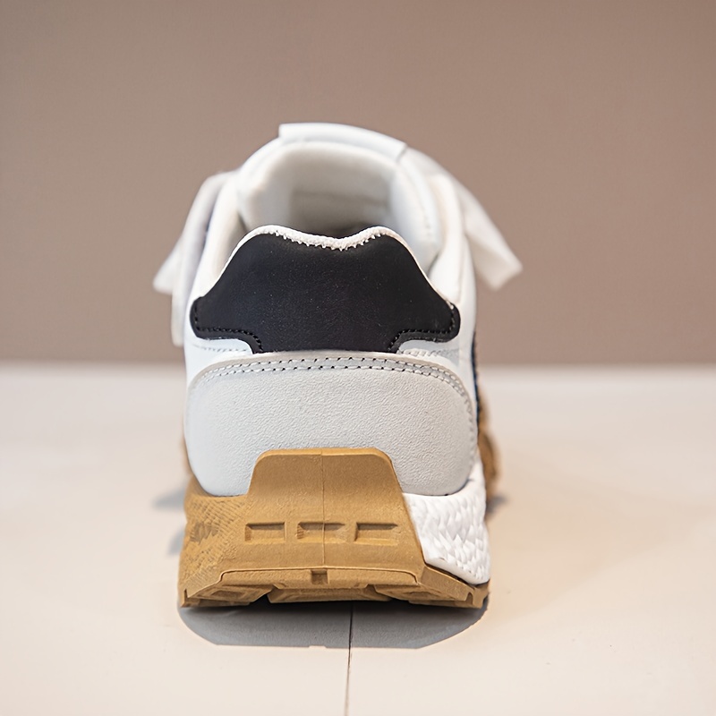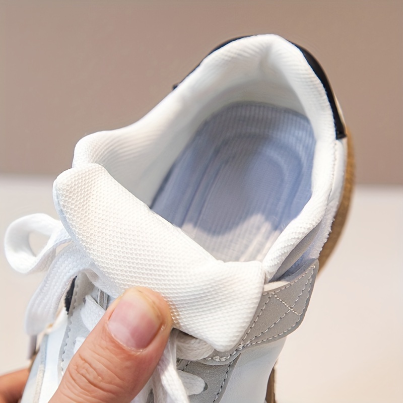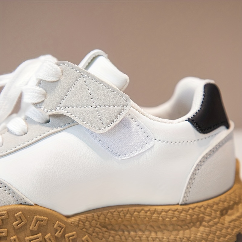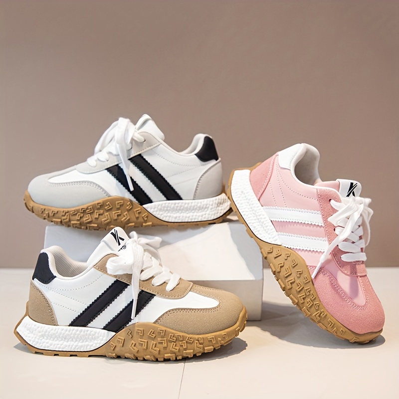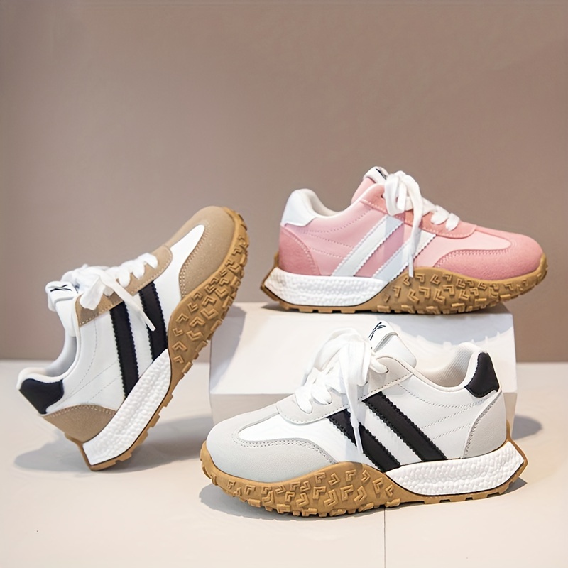 Yengil, nafas oladigan oq va qora/rozı chiziqli bolalar uchun krossovkalar, sirpanmaydigan kauchuk taglik bilan. Kundalik kiyimlar va ochiq havoda faoliyatlar uchun ideal.