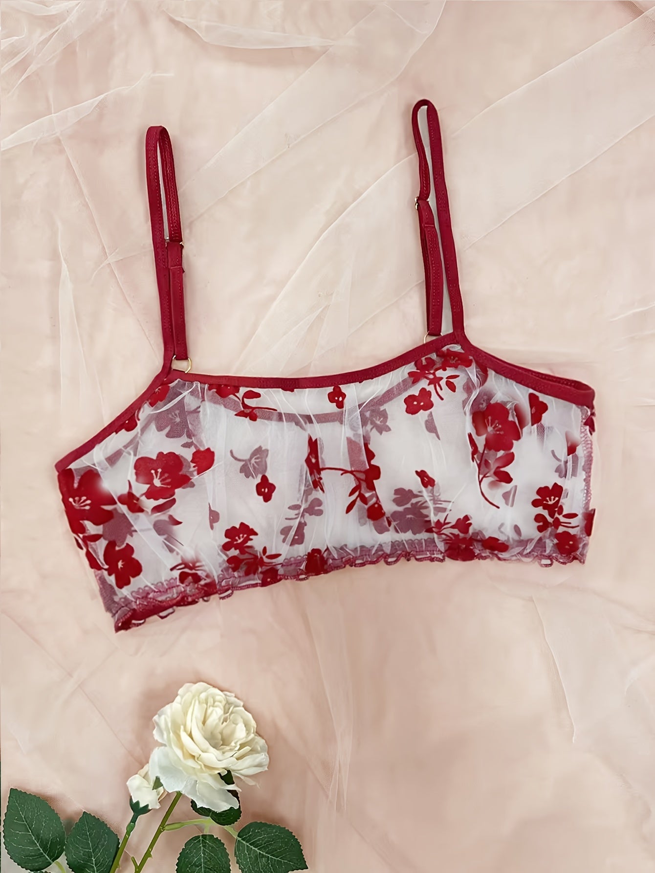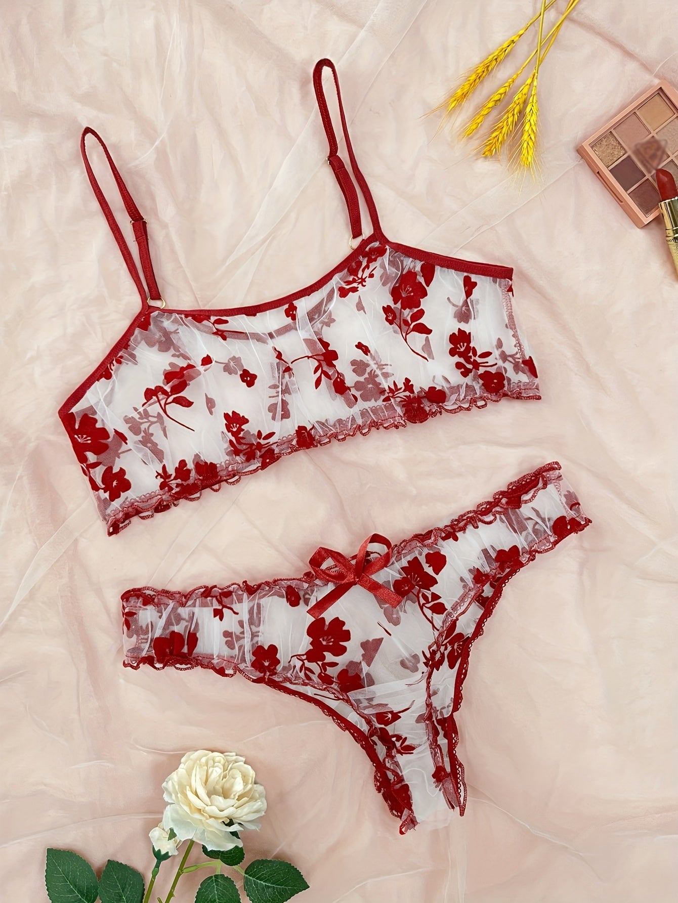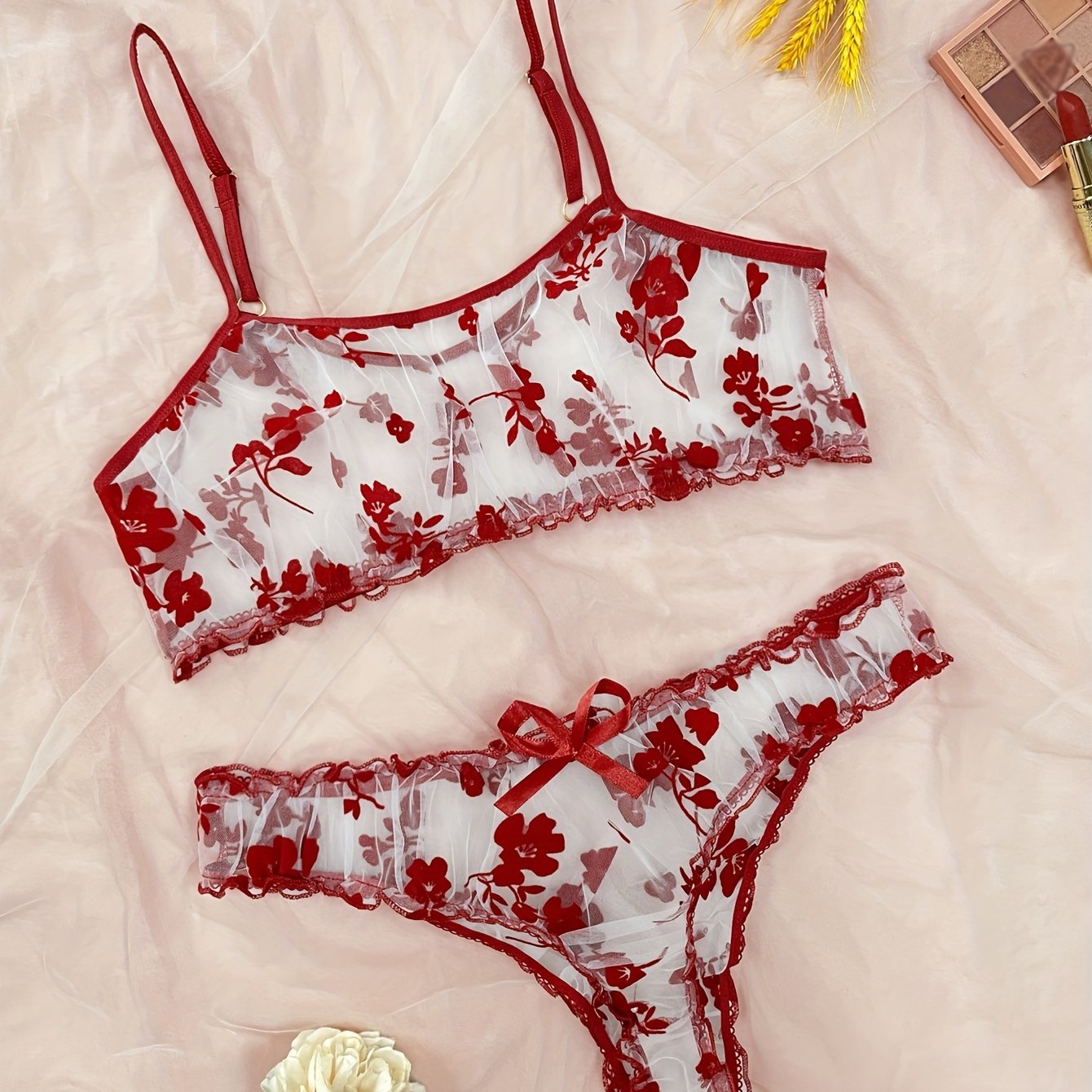 Gul naqshli tullali ichki kiyim to'plami, ko'rinadigan kamonli brassier va jozibali thong.