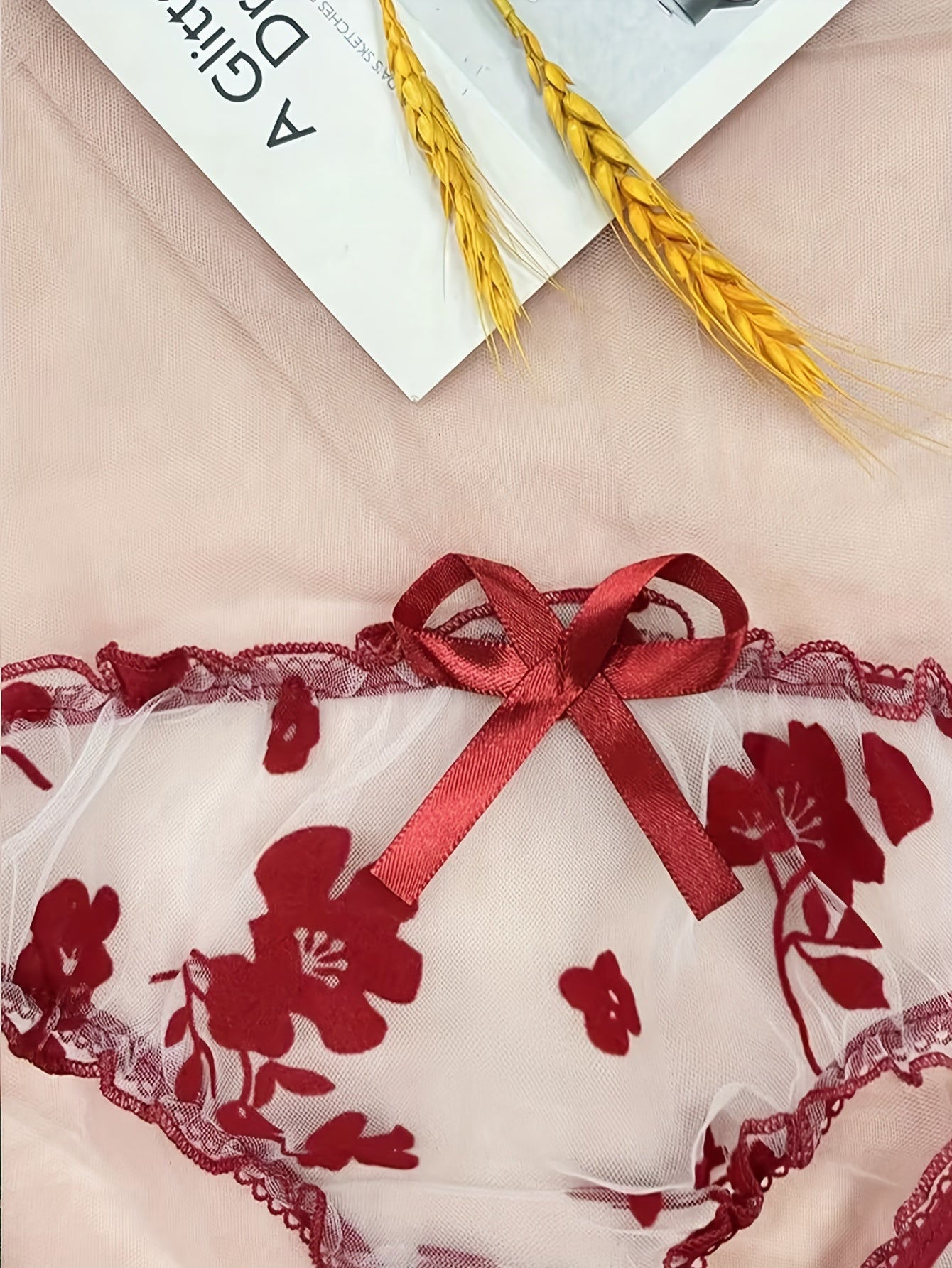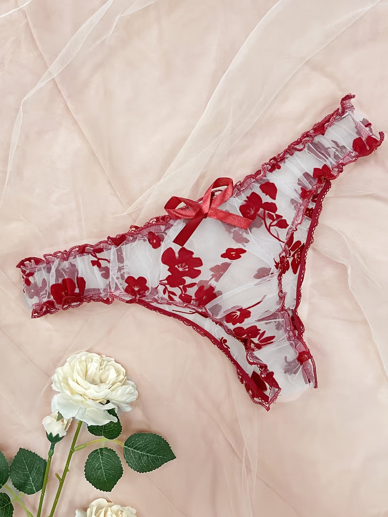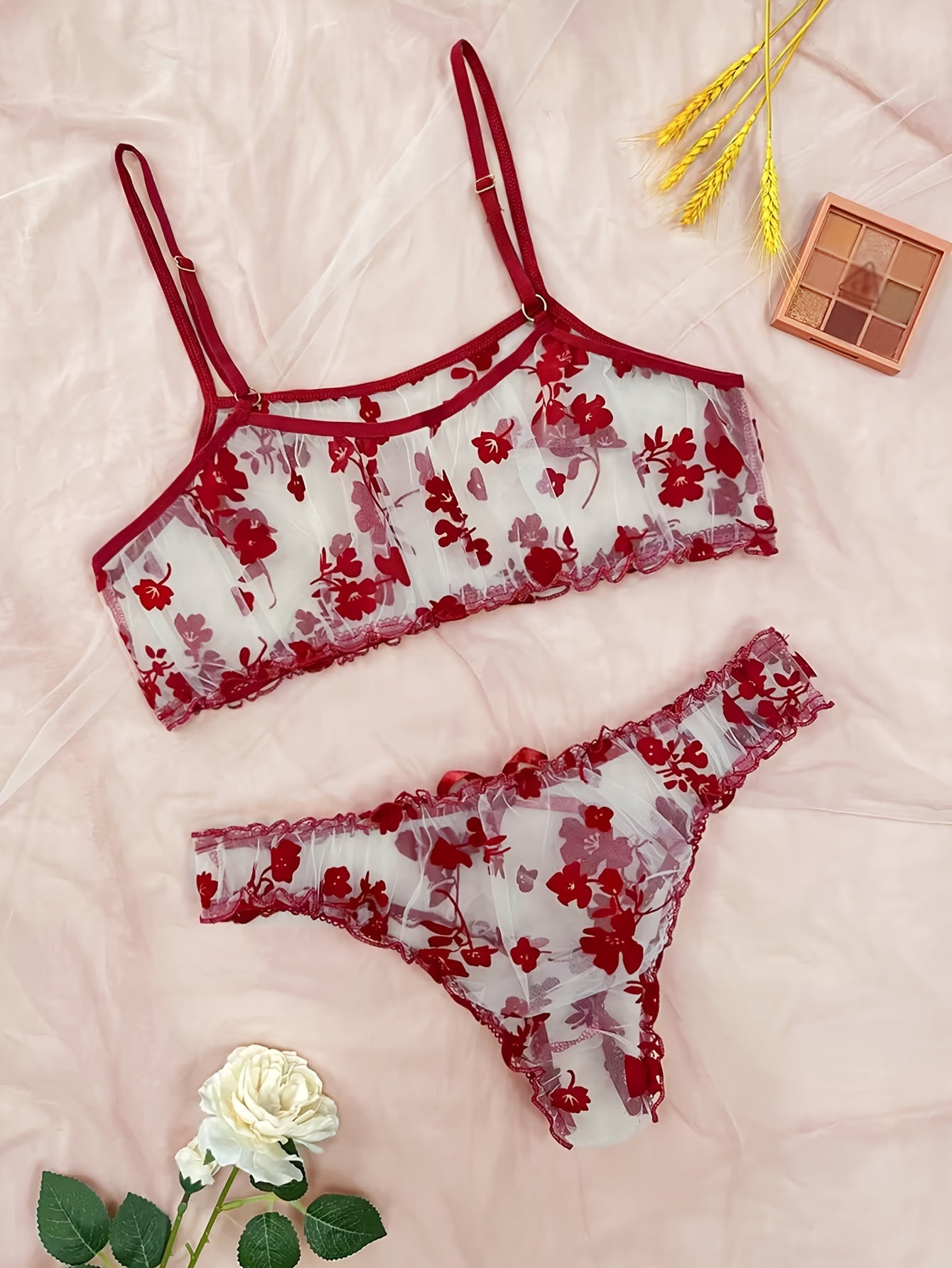 Gul naqshli tullali ichki kiyim to'plami, ko'rinadigan kamonli brassier va jozibali thong.