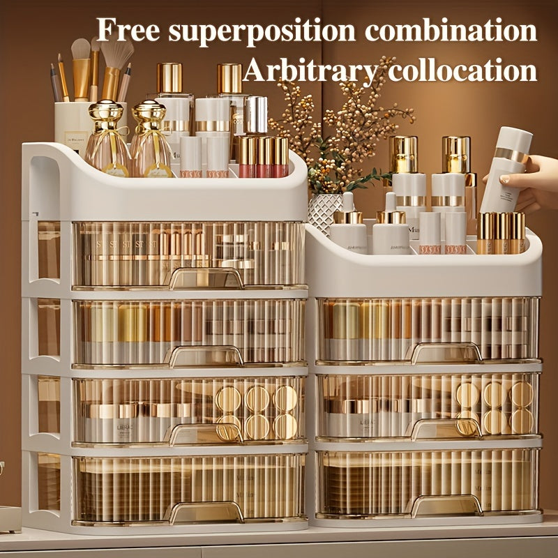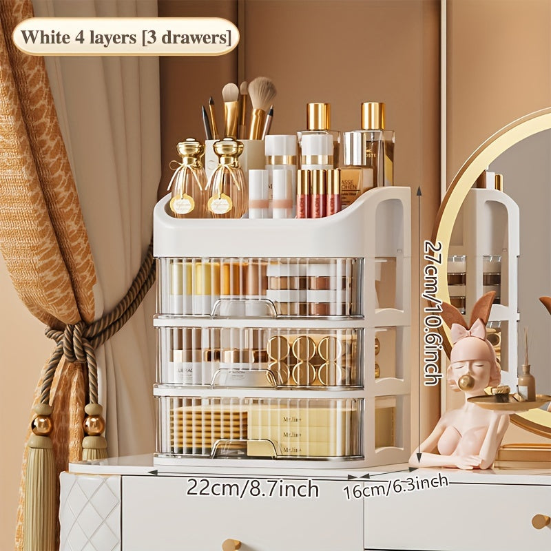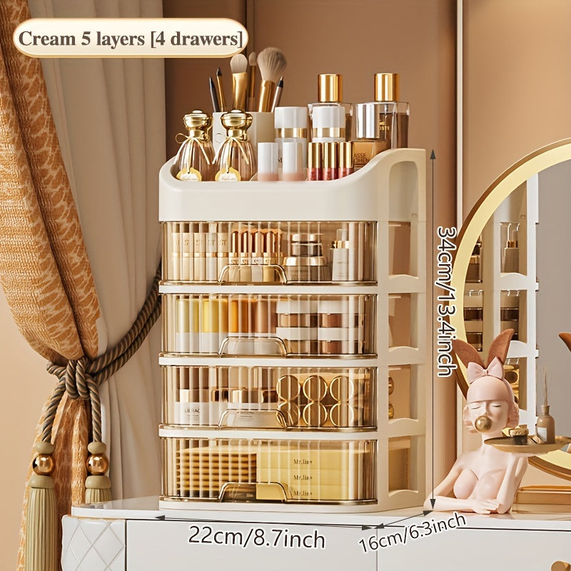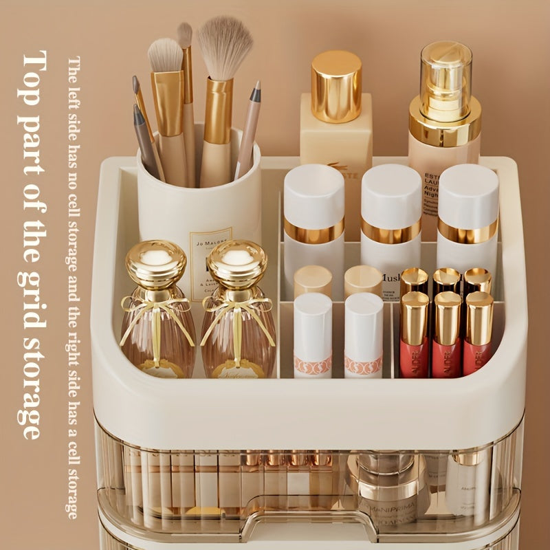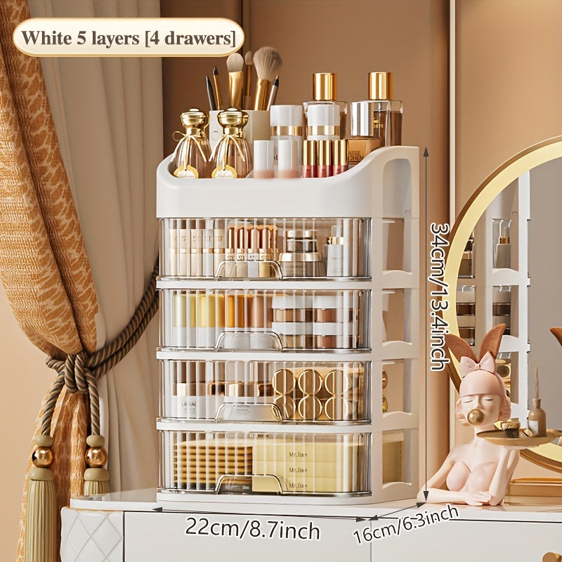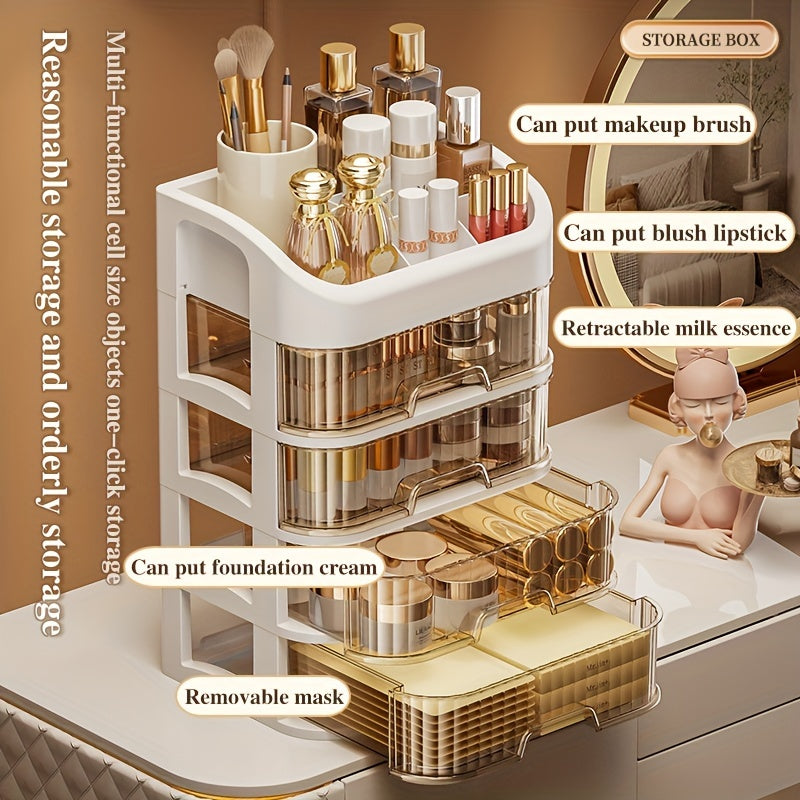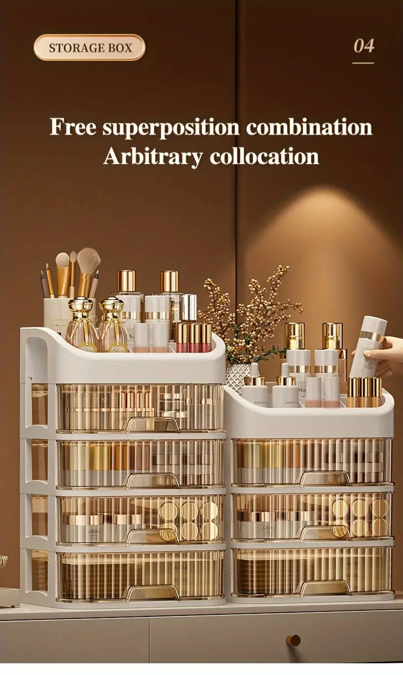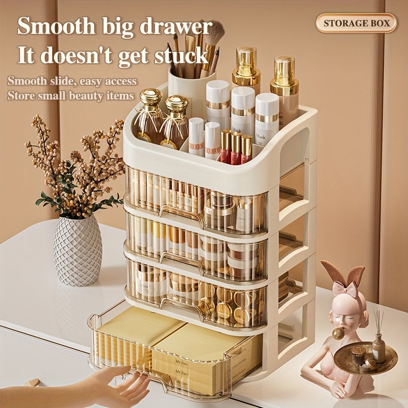Go'zal plastik saqlash qutisi, makiyaj, zargarlik buyumlari va ish stoli buyumlari uchun tortmalar bilan. Suv o'tkazmaydigan va Rojdestvo, Sevgi kuni va Xitoy Yangi yili kabi bayramlarda sovg'a berish uchun mukammal.