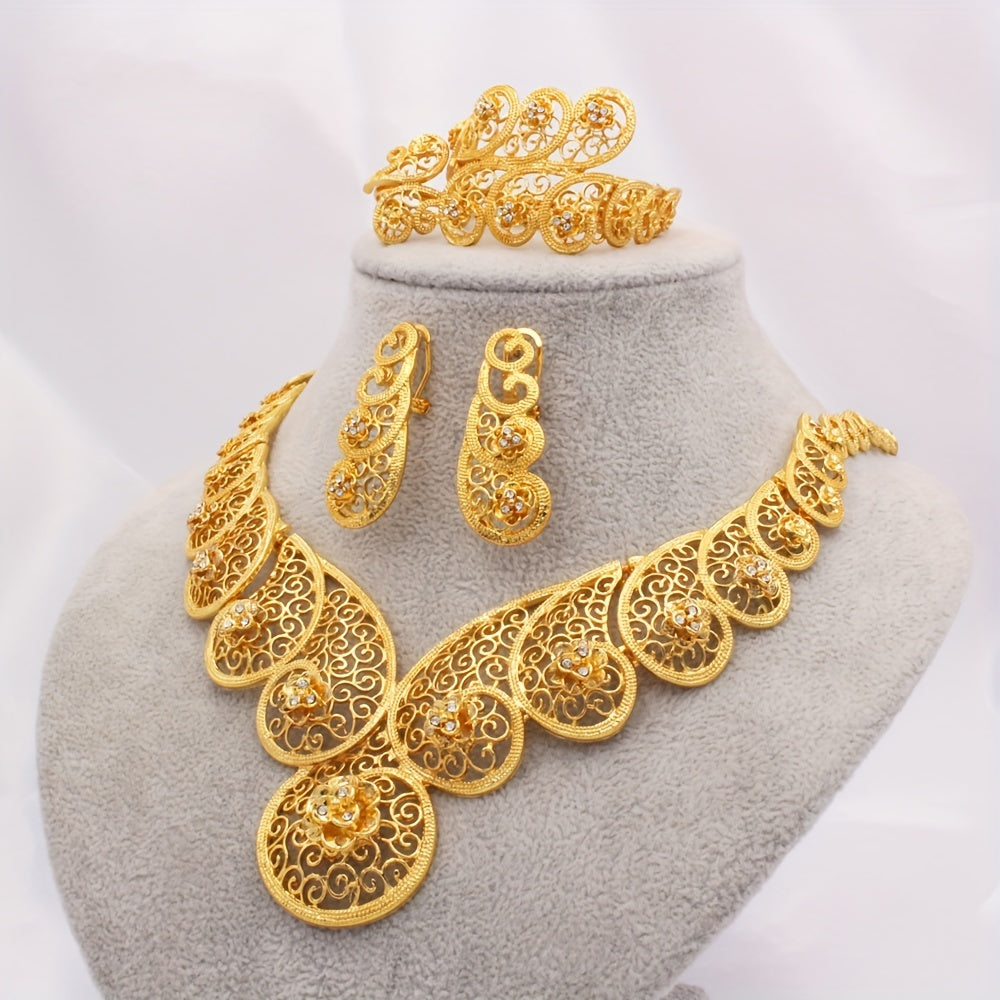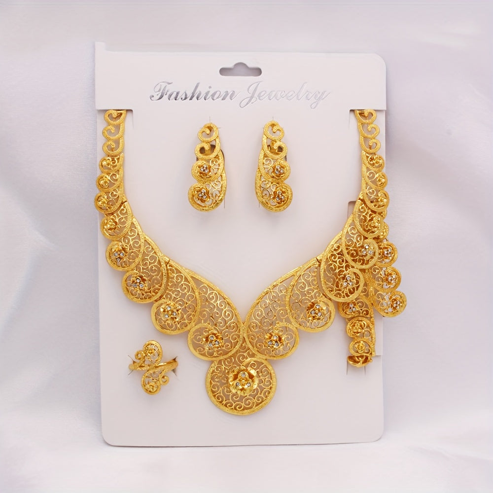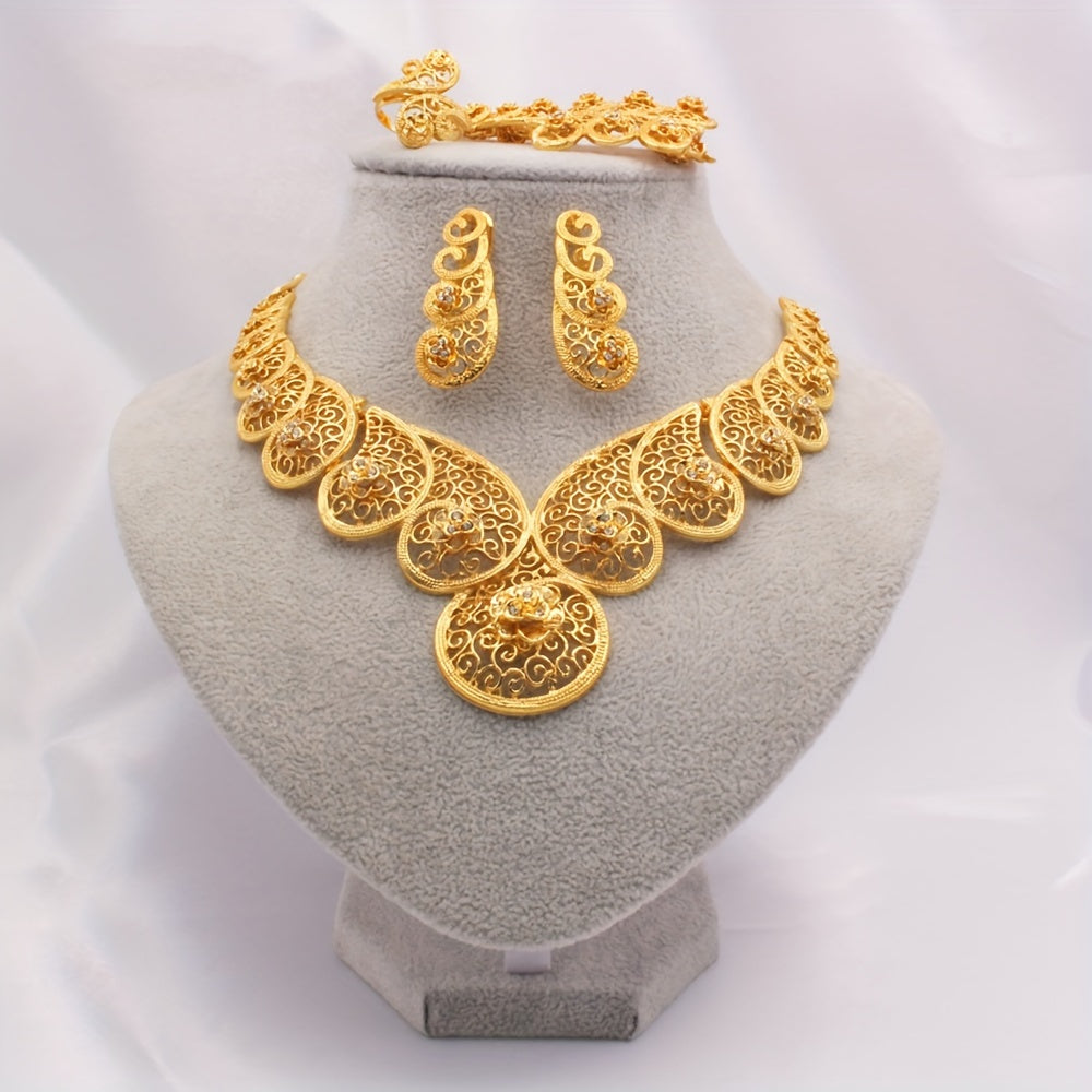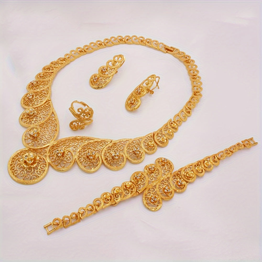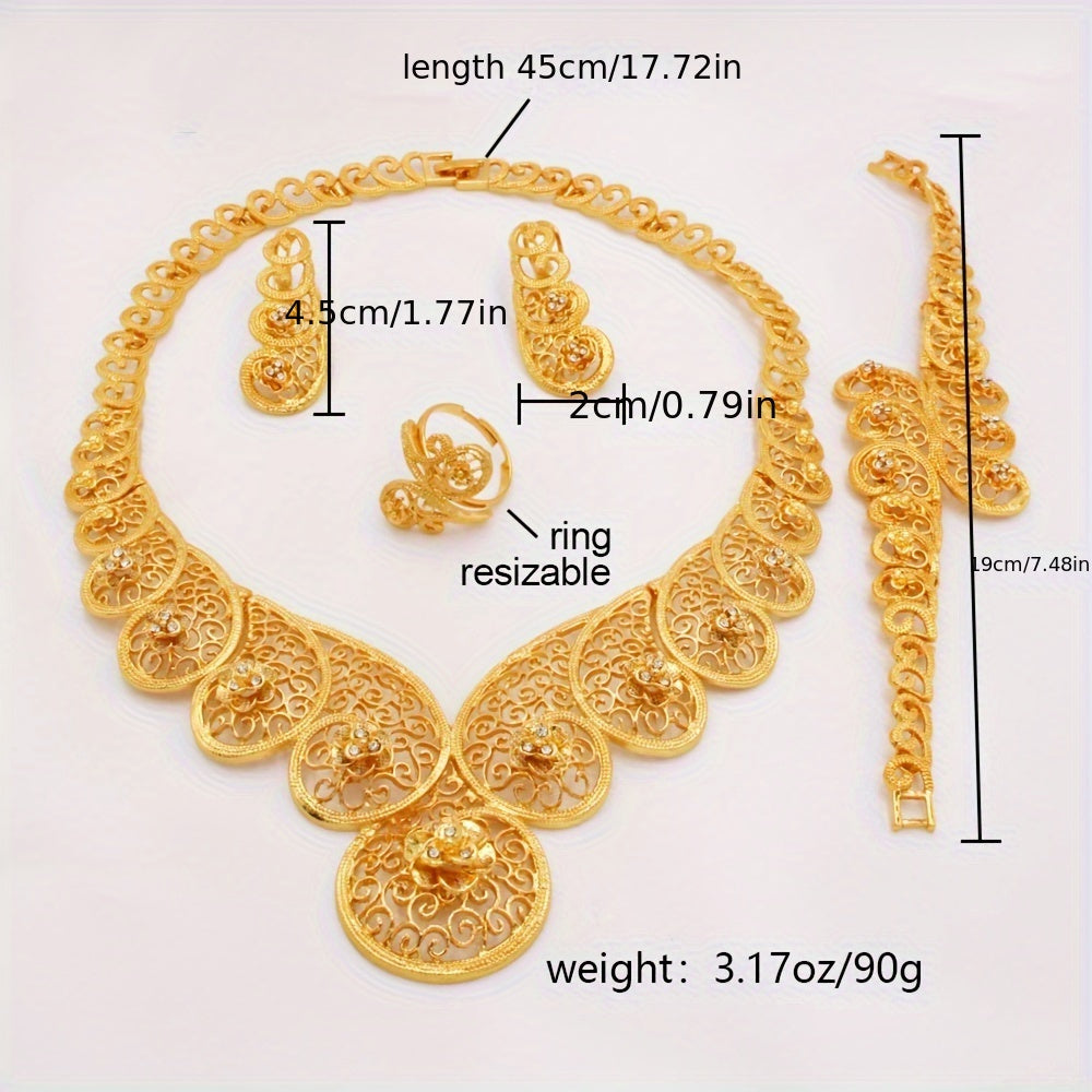 Zargarlik to'plami, 4 qismdan iborat JIAMILA qabilaviy uslubda, oltin qoplamali rux qotishmasidan tayyorlangan va rhinestone'lar bilan bezatilgan. Ushbu to'plam ayollar uchun mo'ljallangan bo'lib, kundalik kiyim va maxsus bayramlar uchun ideal.