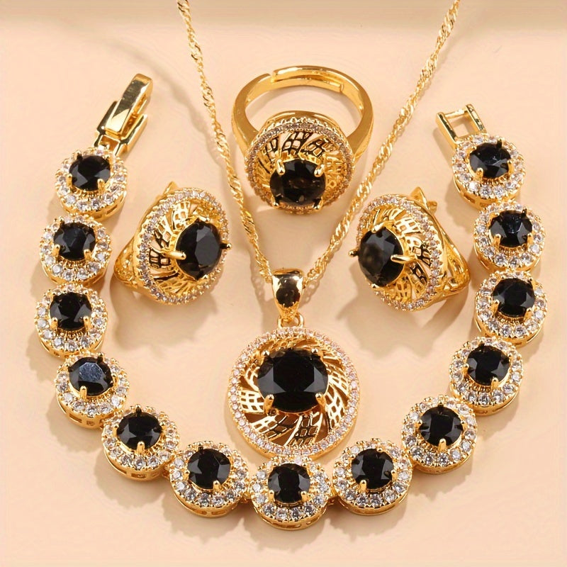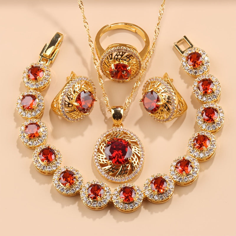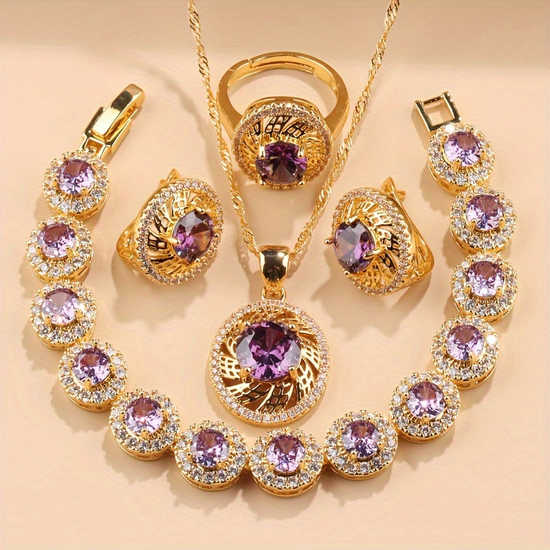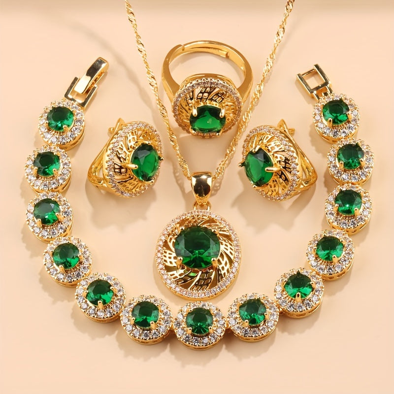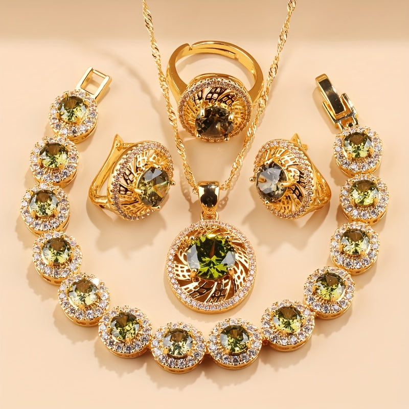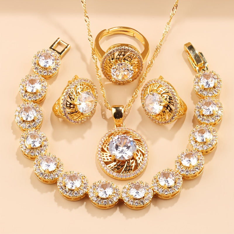 Nikoh zargarlik to'plami, 5 ta bo'lak, Kubik Sirkoniyalik taqinchoq, quloq taqinchoq, uzuk, bilaguzuk, yaproq dizayni, to'ylar va partiyalar uchun