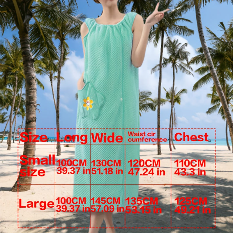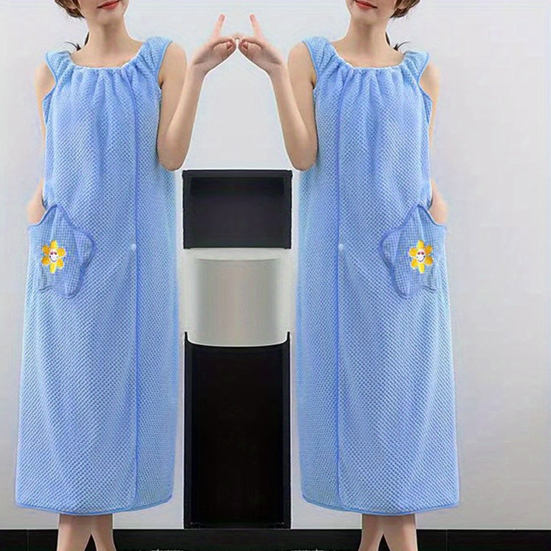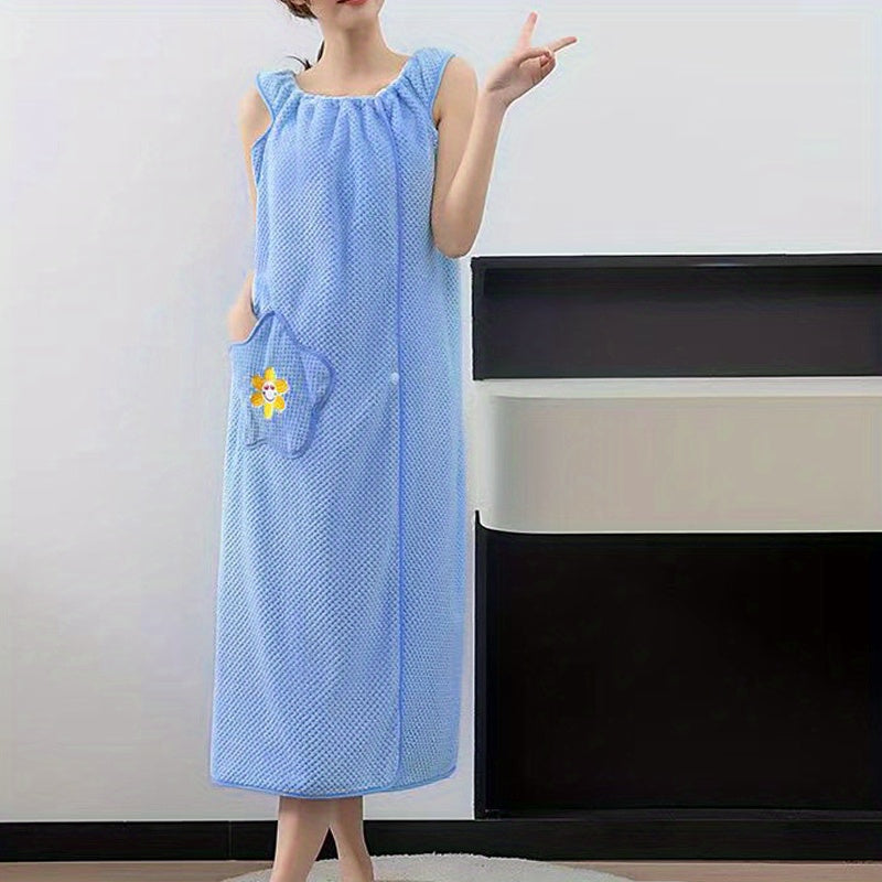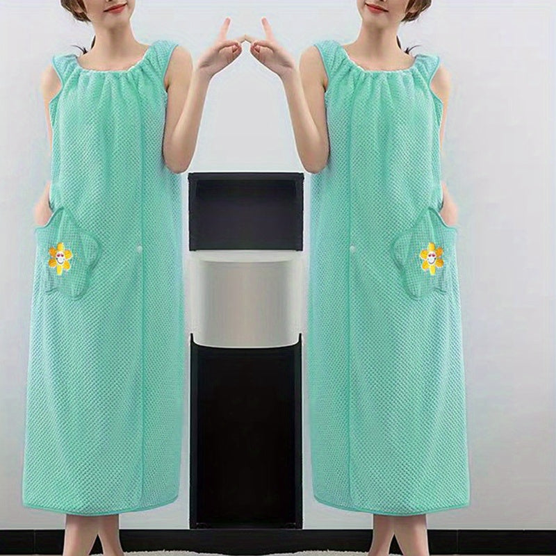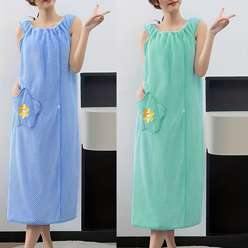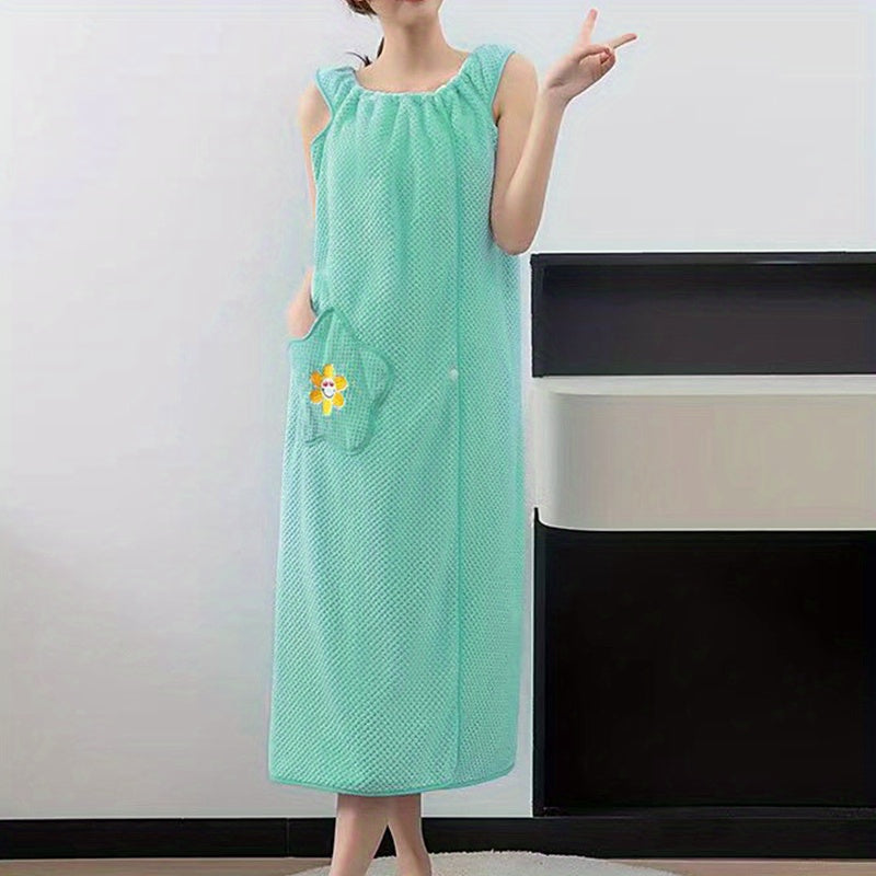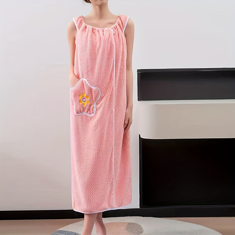 Hashamatli koral fliys ayollar uchun hammom sochiq koftasi, qo'shimcha uzun, ultra-sorbent, yelkasiz va gullar bilan cho'ntakli. Uyda foydalanish uchun mukammal, ko'k yoki yashil rangda.