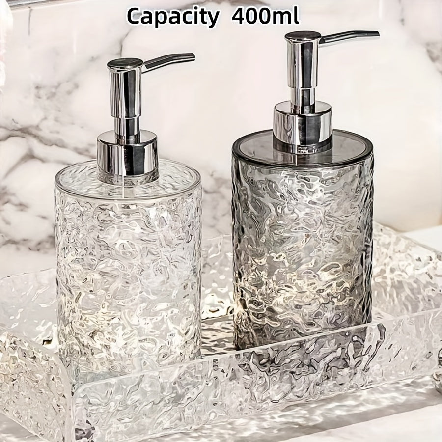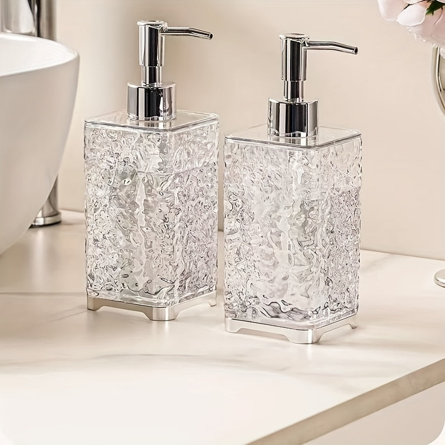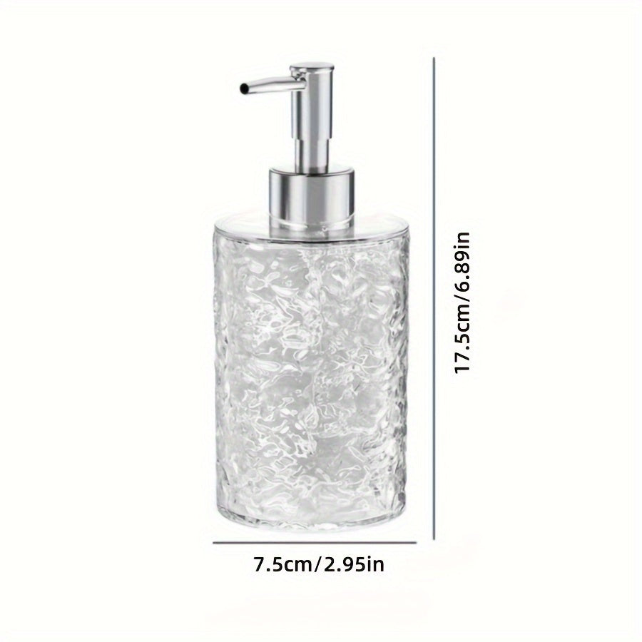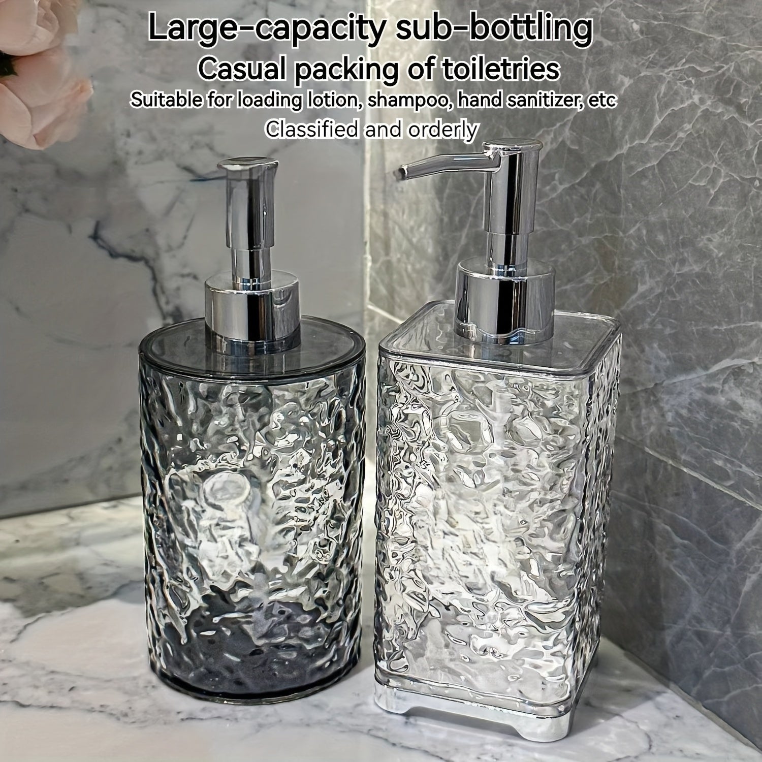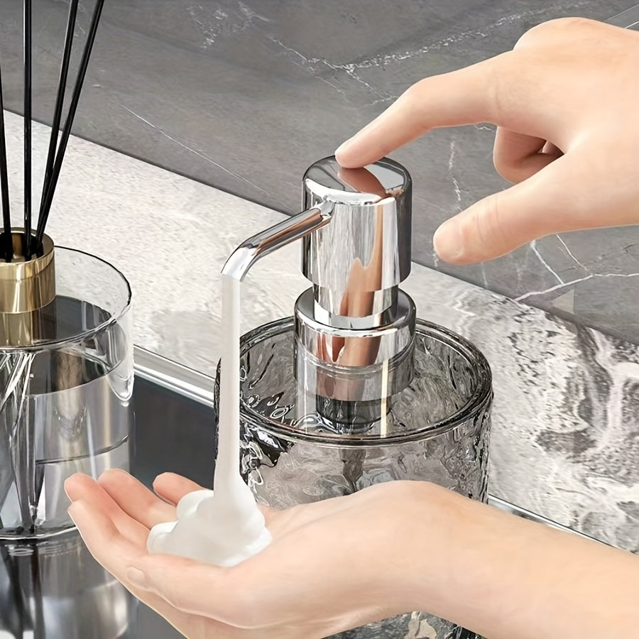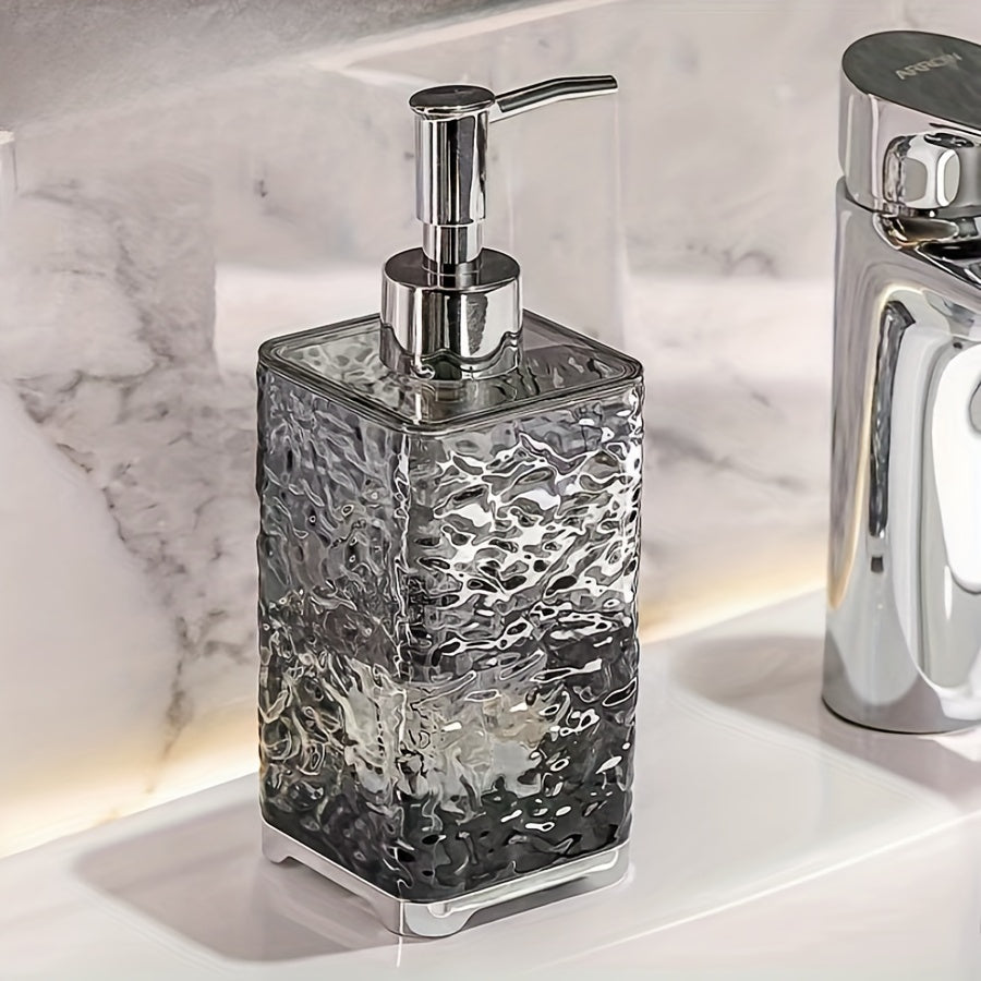 Qulay bosish pompasi bilan qayta to'ldiriladigan hashamatli qo'l sabun dispenseri. Mustahkam plastik konstruktsiya. Hammom yoki dush gel uchun ajoyib.