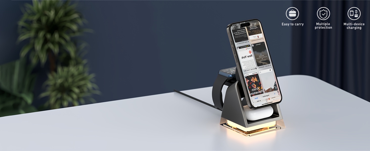 3-in-1 imkoniyatlari bilan magnit simsiz zaryadlovchi: mobil telefonlar uchun 15W, aqlli soatlar va simsiz quloqchinlar uchun 5W, LED teginish tungi chiroq xususiyatlariga ega.