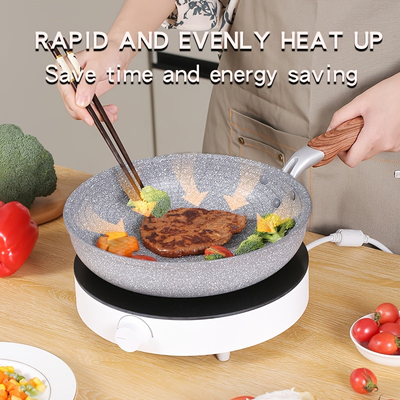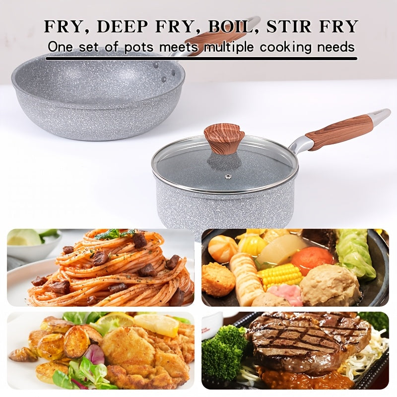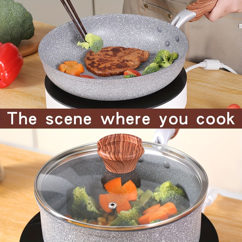 Maifan tosh non-stick oshxona to'plami, 3 ta qism, yog'och tutqichlar va shisha qopqog'lar bilan