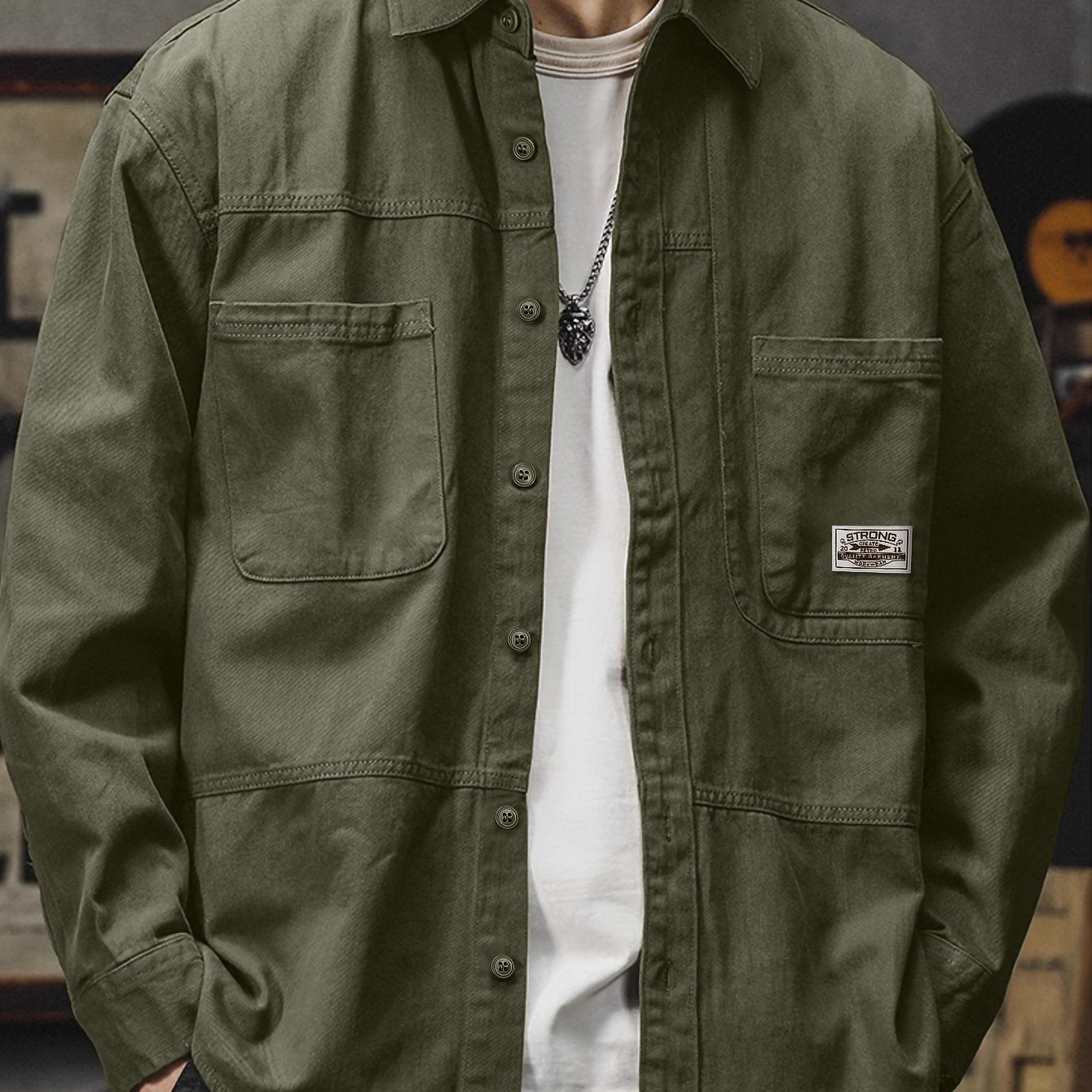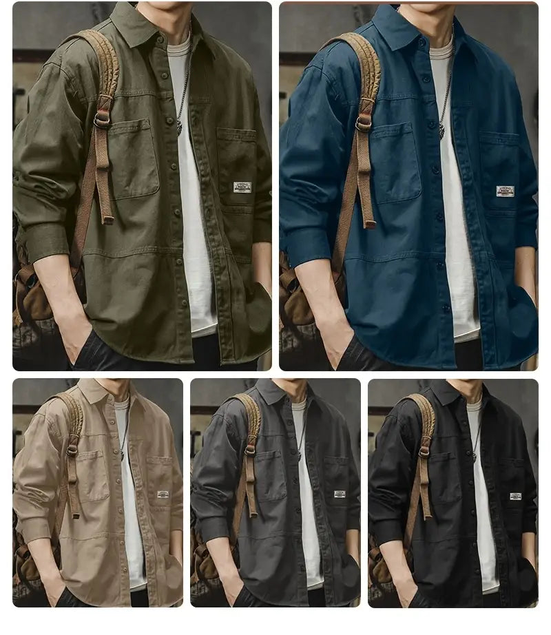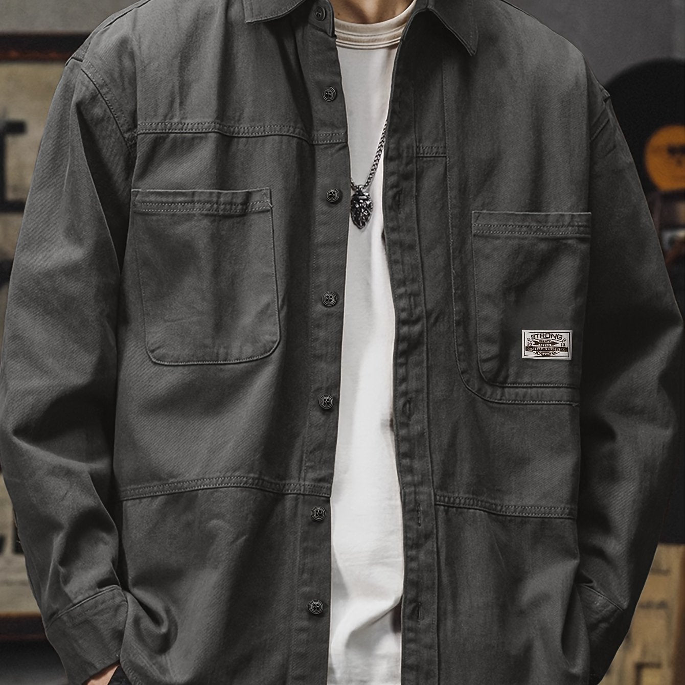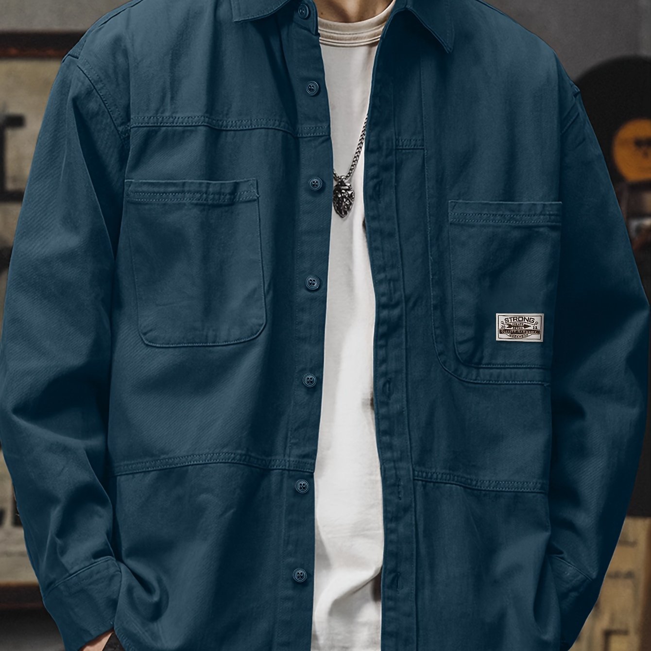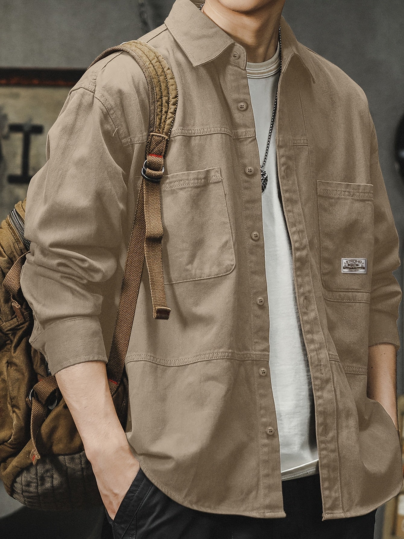 Erkaklar uchun 100% paxta kargo ko'ylagi, yorliq yamoqi bilan, bahor va kuz uchun mukammal, tasodifiy retro sovg'a