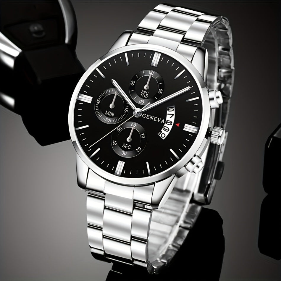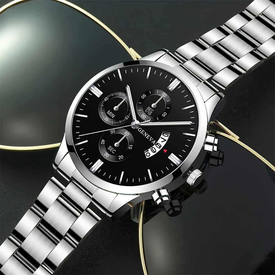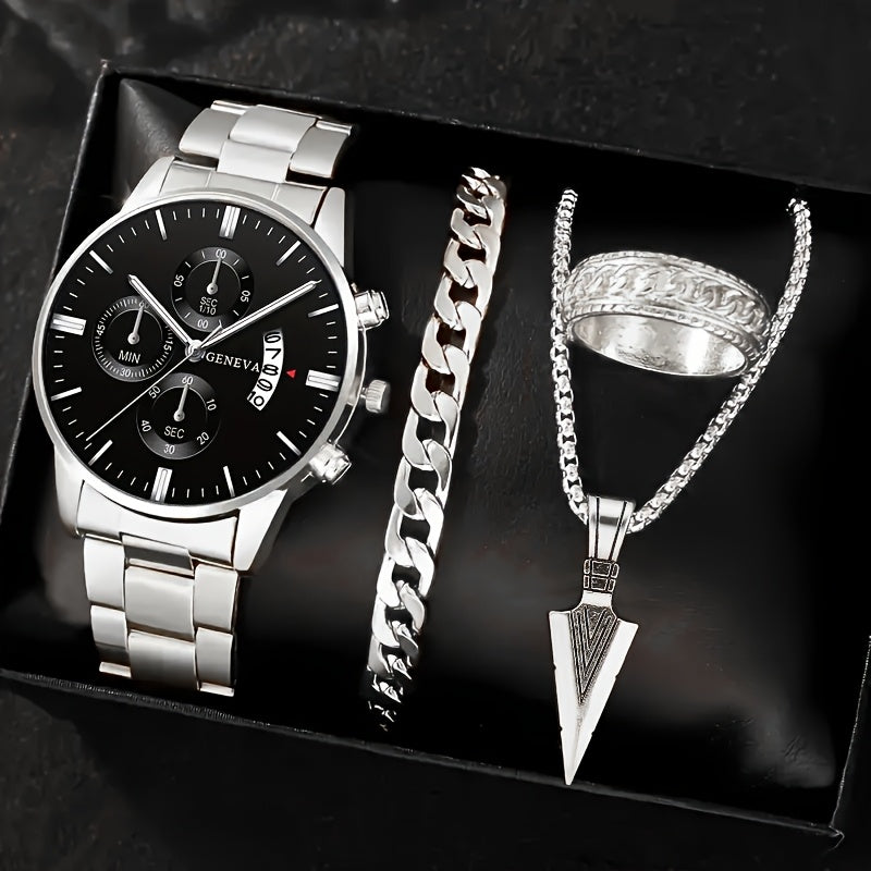 Erkaklar uchun 4 qismli moda sovg'a to'plami, kalendari bo'lgan zanglamas po'latdan yasalgan kvarts soat, o'q zanjiri, bilaguzuk va uzukni o'z ichiga oladi. Biznes tasodifiy kiyimlar uchun mukammal.
