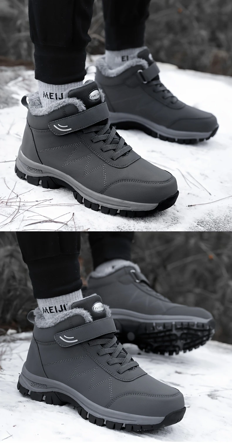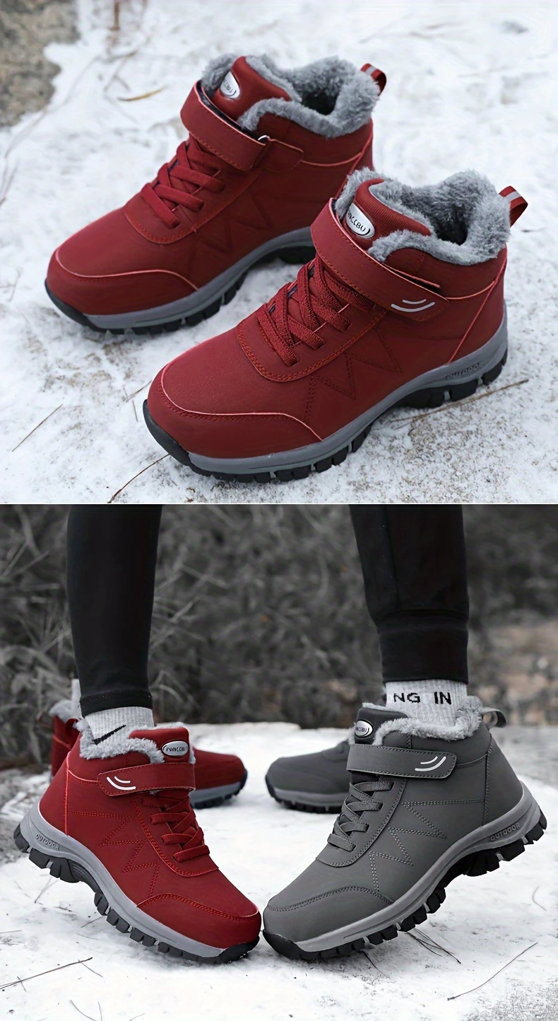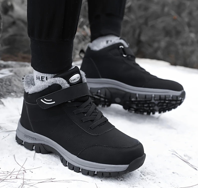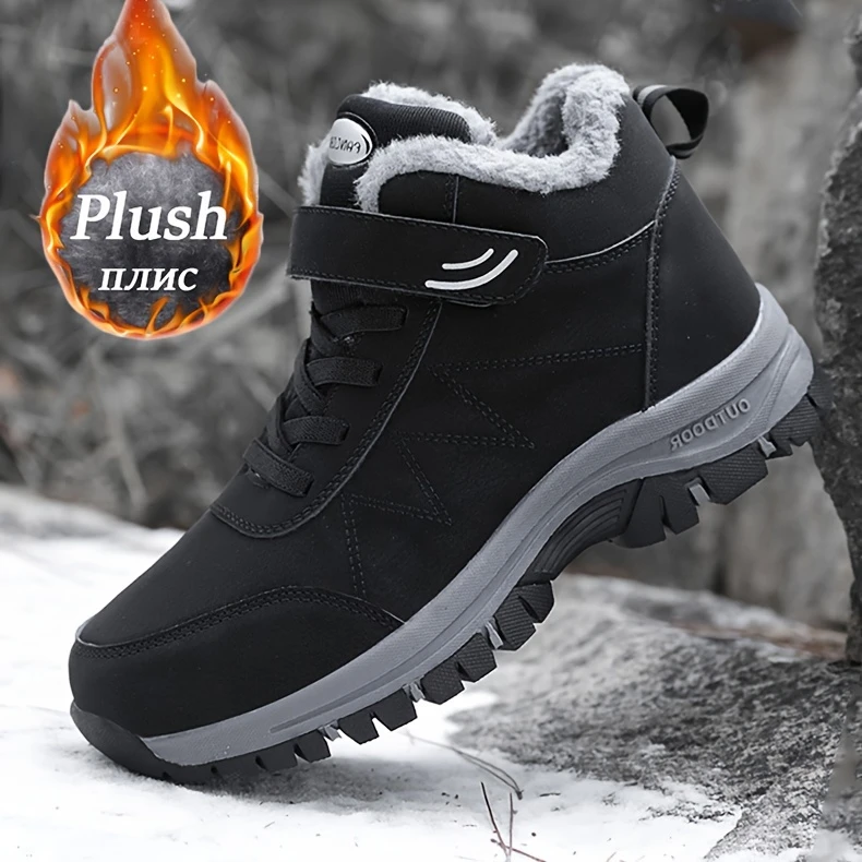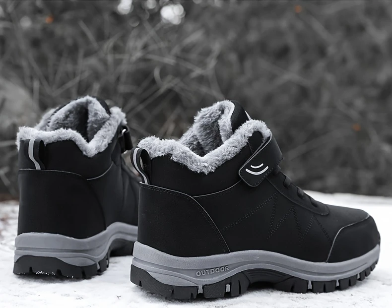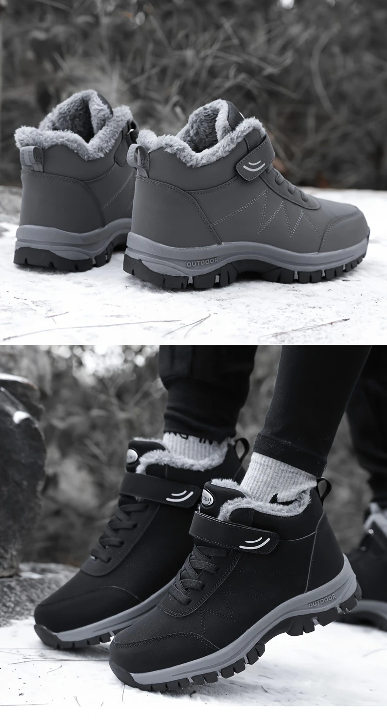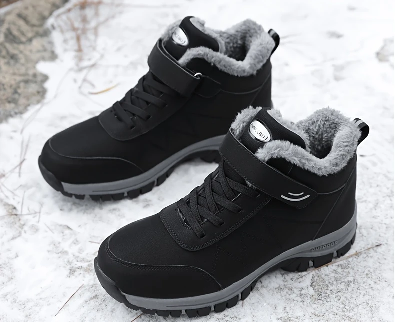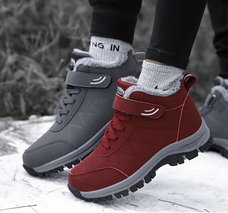 Erkaklar va ayollar uchun zamonaviy kulrang rangdagi plush qoplamali qor botinkalari, ilgich va lenta bilan yopish, sirpanmaydigan iz, sovuq ob-havo uchun issiq izolyatsiya. Norasmiy ochiq havoda kiyiladigan poyabzal.