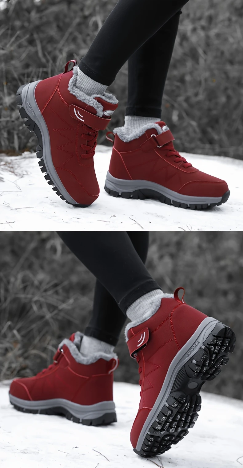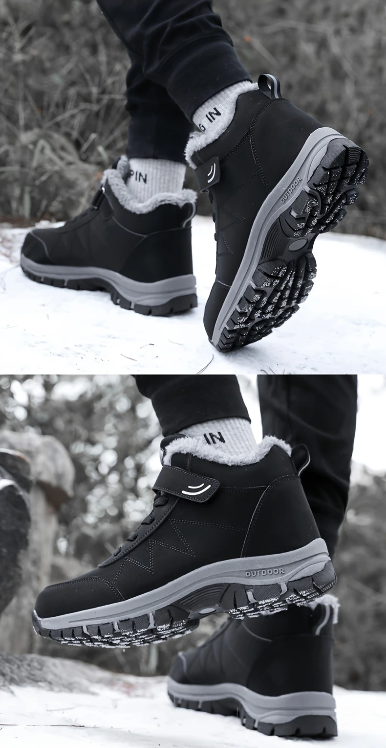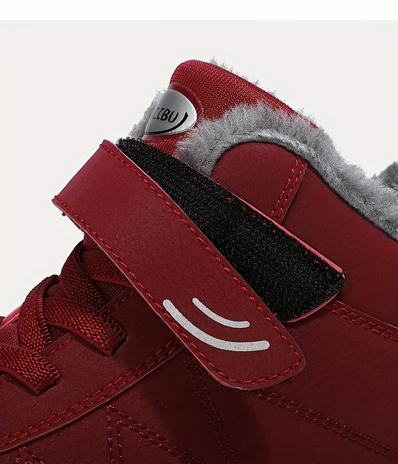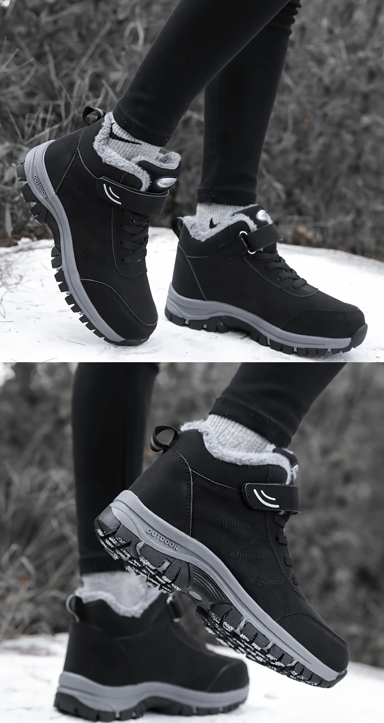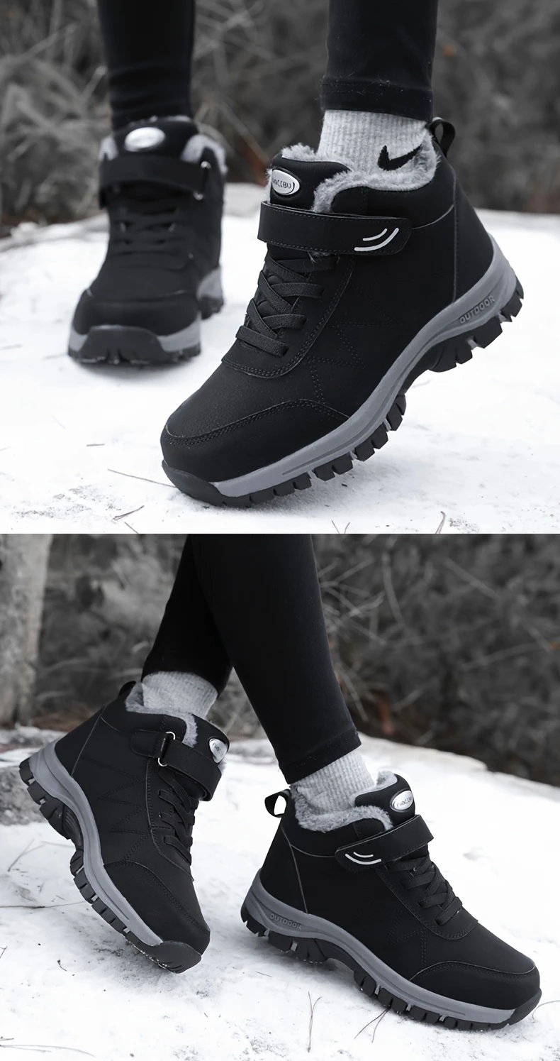 Erkaklar va ayollar uchun zamonaviy kulrang rangdagi plush qoplamali qor botinkalari, ilgich va lenta bilan yopish, sirpanmaydigan iz, sovuq ob-havo uchun issiq izolyatsiya. Norasmiy ochiq havoda kiyiladigan poyabzal.