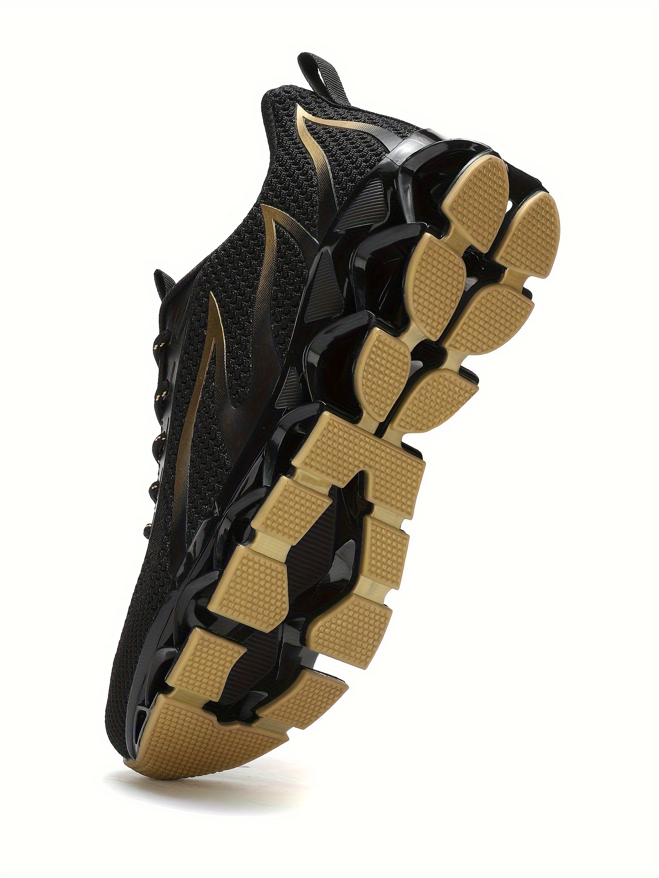 Erkaklar uchun sport krossovkalari, nafas oladigan to'r mato, sirpanmaydigan kauchuk taglik, bog'ichli yopilish, dumaloq barmoq va barcha mavsumlar uchun mos, qora va oltin rangda.