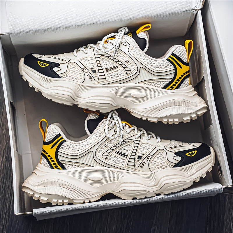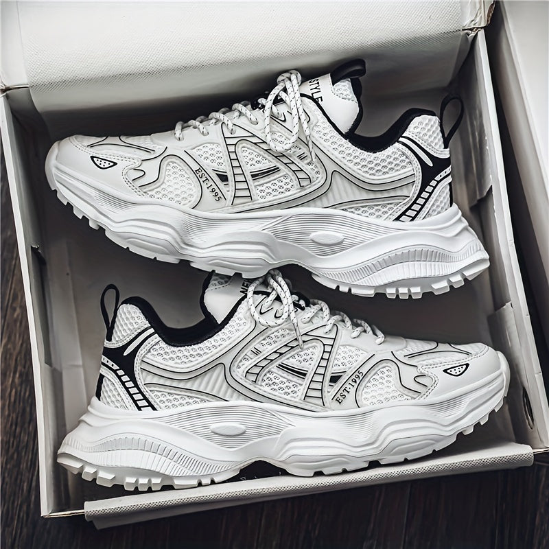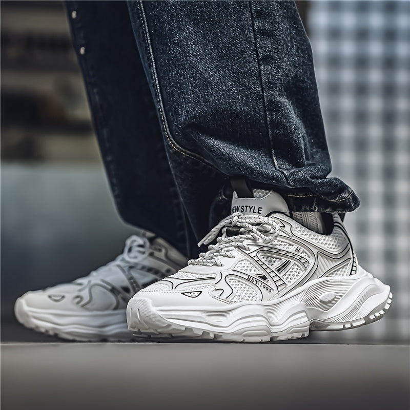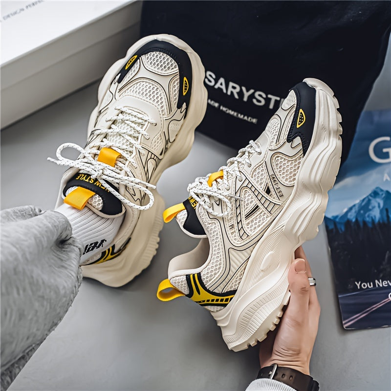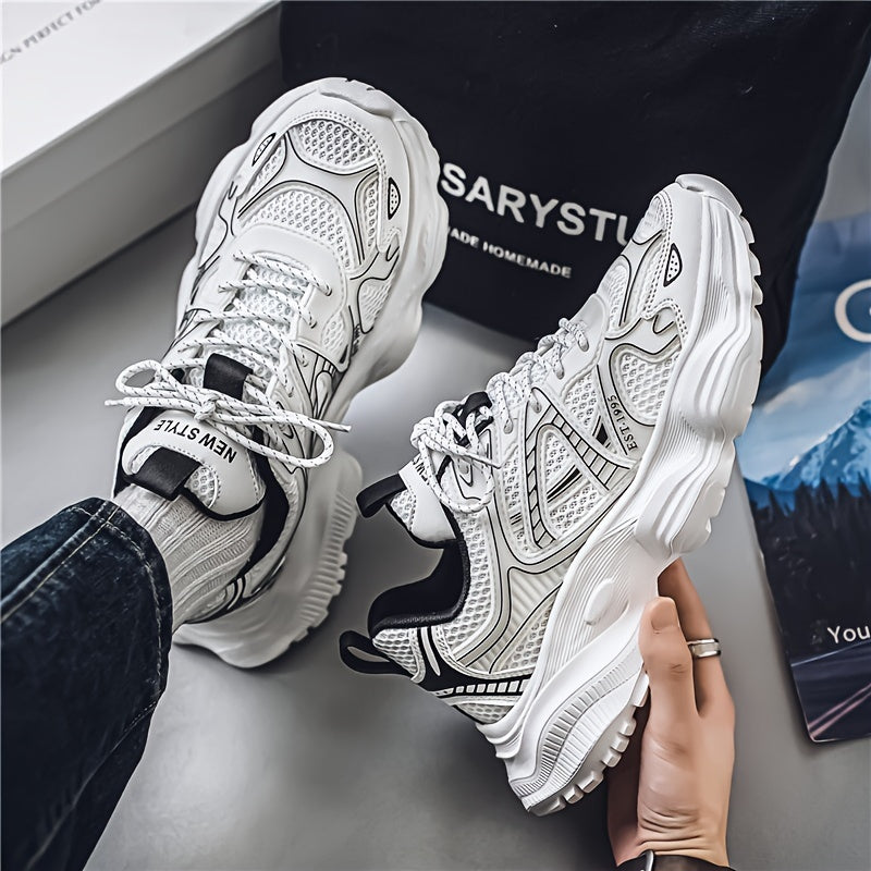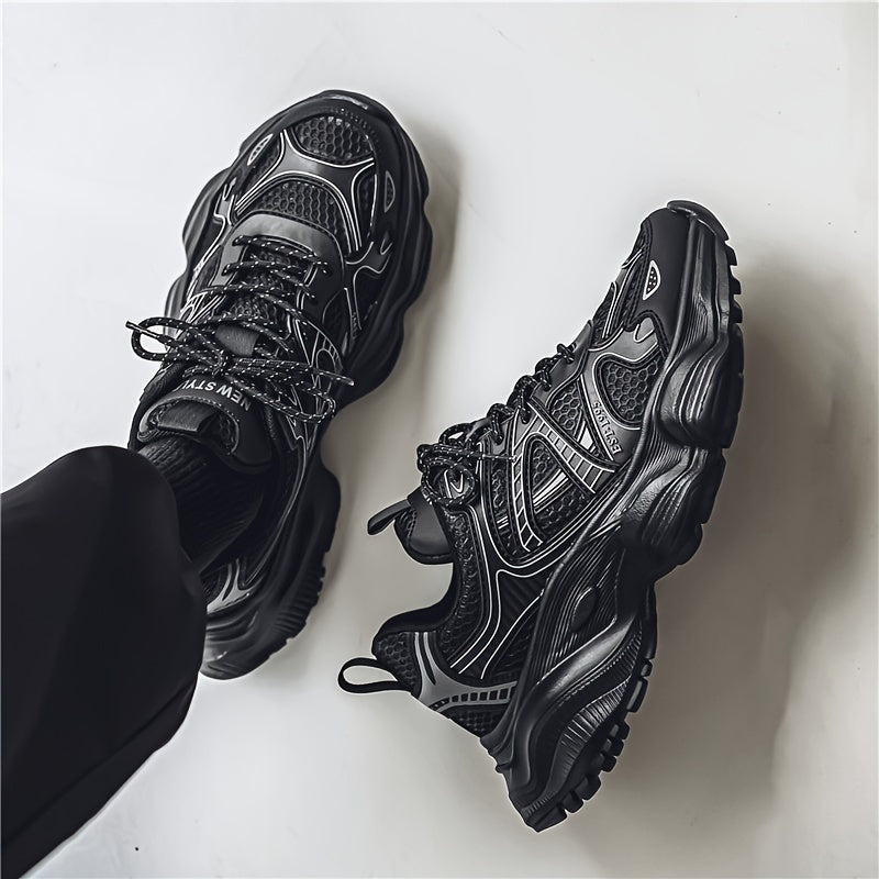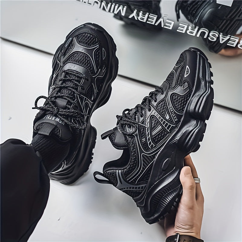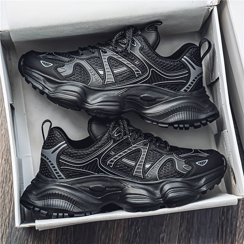Erkaklar uchun qora qalin krossovkalar, nafas oladigan to'r, mustahkam TPU taglik, tasodifiy va sport kiyimlari uchun zarbani yutuvchi EVA ichki taglik.