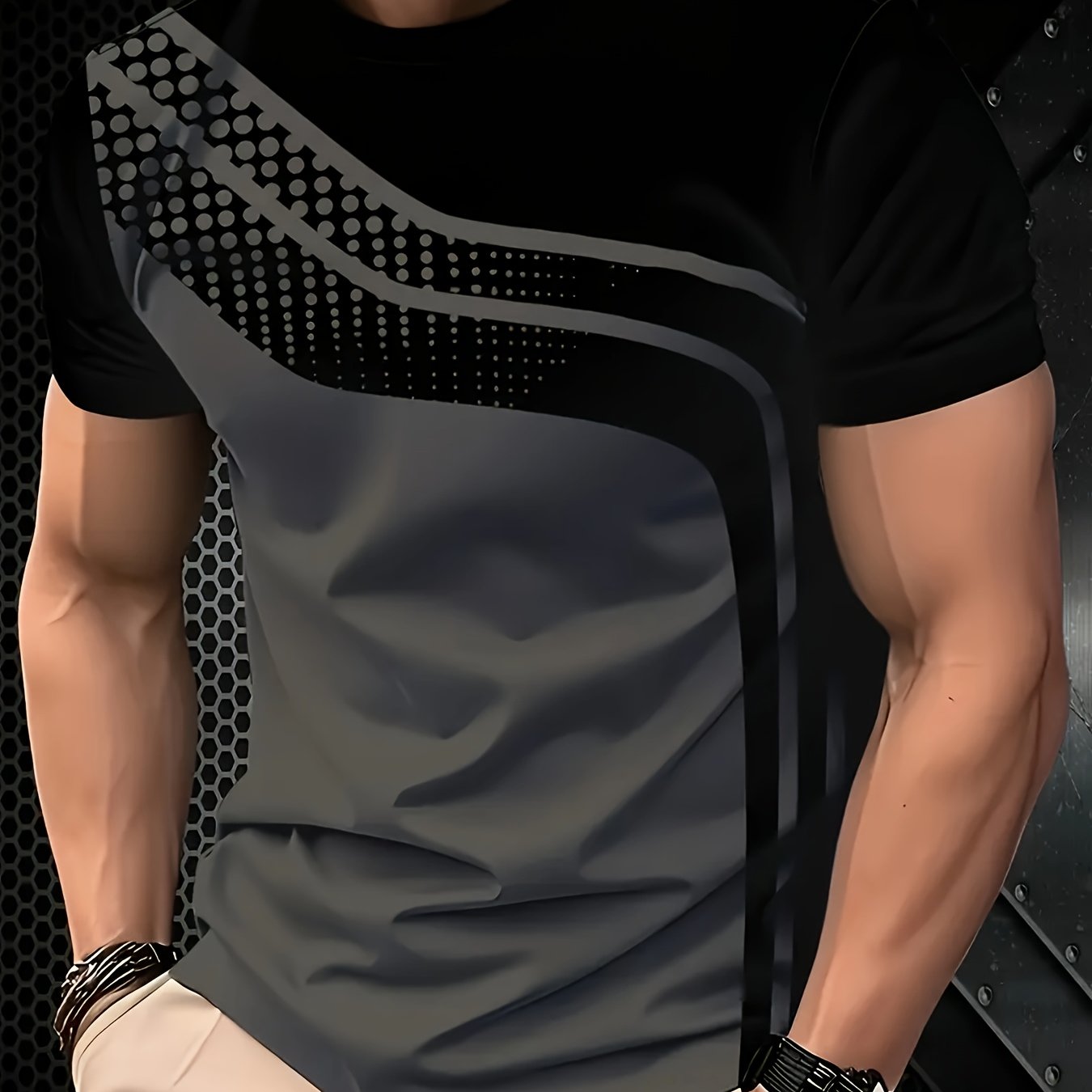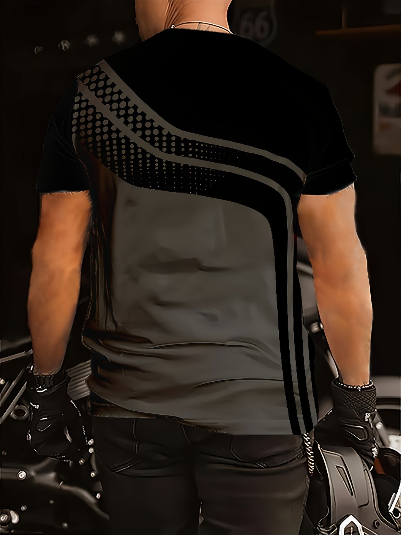 Erkaklar uchun qora va kulrang chiziqli 3D bosma futbolka - yumaloq bo'yin, qisqa yeng, yozgi tasodifiy kiyim, polyester aralashmasi, mashinada yuvish mumkin, zamonaviy gradient dizayni