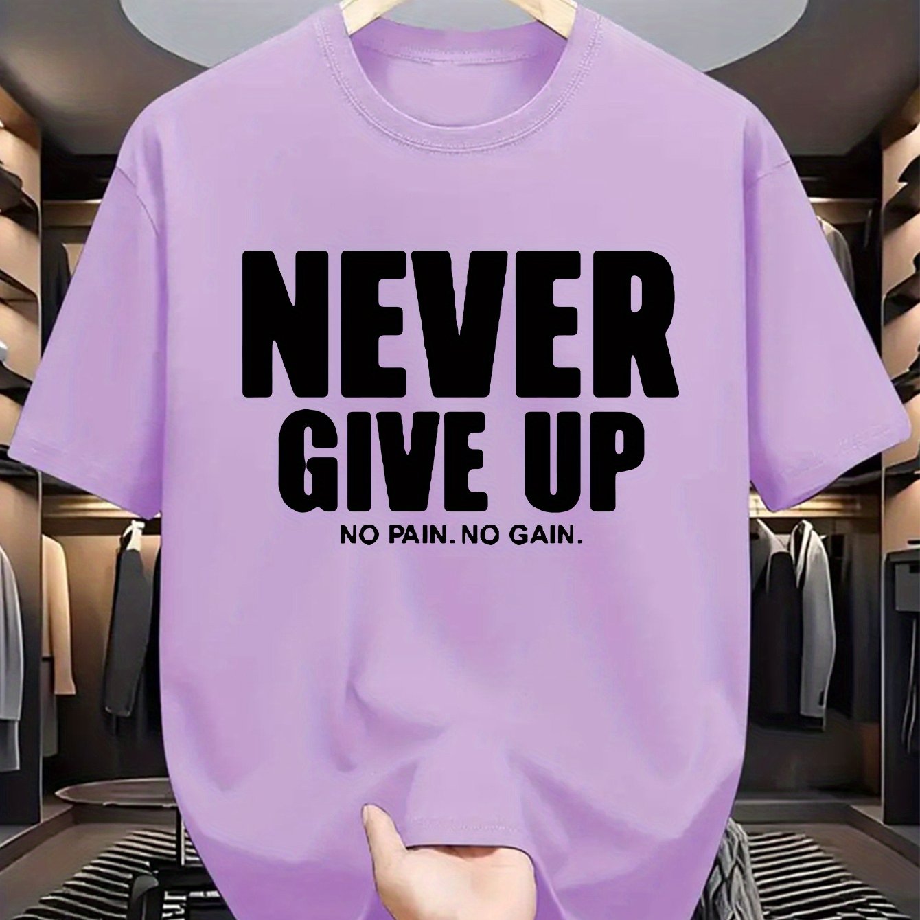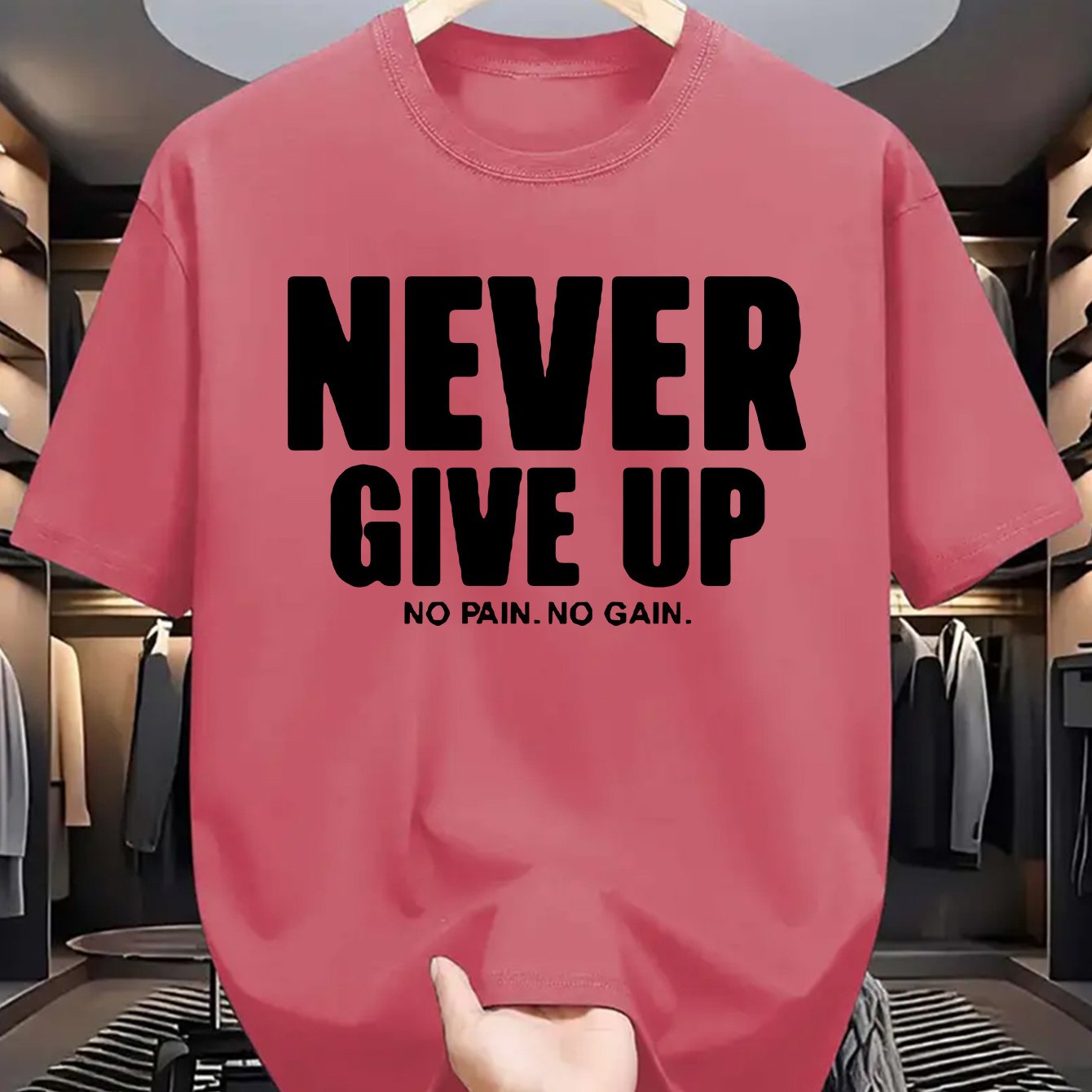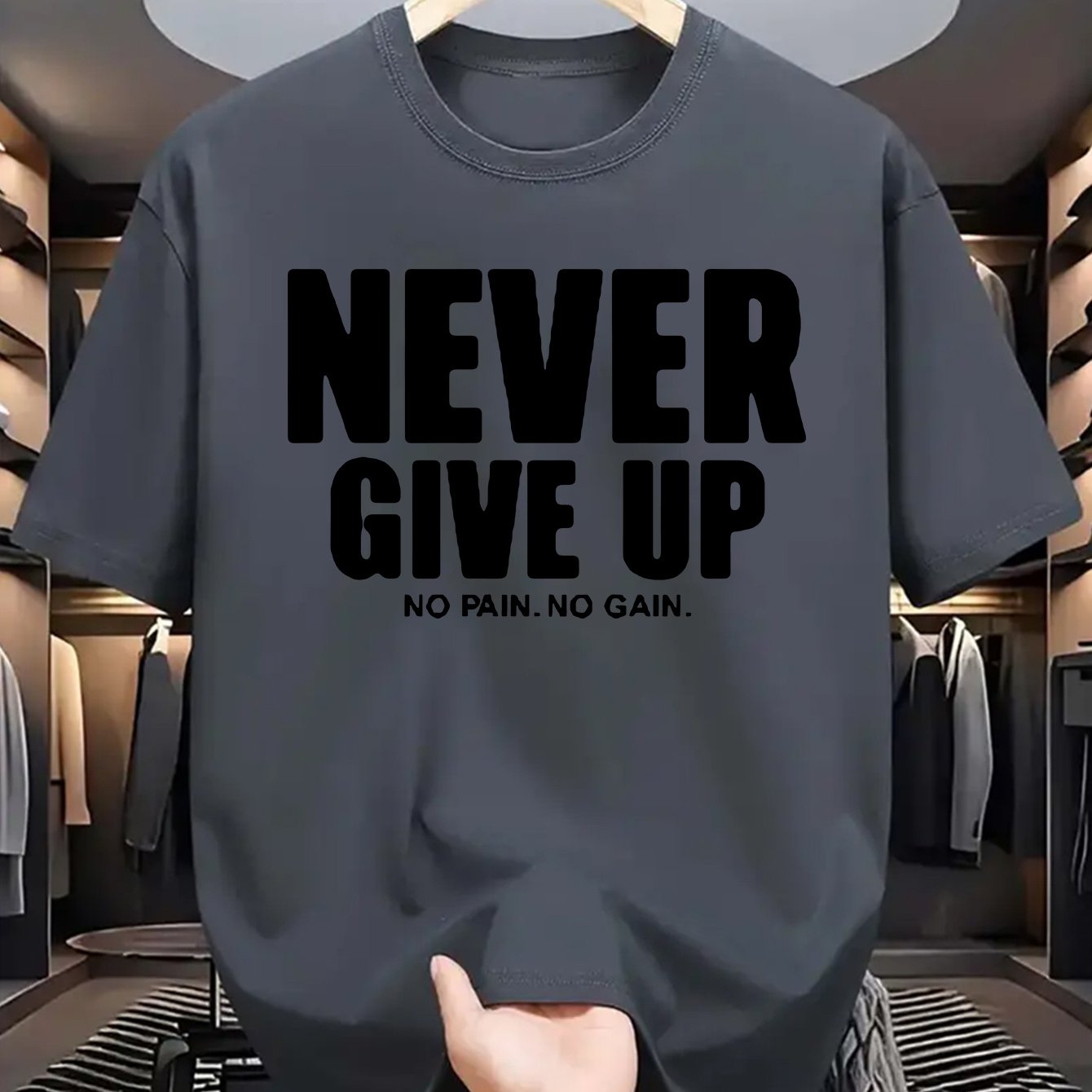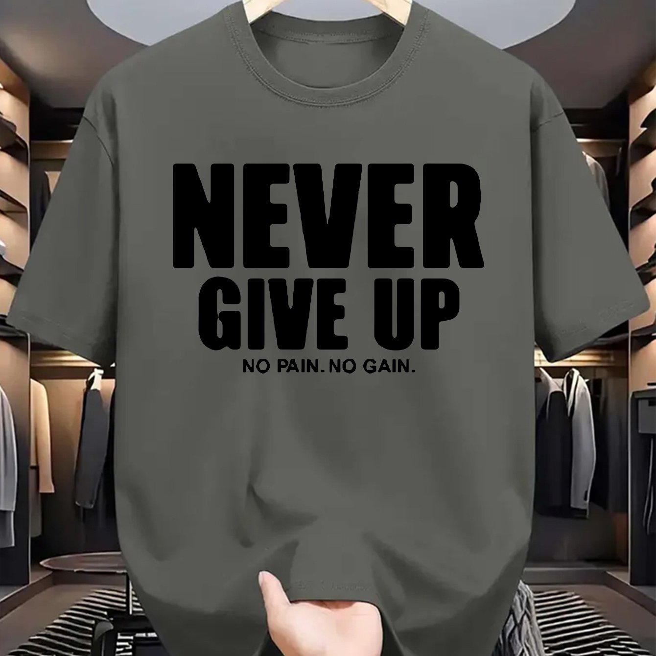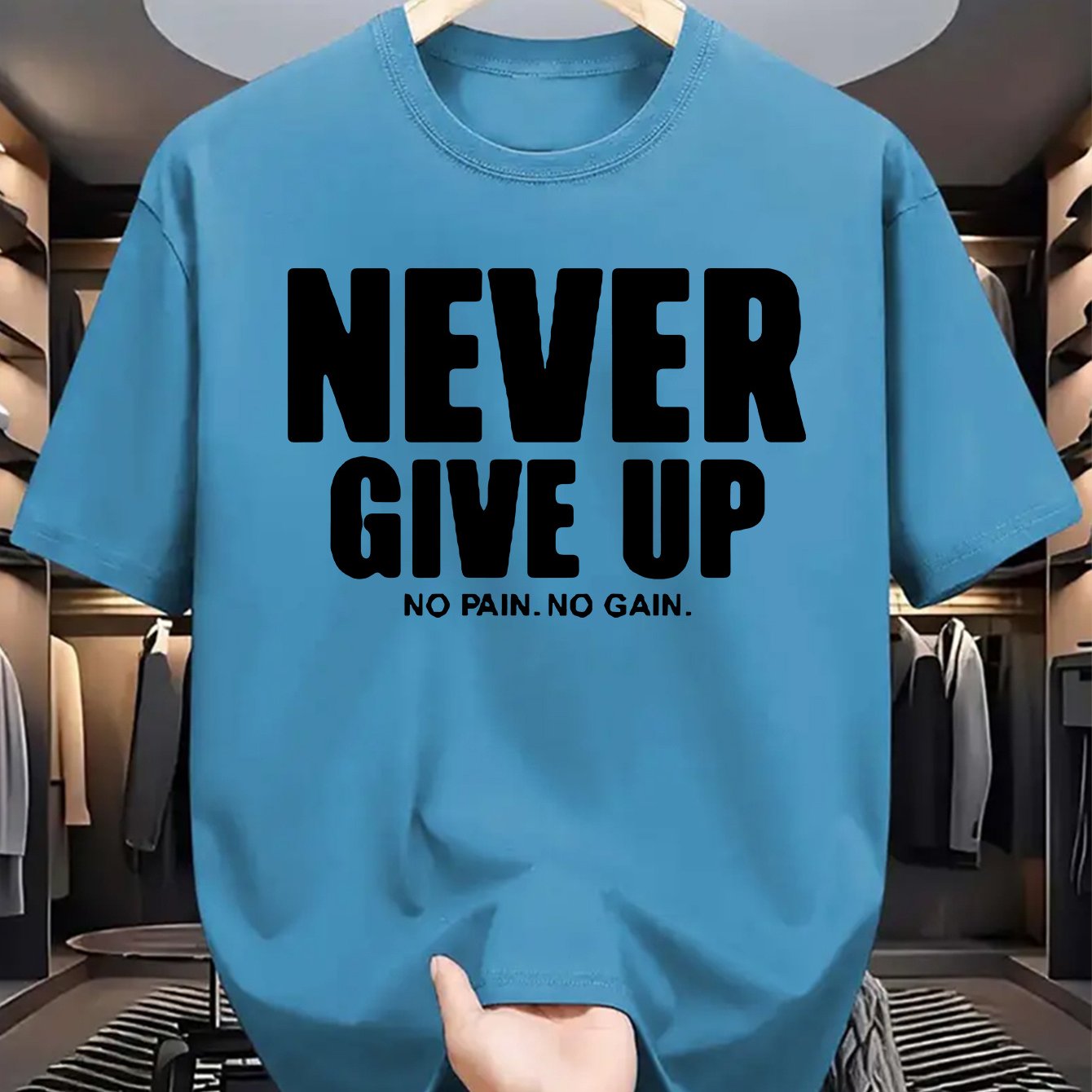 Erkaklar uchun tasodifiy krujka bo'yinli futbolka, "Hech qachon taslim bo'lma" yozuvi bilan, polyester to'qima matosidan tayyorlangan, ozgina cho'zilishi bilan odatdagi moslik uchun. Yozda qisqa yenglar bilan kundalik kiyish uchun mukammal.