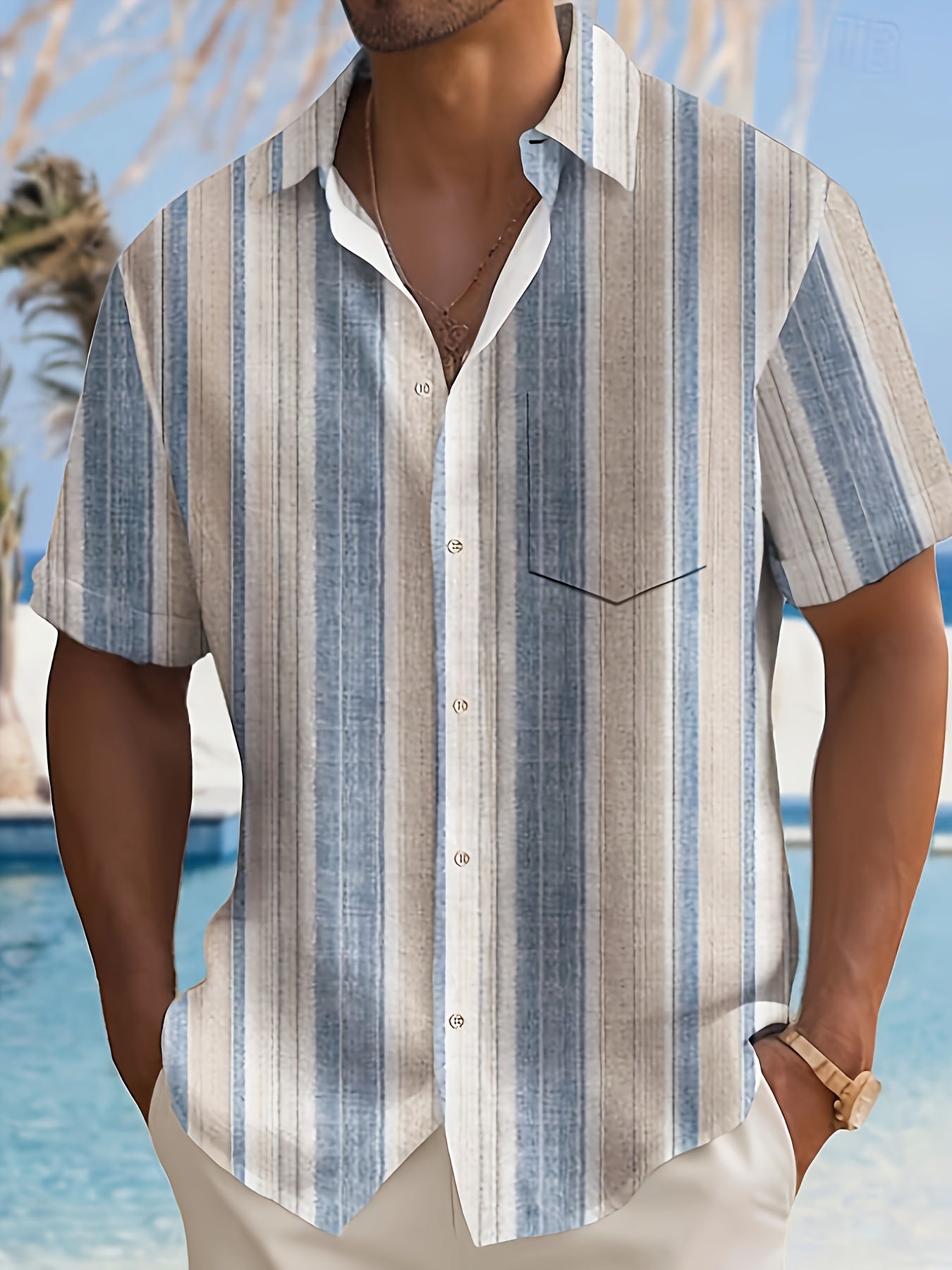 Erkaklar uchun tasodifiy chiziqli qisqa yengli ko'ylak 95% polyester va 5% spandeks aralashmasidan tayyorlangan, yozgi yengil yaka, to'qilgan mato, oddiy kesim va tugma tafsilotlari bilan, va mavjud bo'lgan