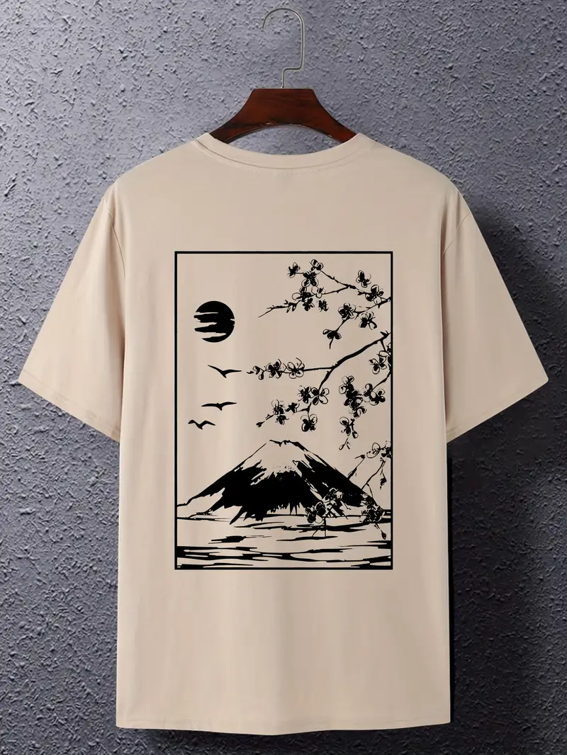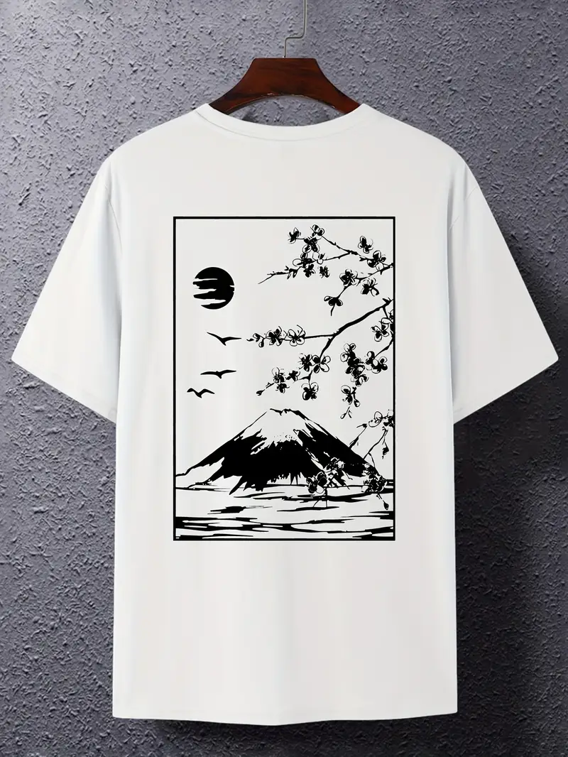 Erkaklar uchun tasodifiy futbolka, Fuji tog'i va yaponcha bosma bilan, nafas oladigan polyester aralashmasidan tayyorlangan, dumaloq bo'yin, mashinada yuvish mumkin, katta o'lcham.