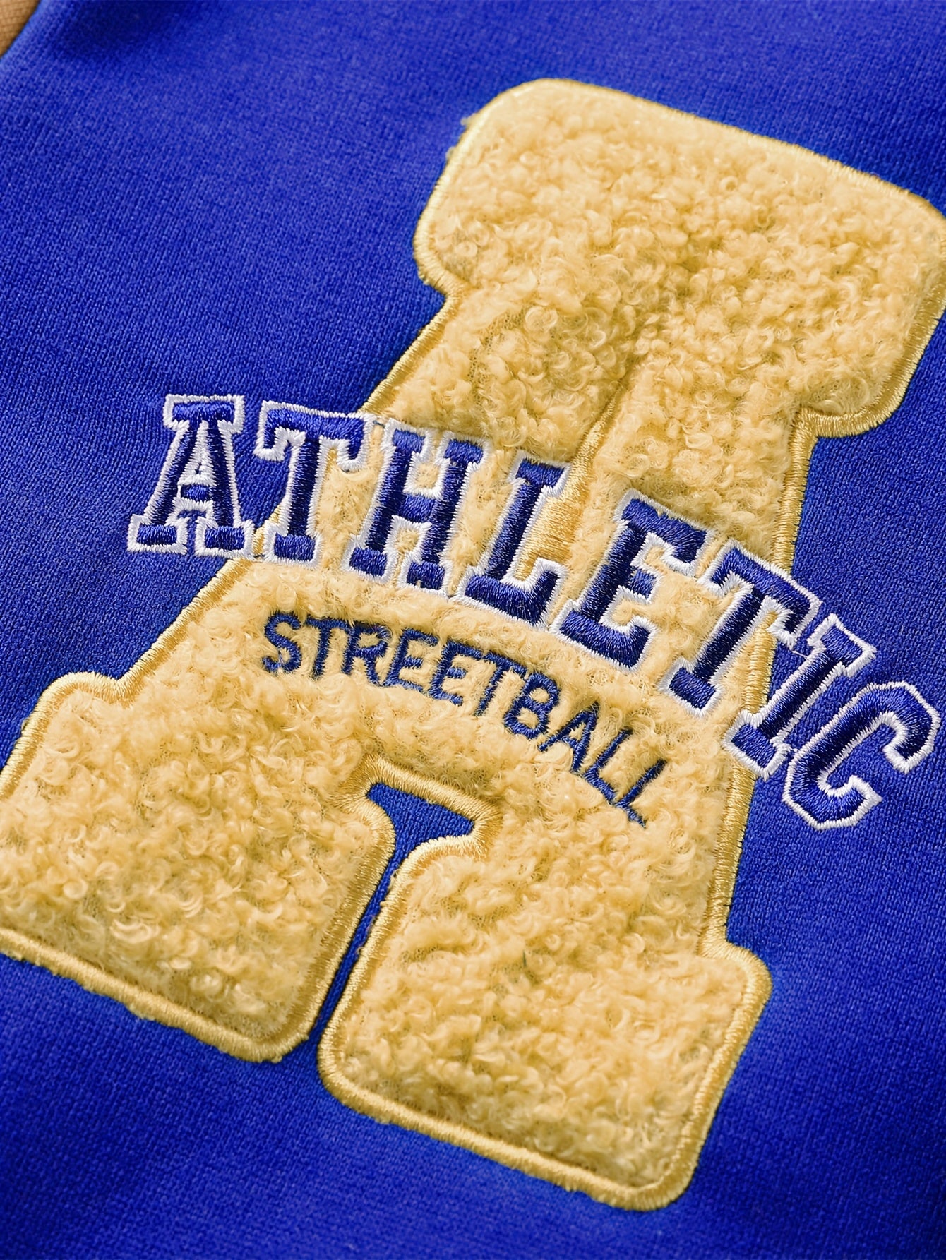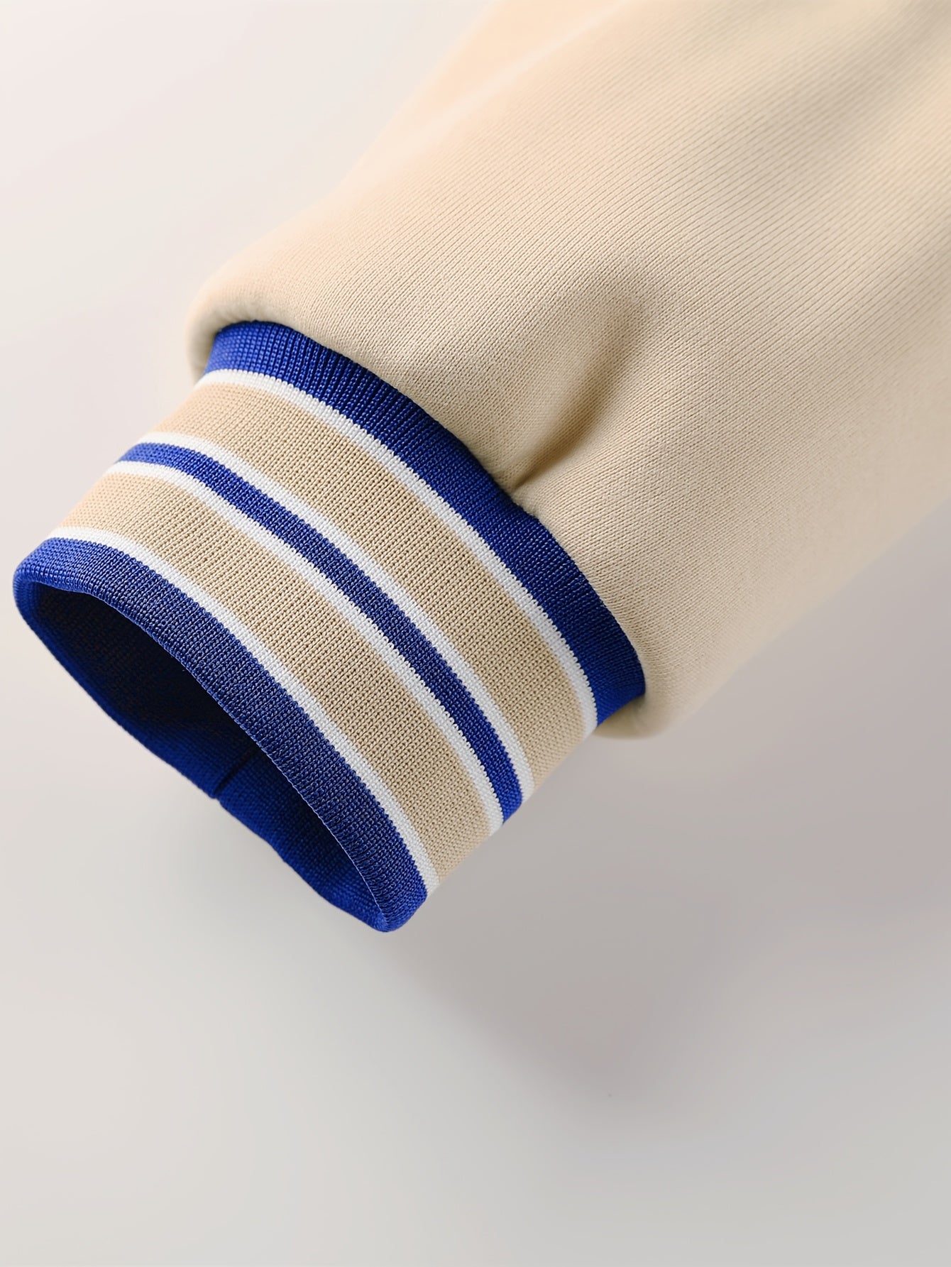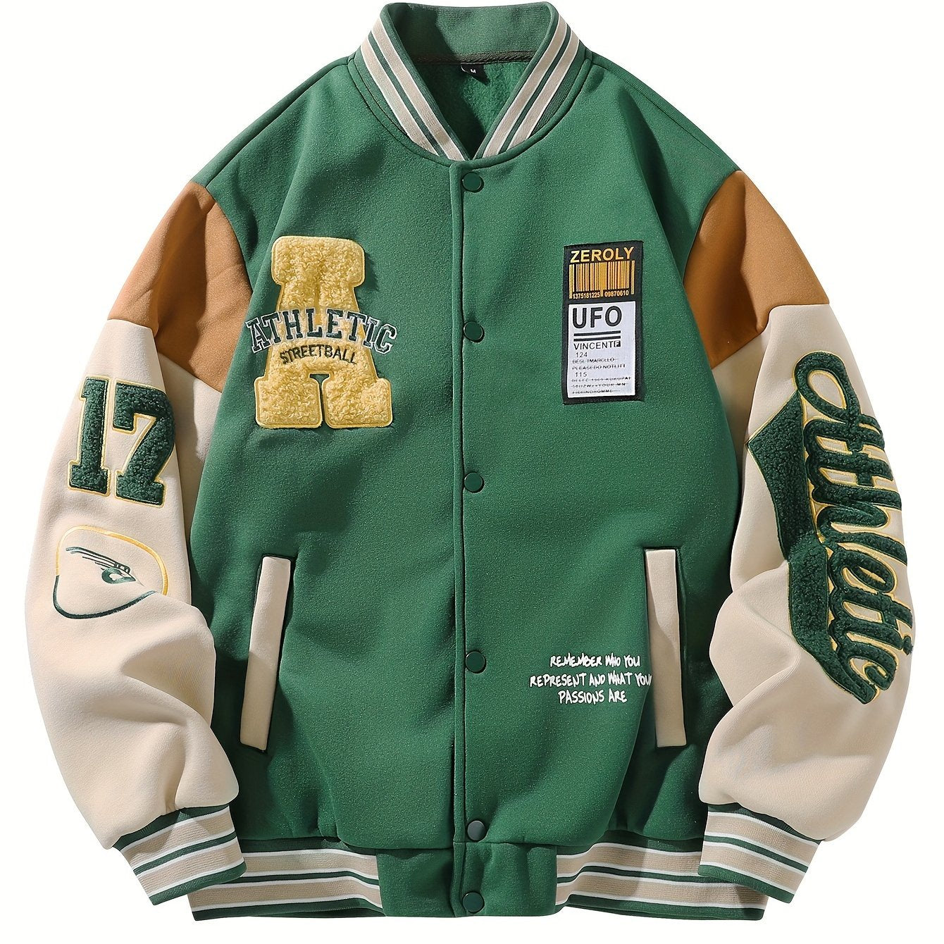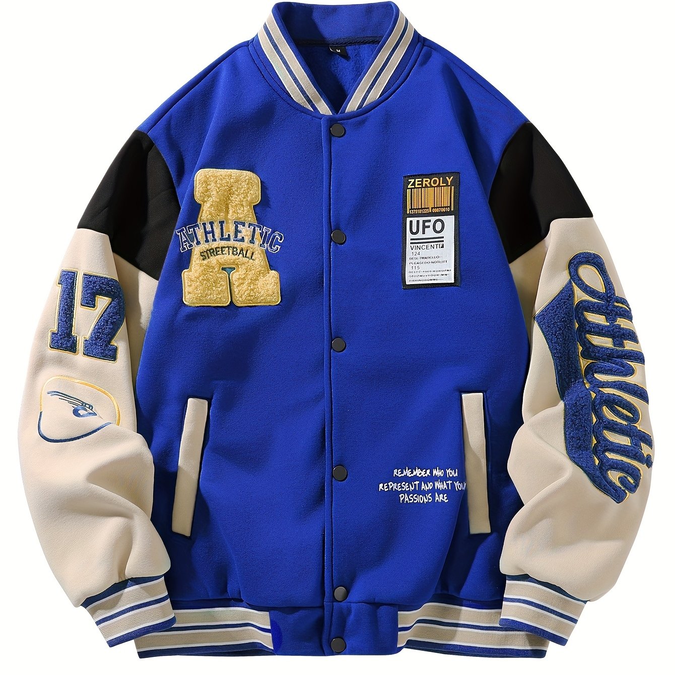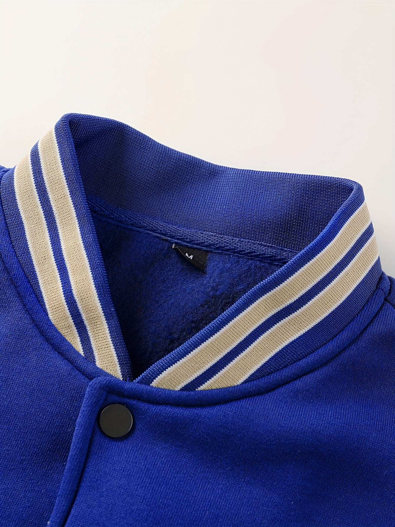 Erkaklar uchun tasodifiy universitet jeketi, harfli tikuv bilan, to'qilgan polyesterdan tayyorlangan va mashinada yuvish mumkin. Beysbol yelkasiga, uzun yenglarga ega va kuz va qish mavsumida kiyish uchun ideal.
