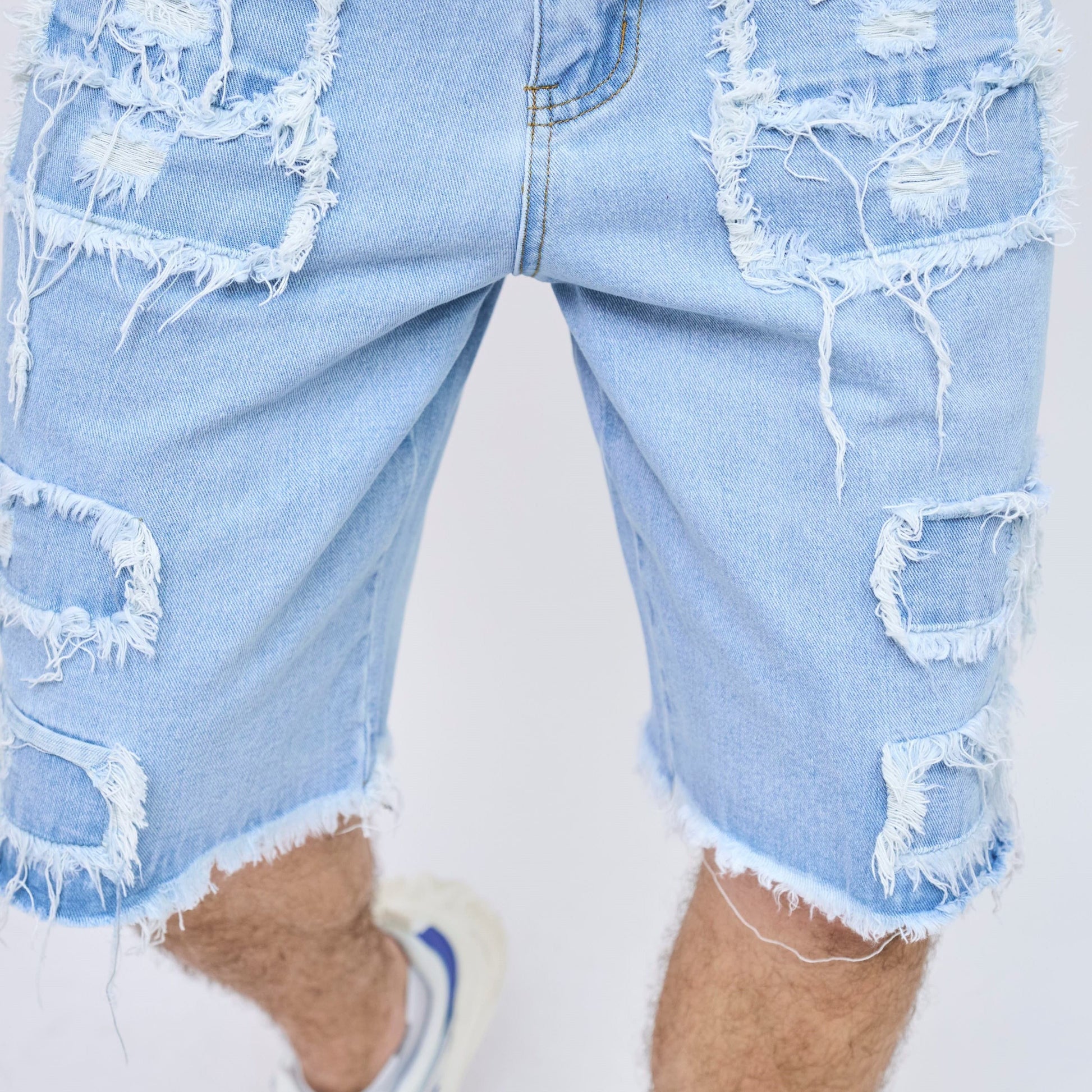 Erkaklar uchun ko'p cho'ntakli va yirtilgan qirralarga ega bo'lgan, plus o'lchamdagi paxta materialidan tayyorlangan, eskirgan denim shortlar.