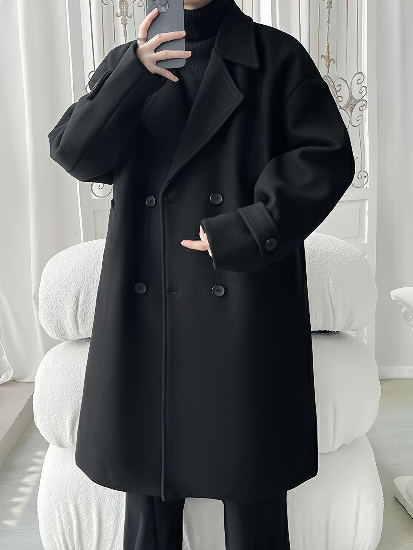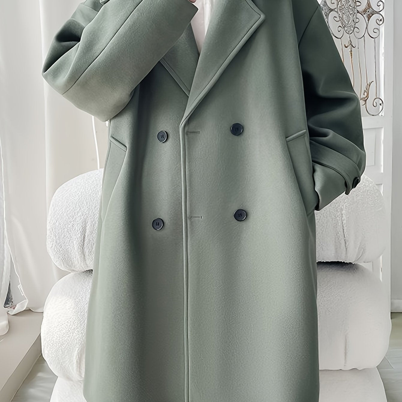 Erkaklar uchun nafis ikki qatorli palto - kuz va qish uchun oddiy rangdagi va ochiq yaka bilan tasodifiy uzun palto.
