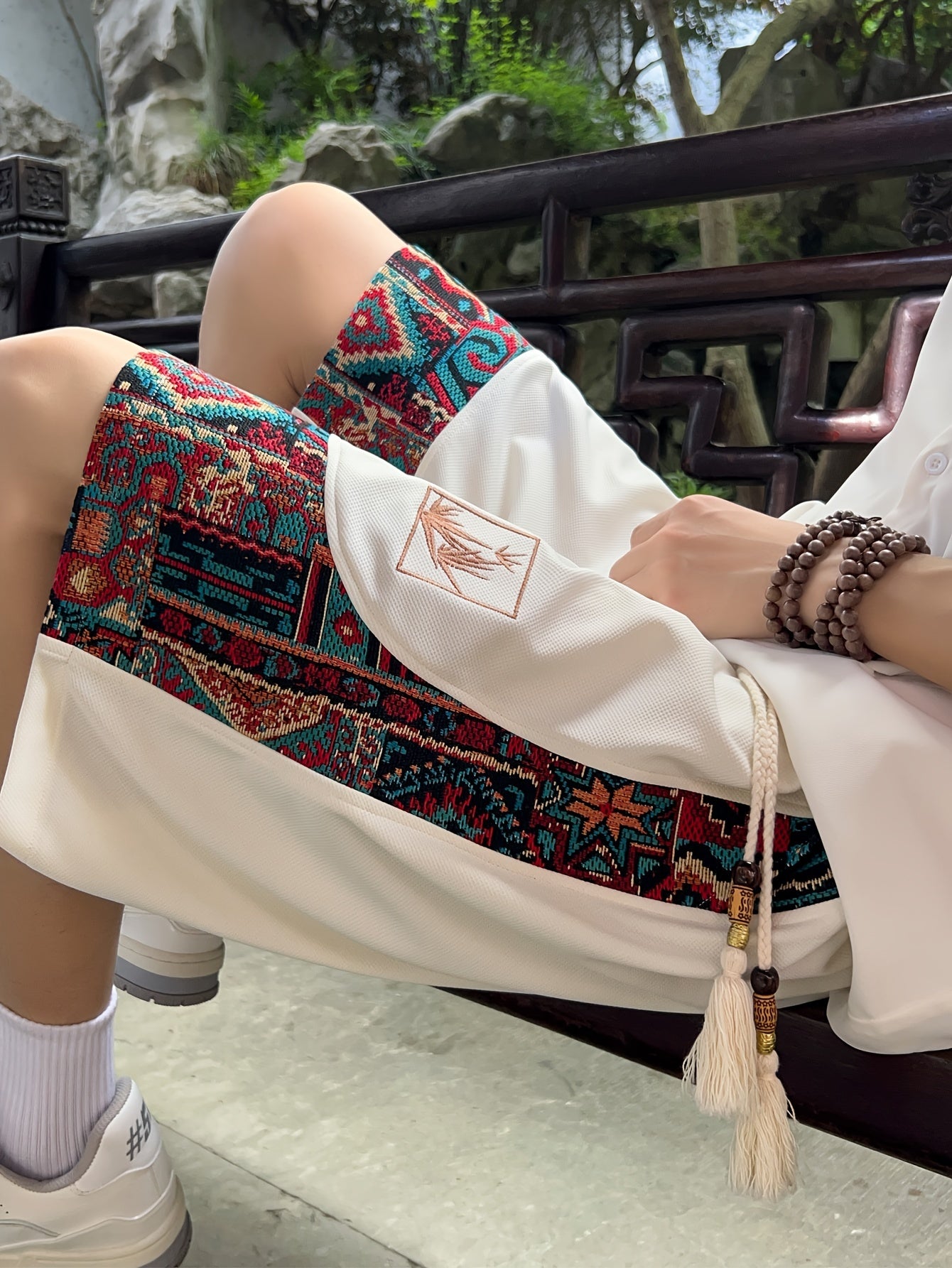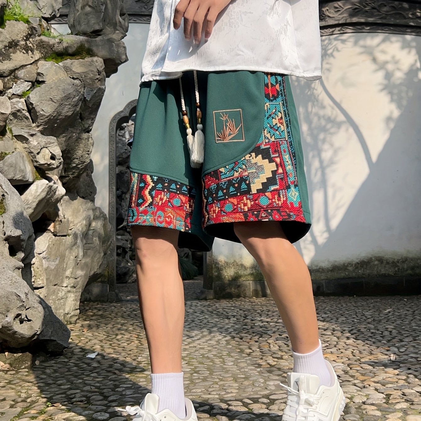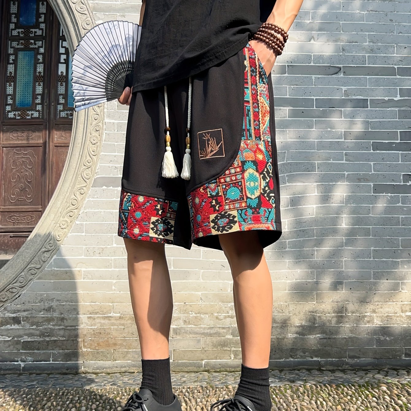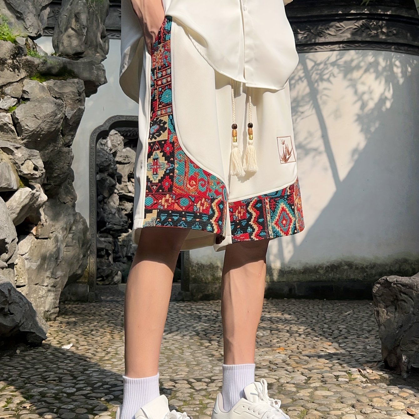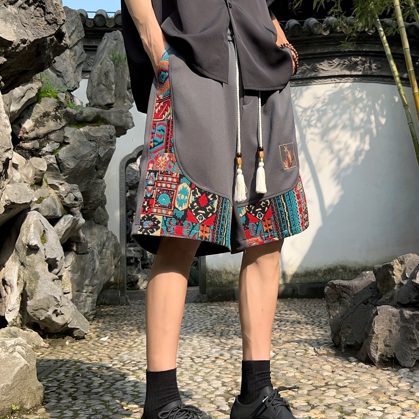Yoz uchun cho'ntakli erkaklar etnik tikuv naqshli shortilar