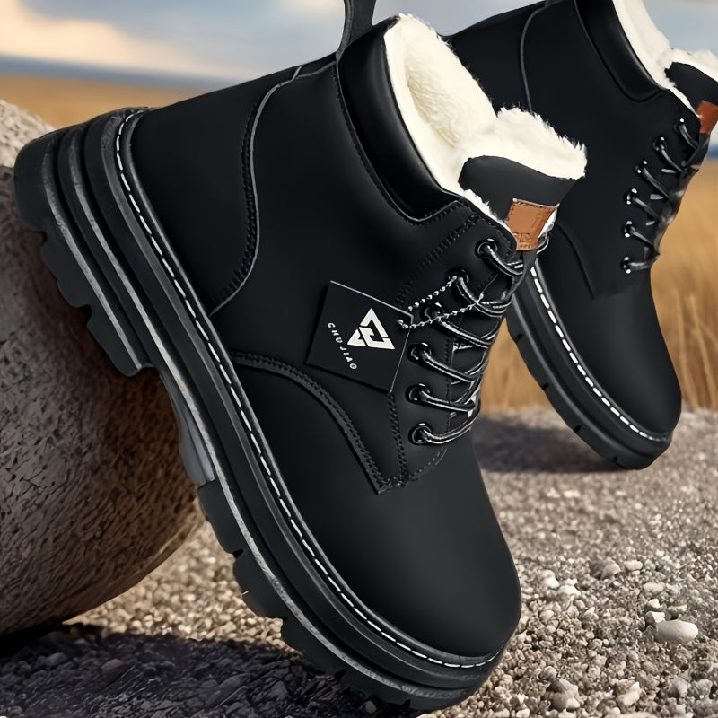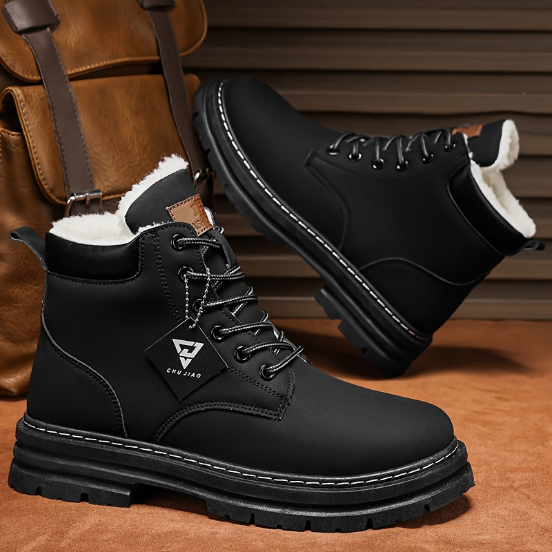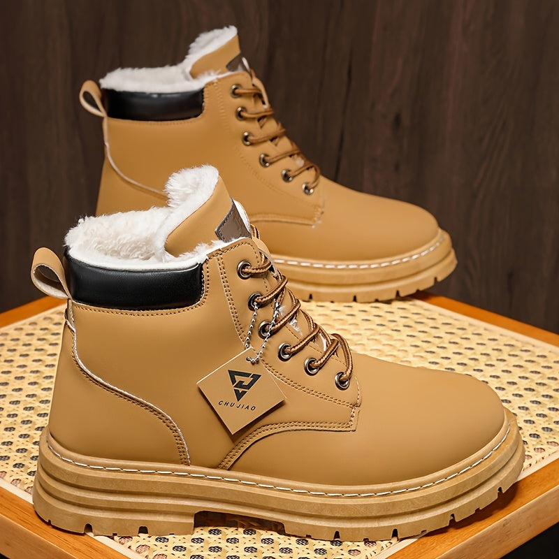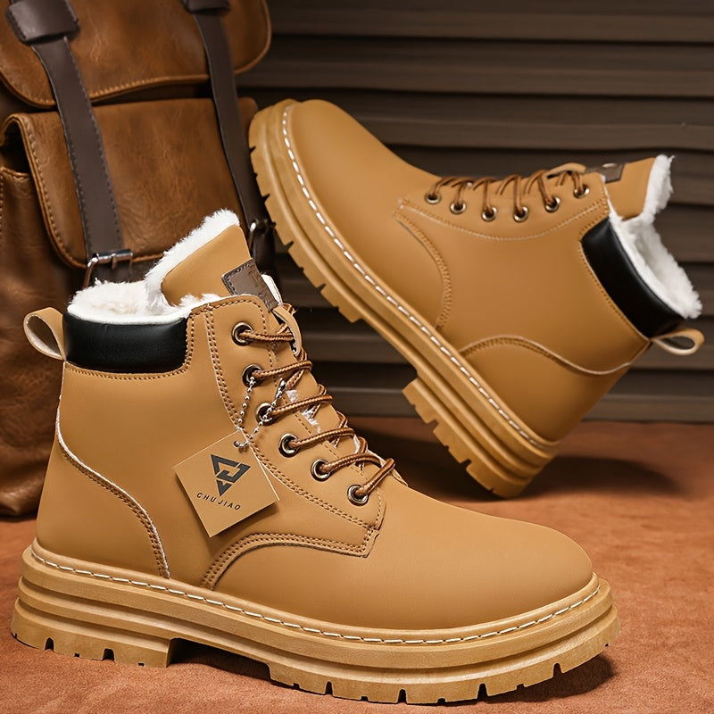 Erkaklar uchun yuqori bo'yli sayohat poyabzallari, ichki qismi to'quv, issiqlik izolyatsiyasi, mustahkam PU yuqori qismi, PVC taglik va doira barmoq dizayni bilan qishki ochiq havoda faoliyatlar uchun tasodifiy Britaniya uslubida. Sovuq ob-havo