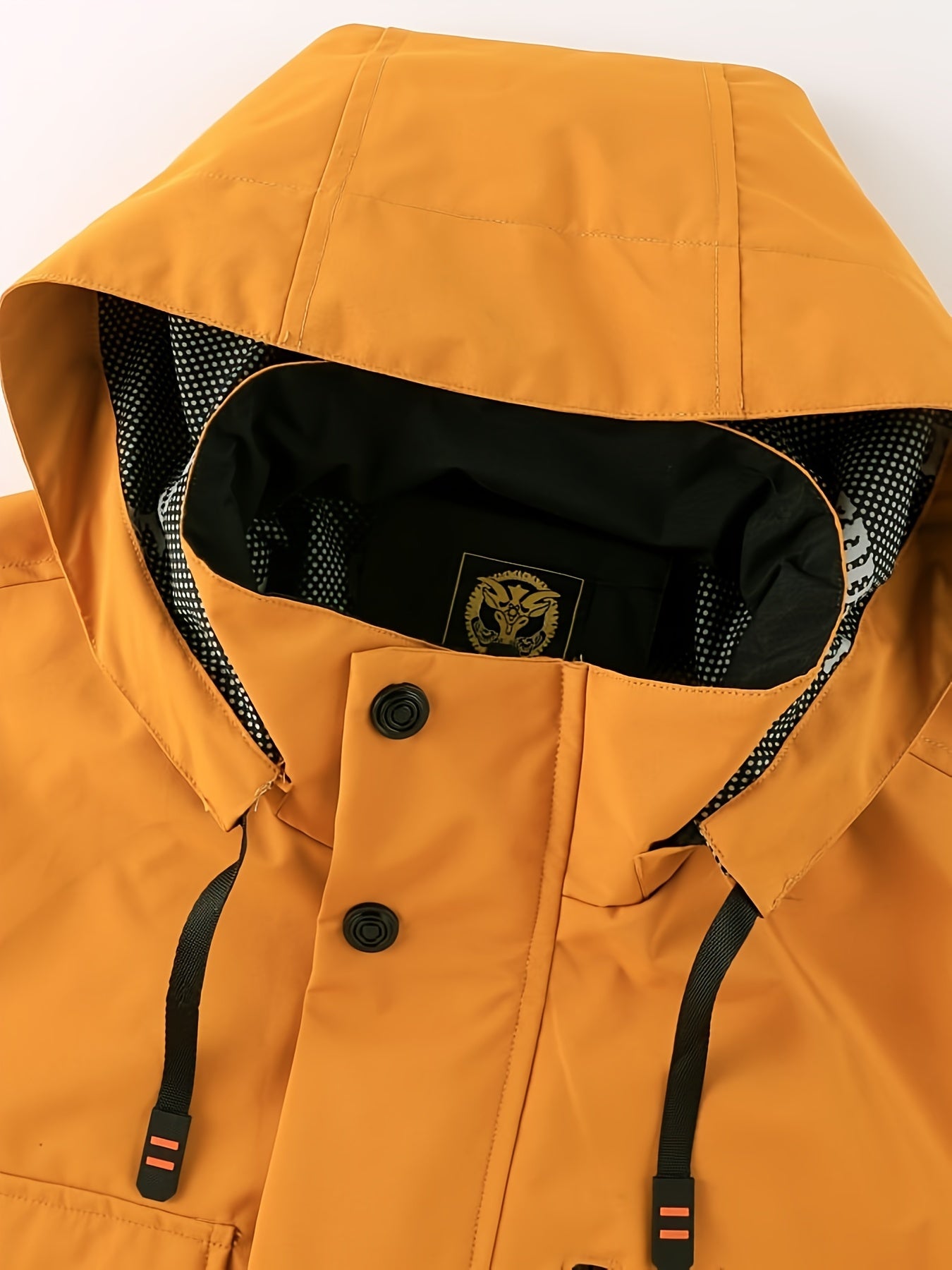 Erkaklar uchun engil shamol o'tkazmaydigan kurtka, suv o'tkazmaydigan va shamol o'tkazmaydigan, ajratiladigan kapyushon bilan, bahor va kuzda ochiq havoda faoliyatlar uchun mukammal.