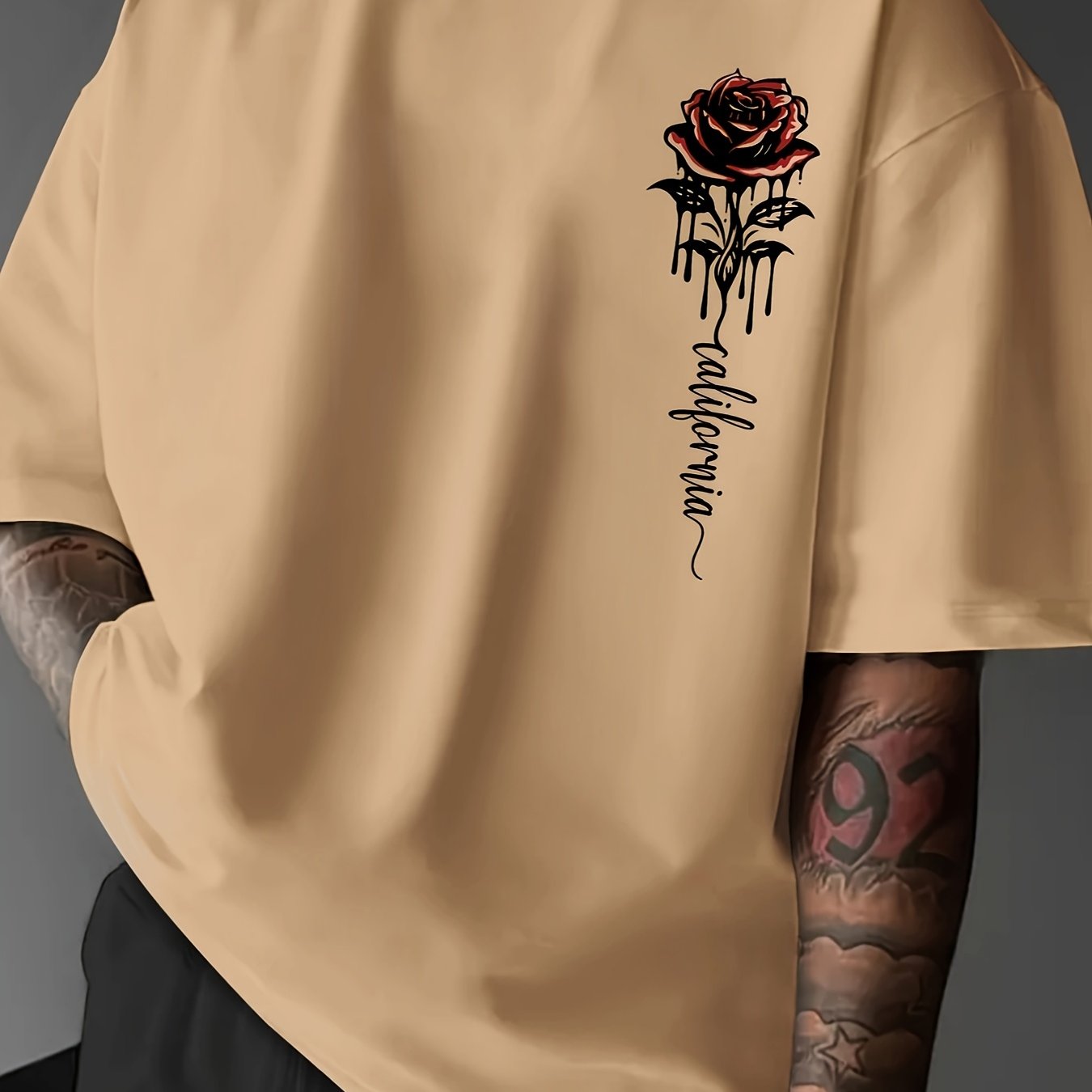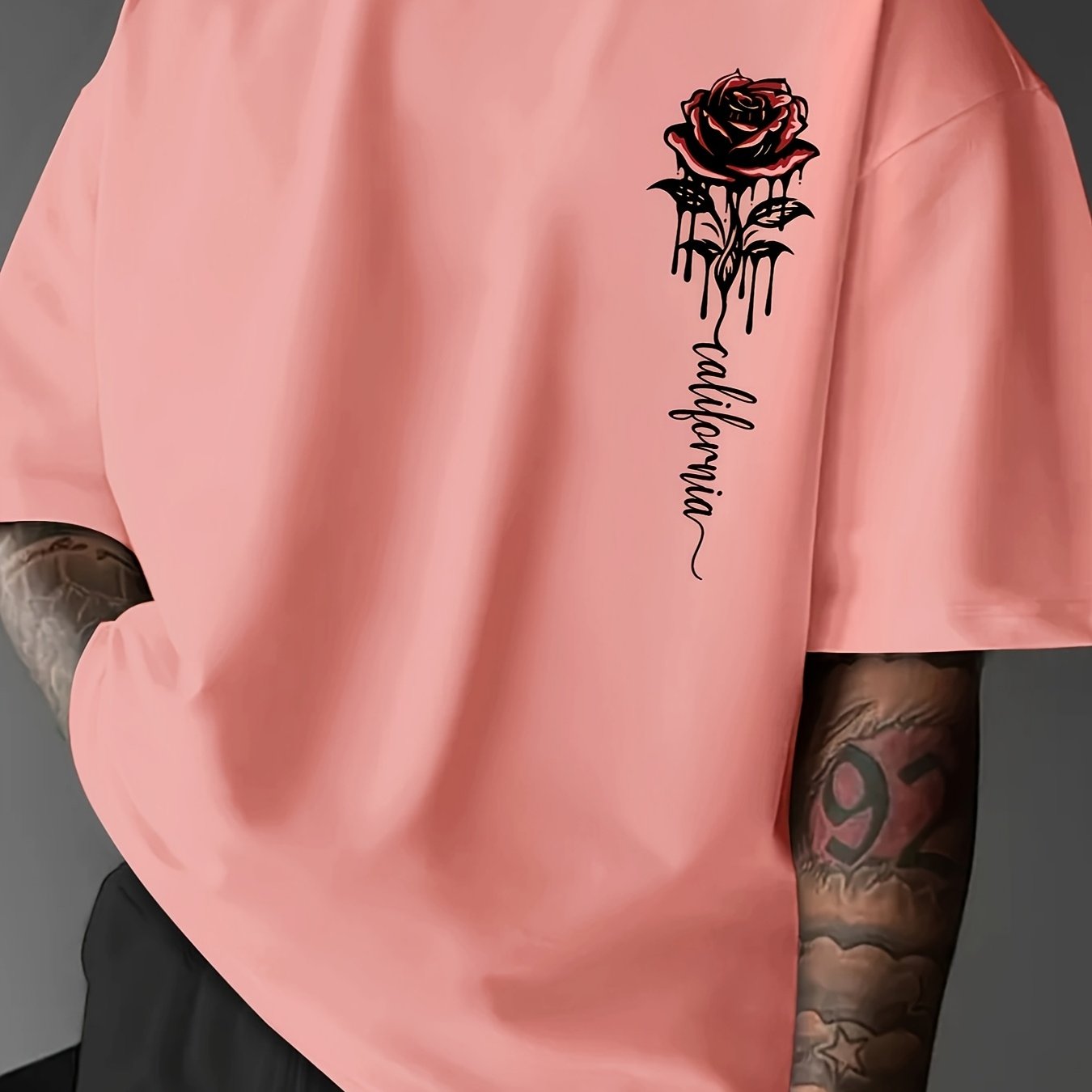 Yozgi tasodifiy kiyim uchun mukammal, atirgul bosma bilan polyester aralashmasidan tayyorlangan erkaklar uchun keng kesimli krujka yoqasi T-ko'ylagi.