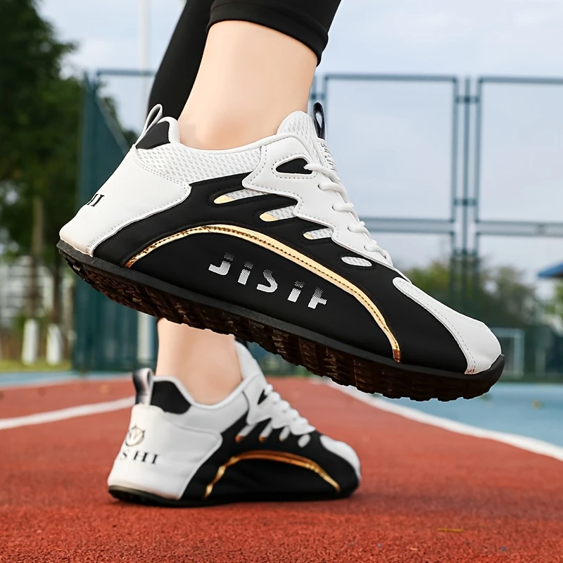 Erkaklar uchun pastki qismi ochiq sport poyabzallari, bog'ichli dizayn, bir xil rangdagi PU yuqori qismi, mato astar va TPU taglik.